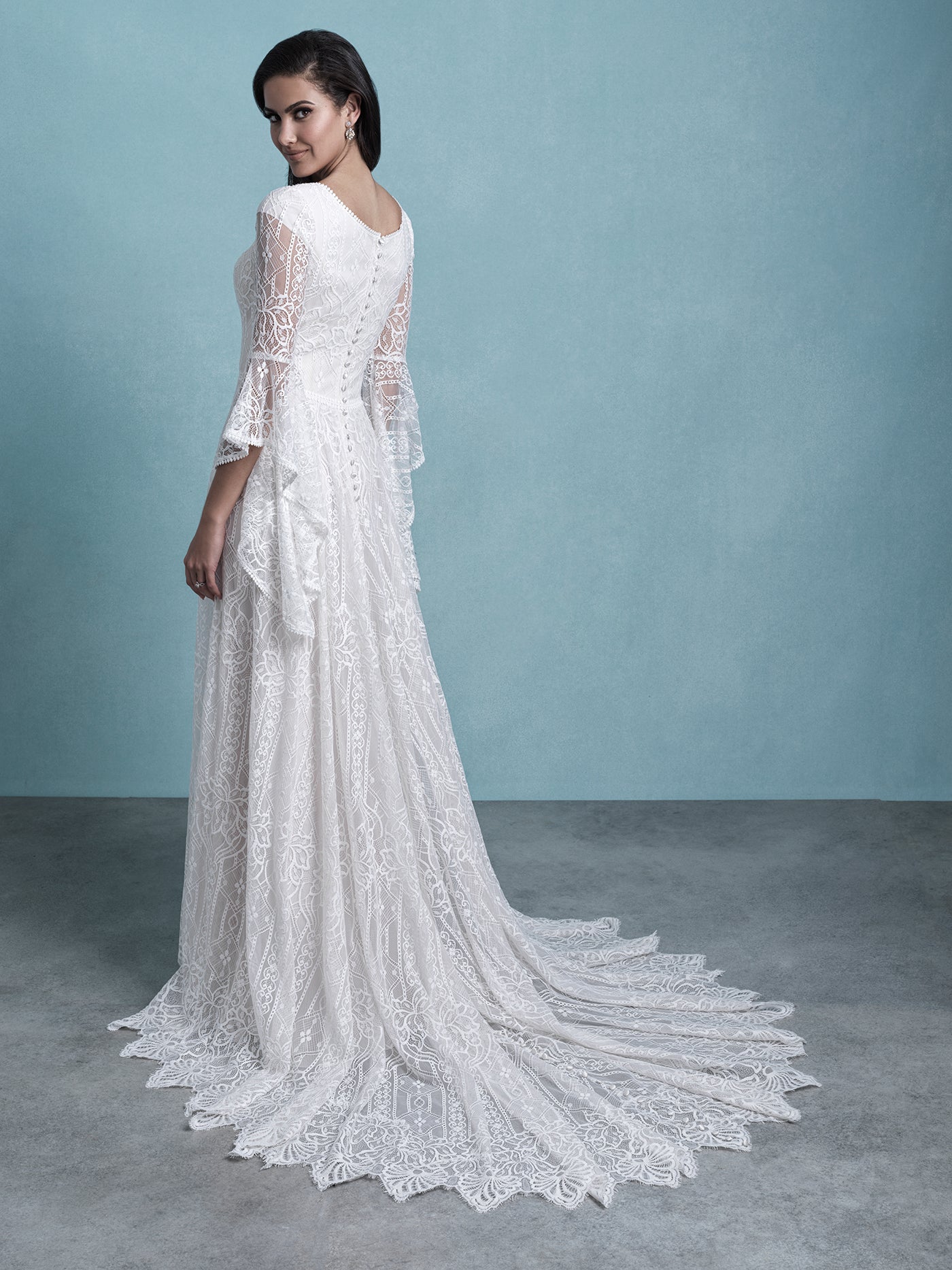 Classic brides and bohemian beauties alike will fall in love with this lace gown.