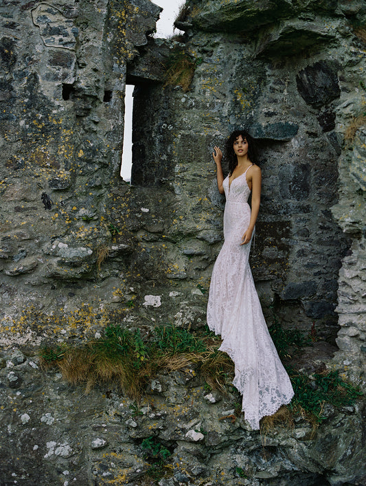 Delicate and understated, Ophelia is a sheath gown cut from all over sheet lace for a soft, textural finish. A sweetheart neckline and slender spaghetti straps frame the bodice, while a low V-back adds just the right amount of allure. It’s a quietly romantic silhouette for the bride drawn to subtle detail and natural ease.