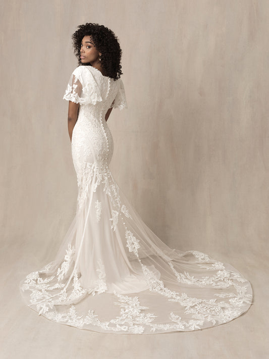 Graceful and grounded, Josephine features a high illusion neckline and all over sheet lace in a slim sheath silhouette. A natural waistline creates gentle definition, while the scalloped lace hem adds a romantic finish with just a hint of vintage charm. It's an effortlessly refined look for the bride who values quiet detail over drama.