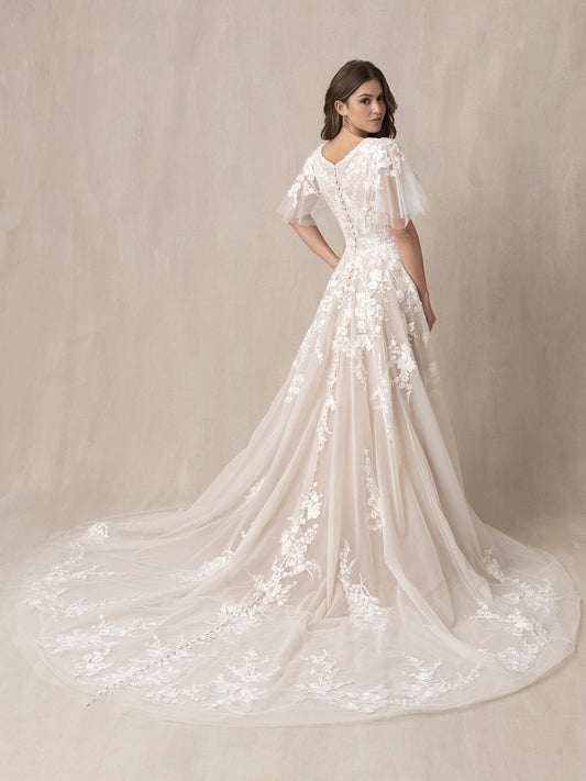 Light and flowing, Eyre is a chiffon A-line gown designed with soft movement and an effortless feel. Dimensional appliques trace the neckline and detachable off-the-shoulder sleeves, offering texture with the option to transform the look. A ruched bodice adds gentle structure through the waist, creating a silhouette that feels both easy and refined. Pictured with neck scarf, CP70, sold separately.