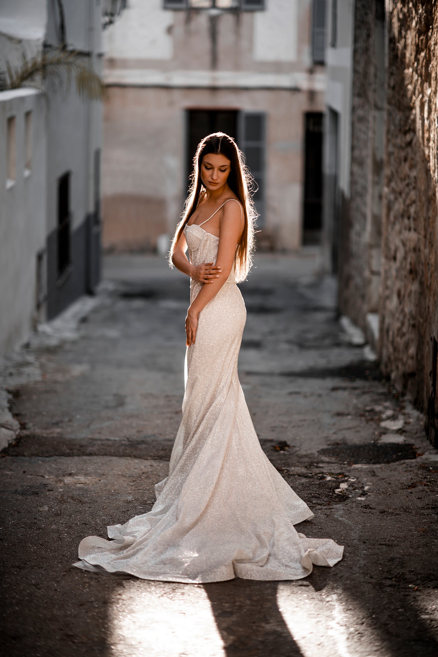 Designed to turn every head, Karina is head to toe diamond sparkle tulle, with chic exposed boning along the bodice. A detachable overskirt softens the glitter to a shimmer. This Abella E174 gown is also available with detachable train E174T sold separately. Shop both gown and train when you search for your local Abella retailer today. Read Less