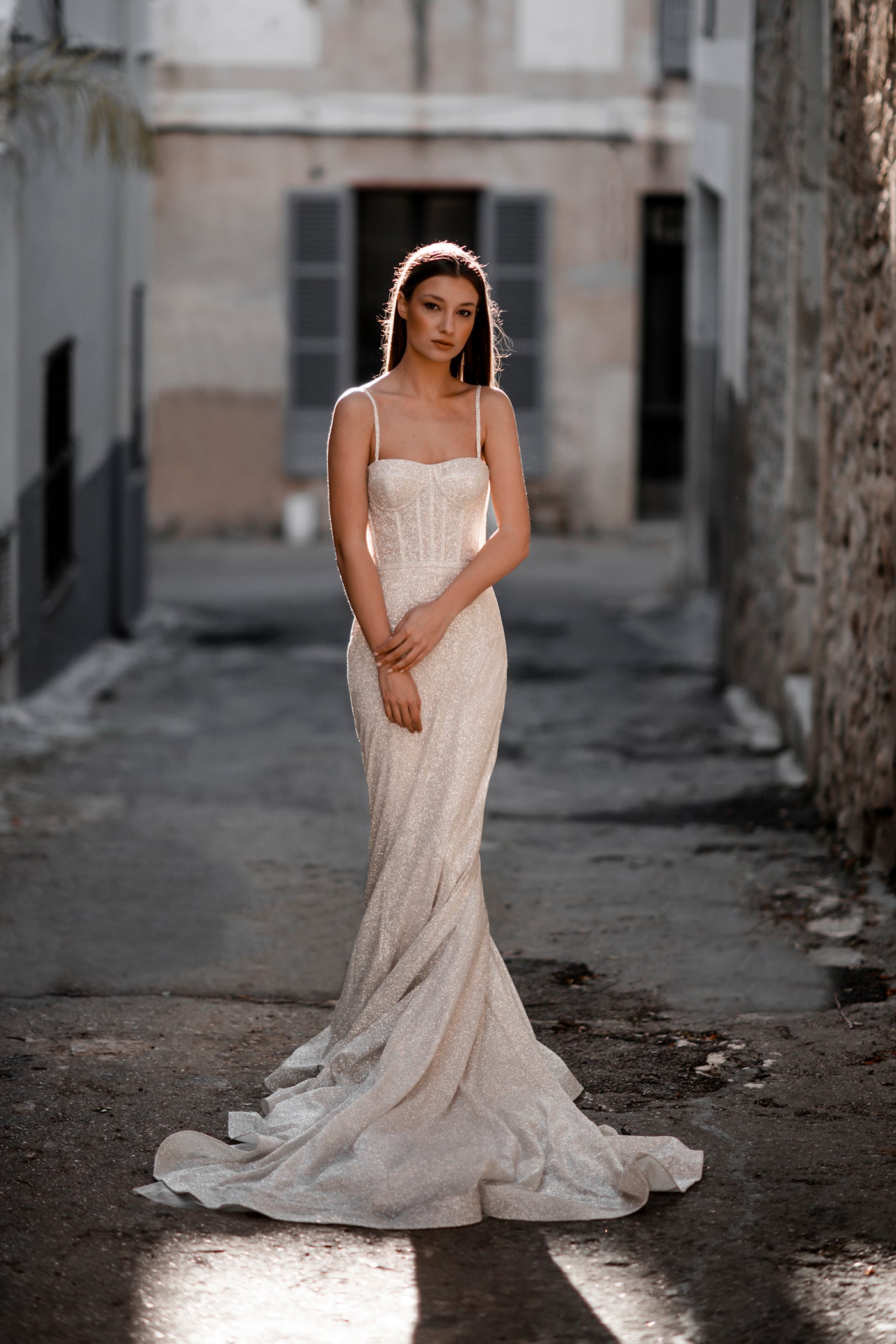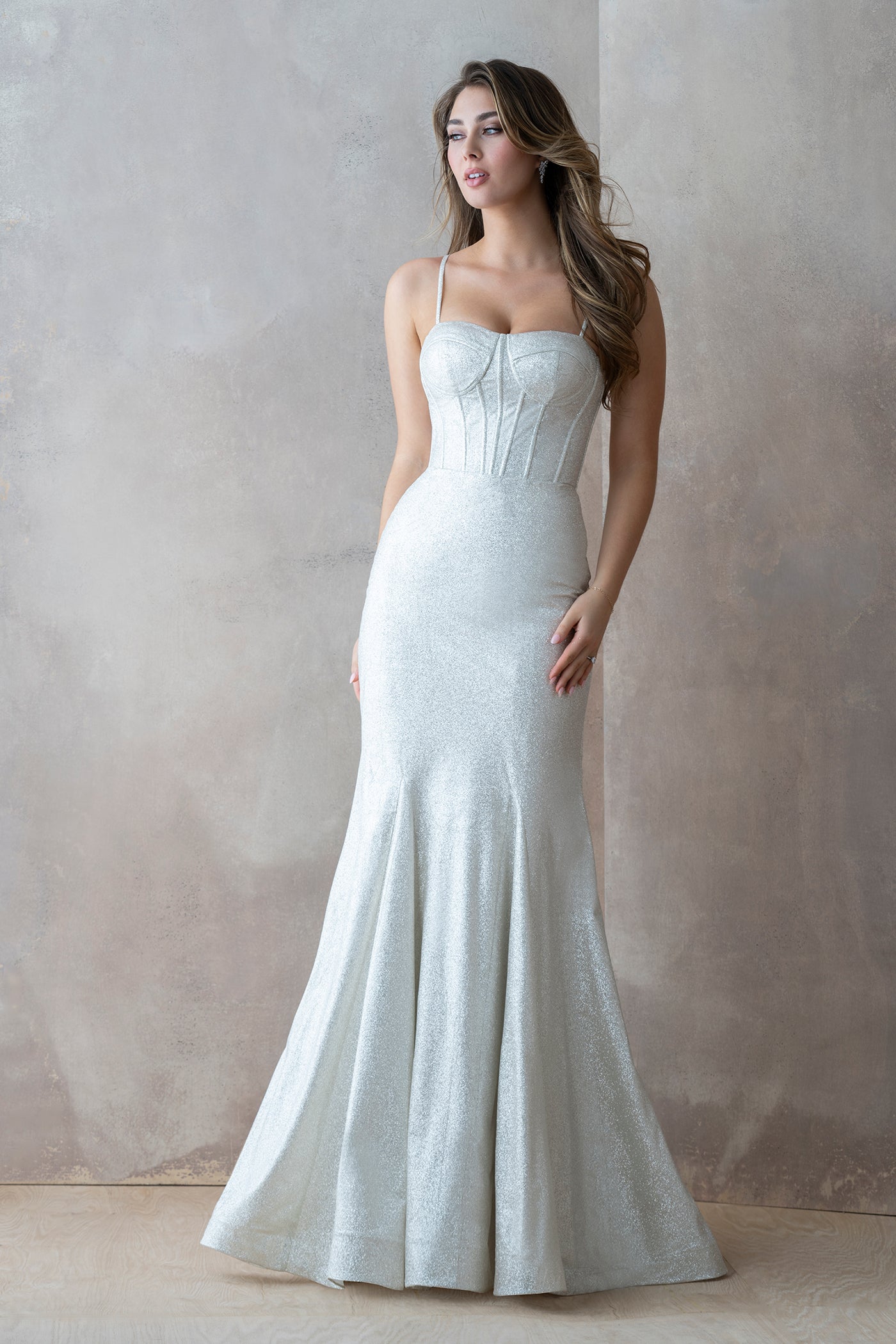 Designed to turn every head, Karina is head to toe diamond sparkle tulle, with chic exposed boning along the bodice. A detachable overskirt softens the glitter to a shimmer. This Abella E174 gown is also available with detachable train E174T sold separately. Shop both gown and train whe... Read More