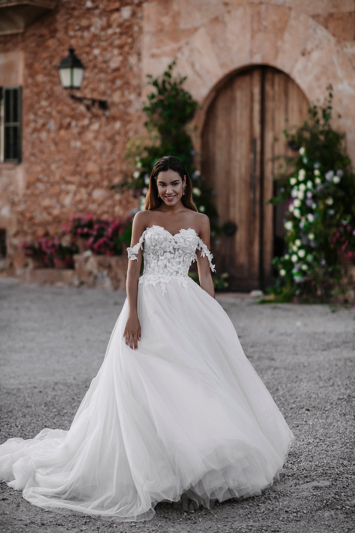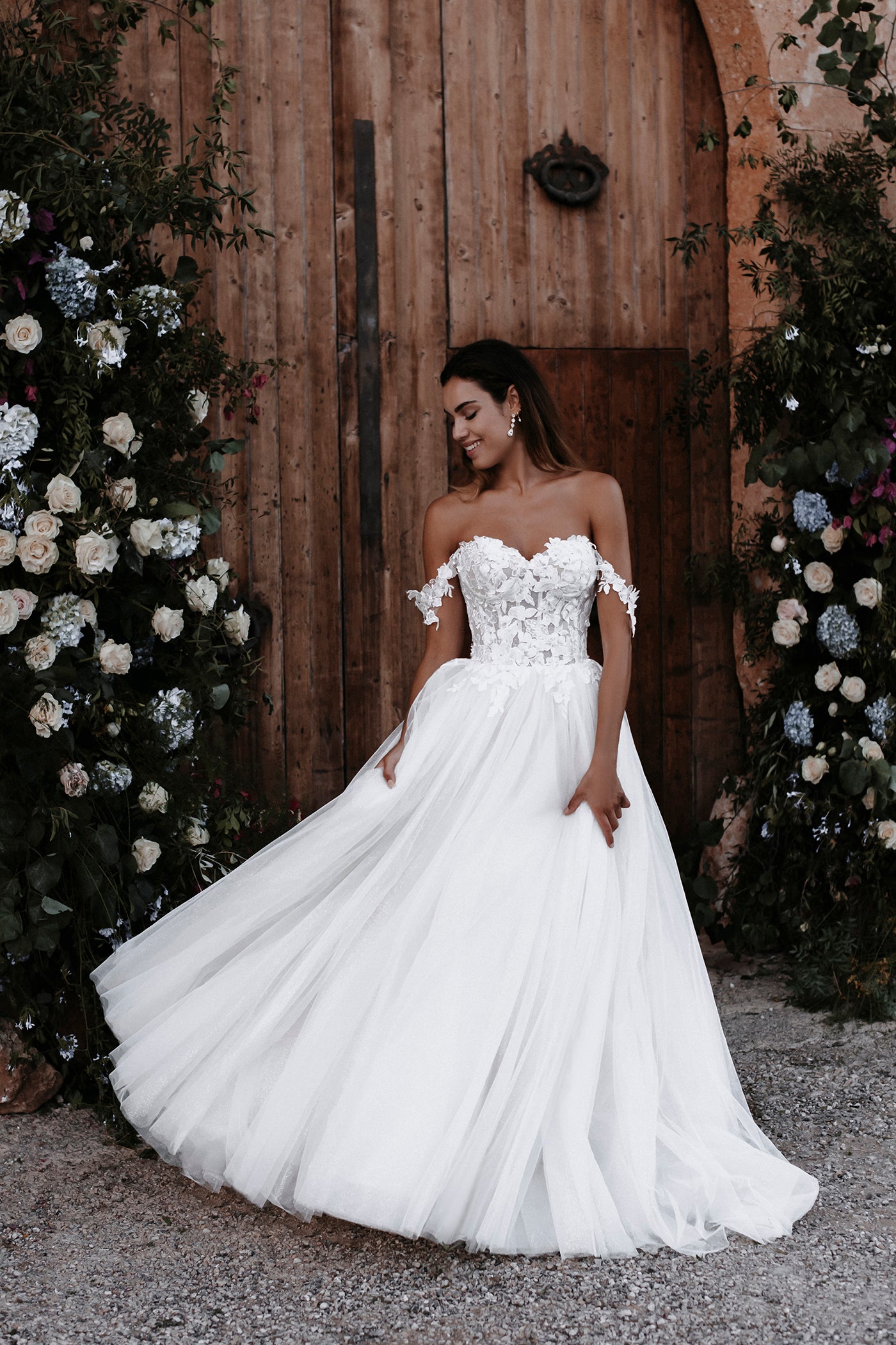 Coquettish Caprice pairs ethereal layers of tulle with a textured off-shoulder floral bodice.