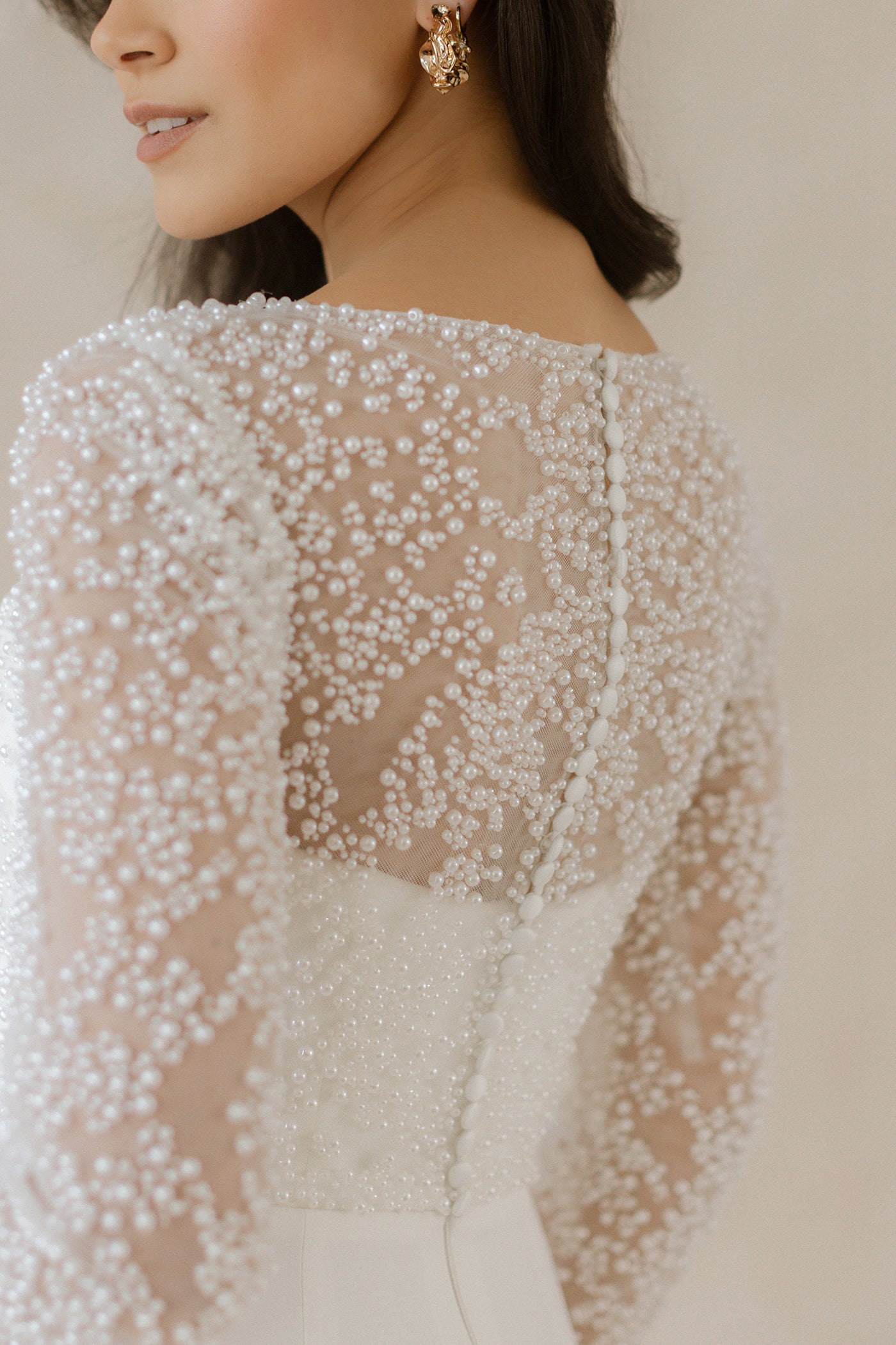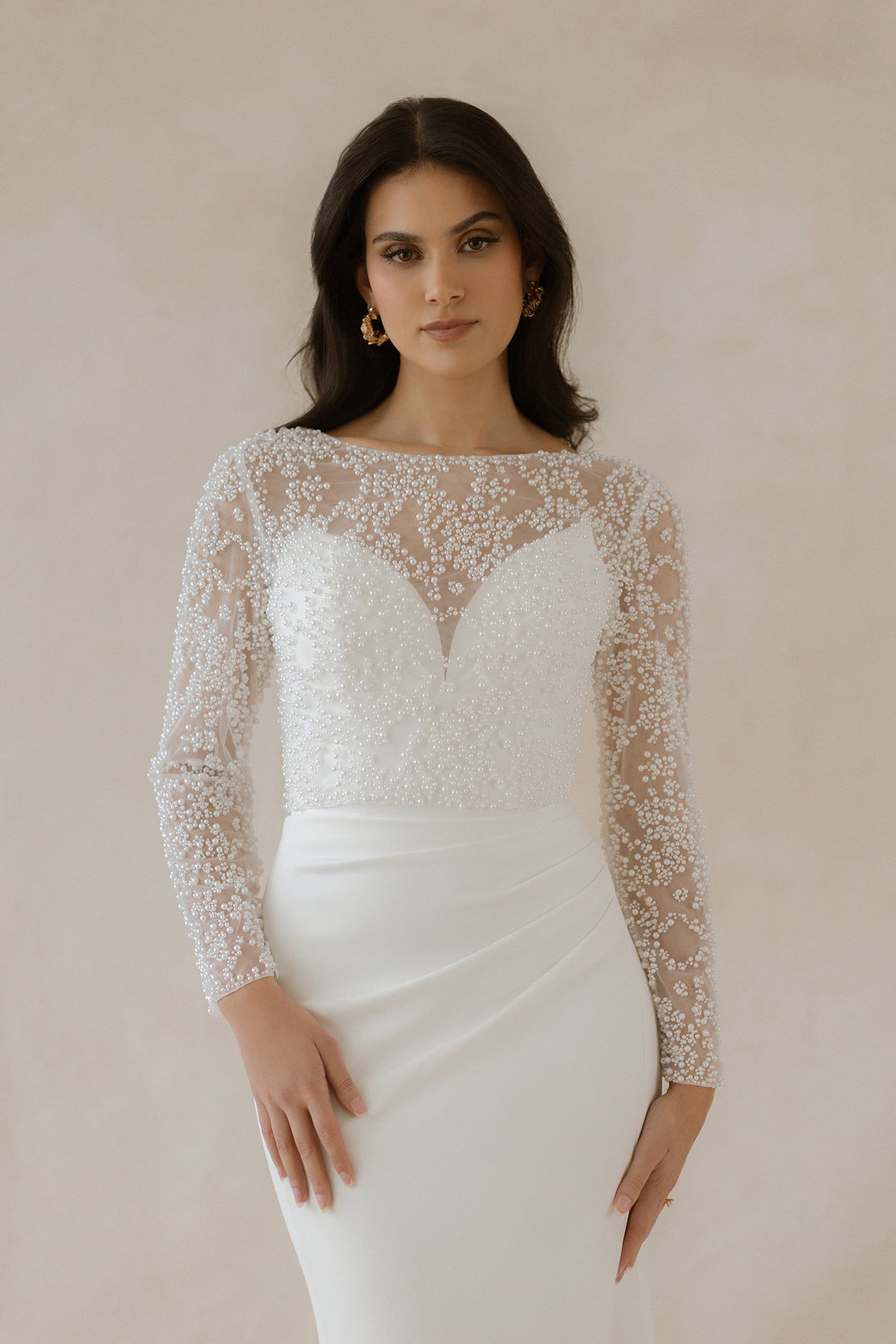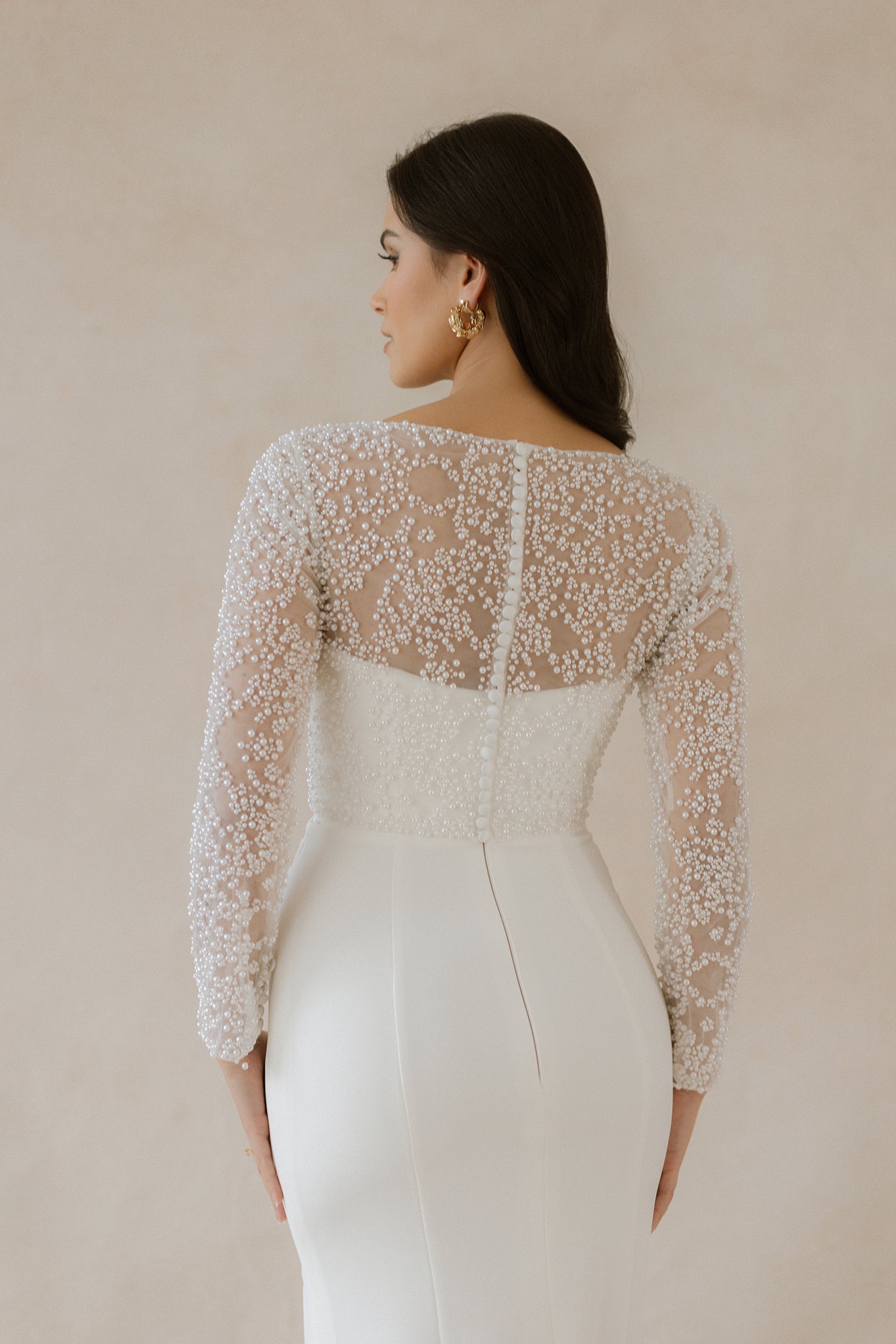 Style J56 is a long-sleeve scoop-neck jacket designed to complement gown E568. Adorned with scattered pearl clusters and delicate beading, it adds soft texture and a touch of shimmer without overwhelming the look. The elegant silhouette provides graceful coverage for the ceremony while ... Read More