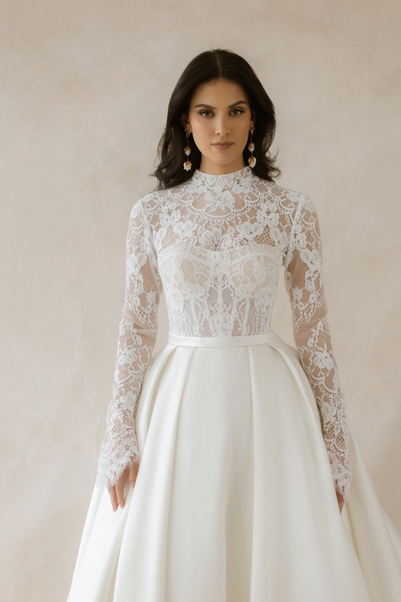 Style J58 is a high-neck, long-sleeve lace jacket designed to complement gowns E582, E583, and E584. Crafted from delicate lace, it adds refined coverage and a touch of vintage-inspired elegance, making it ideal for creating a more formal ceremony look. The high neckline frames the face beautifully, while the fitted sleeves maintain a sleek, sophisticated line that enhances each gown’s timeless silhouette. Read Less