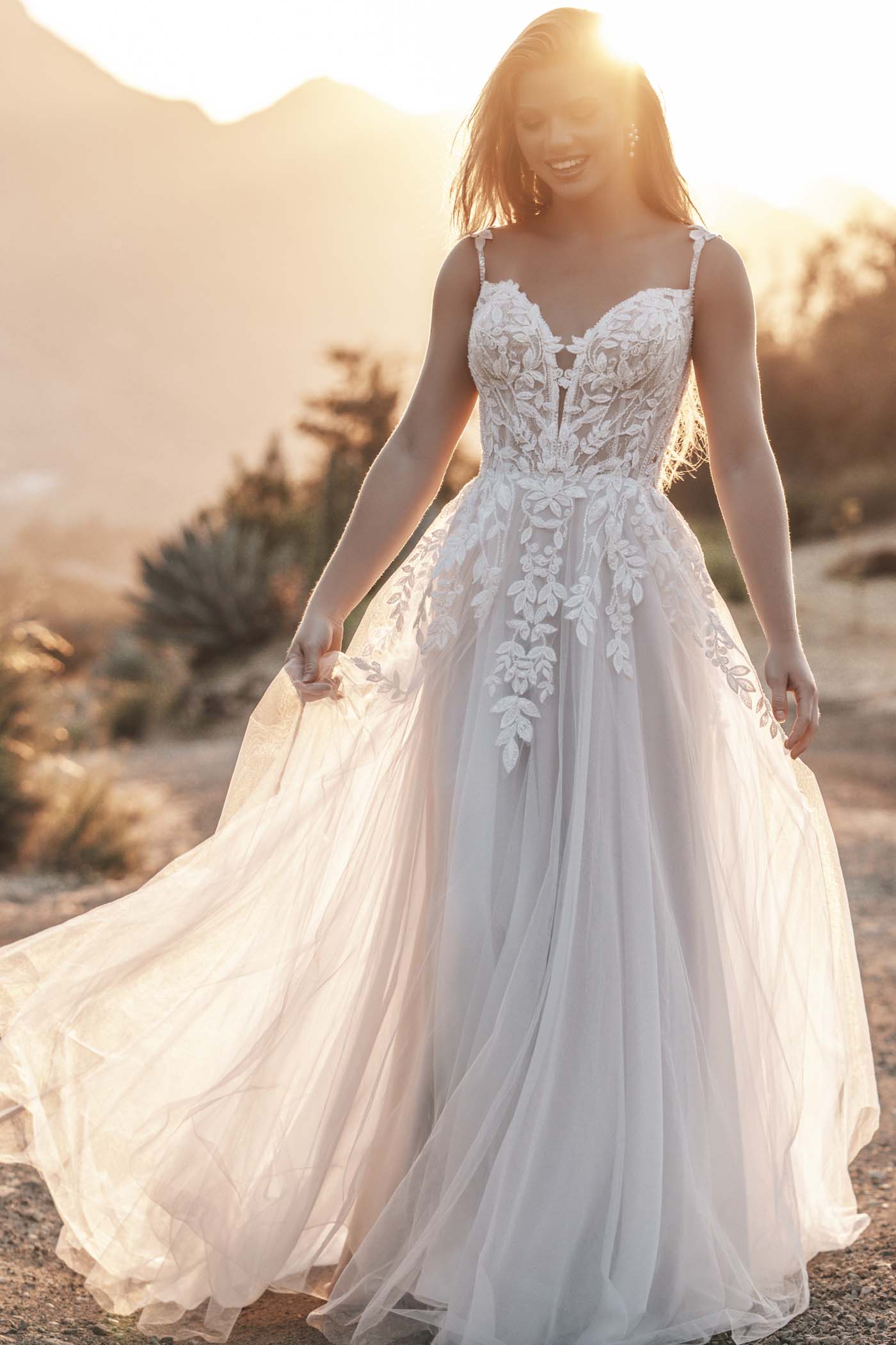 Opulent beaded, sequined lace covers the strappy Chantilly lace bodice of this A-line tulle bridal look.