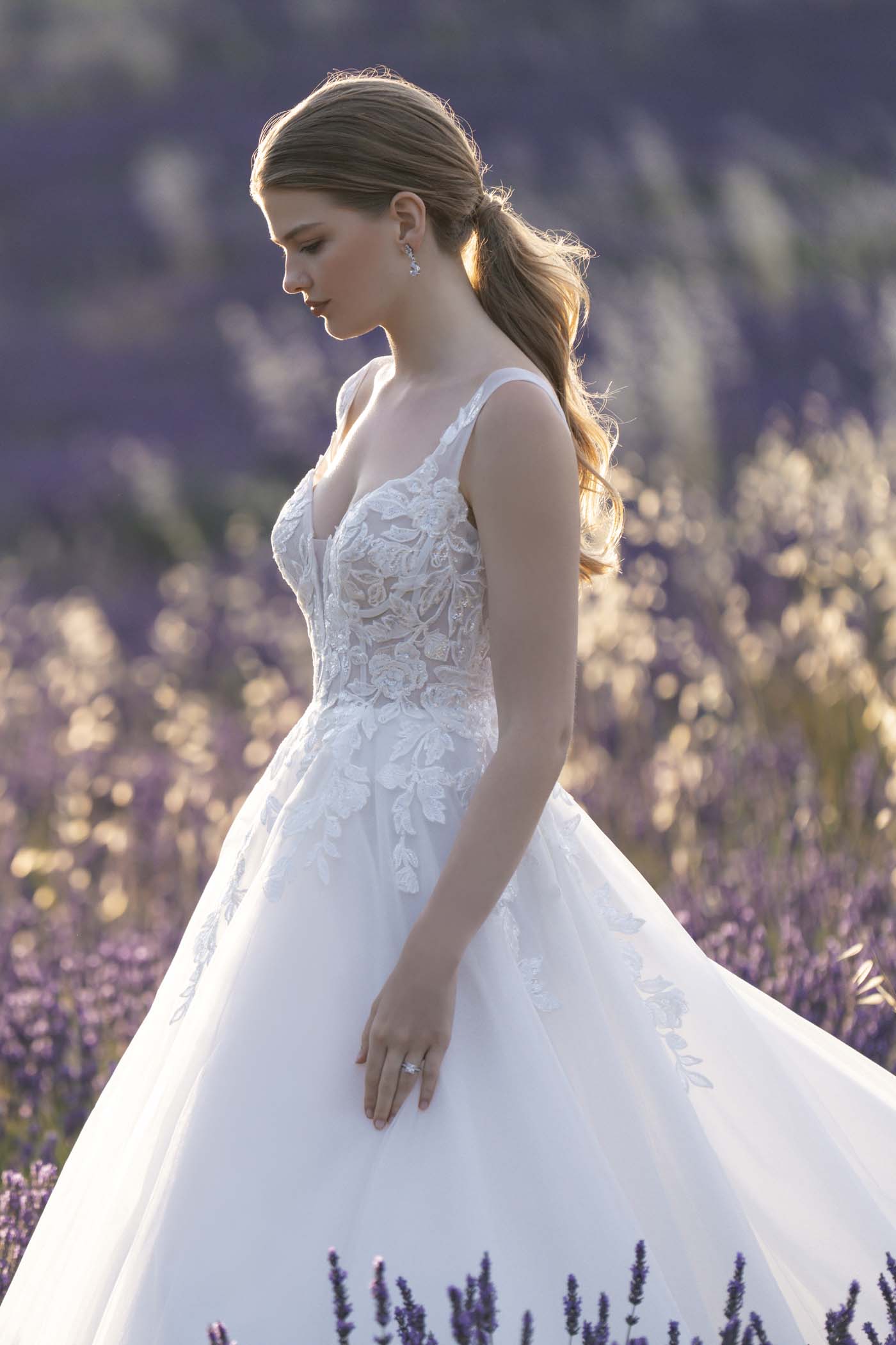 This A-line gown features a full sparkle tulle skirt topped with a sleeveless, sequined lace bodice.