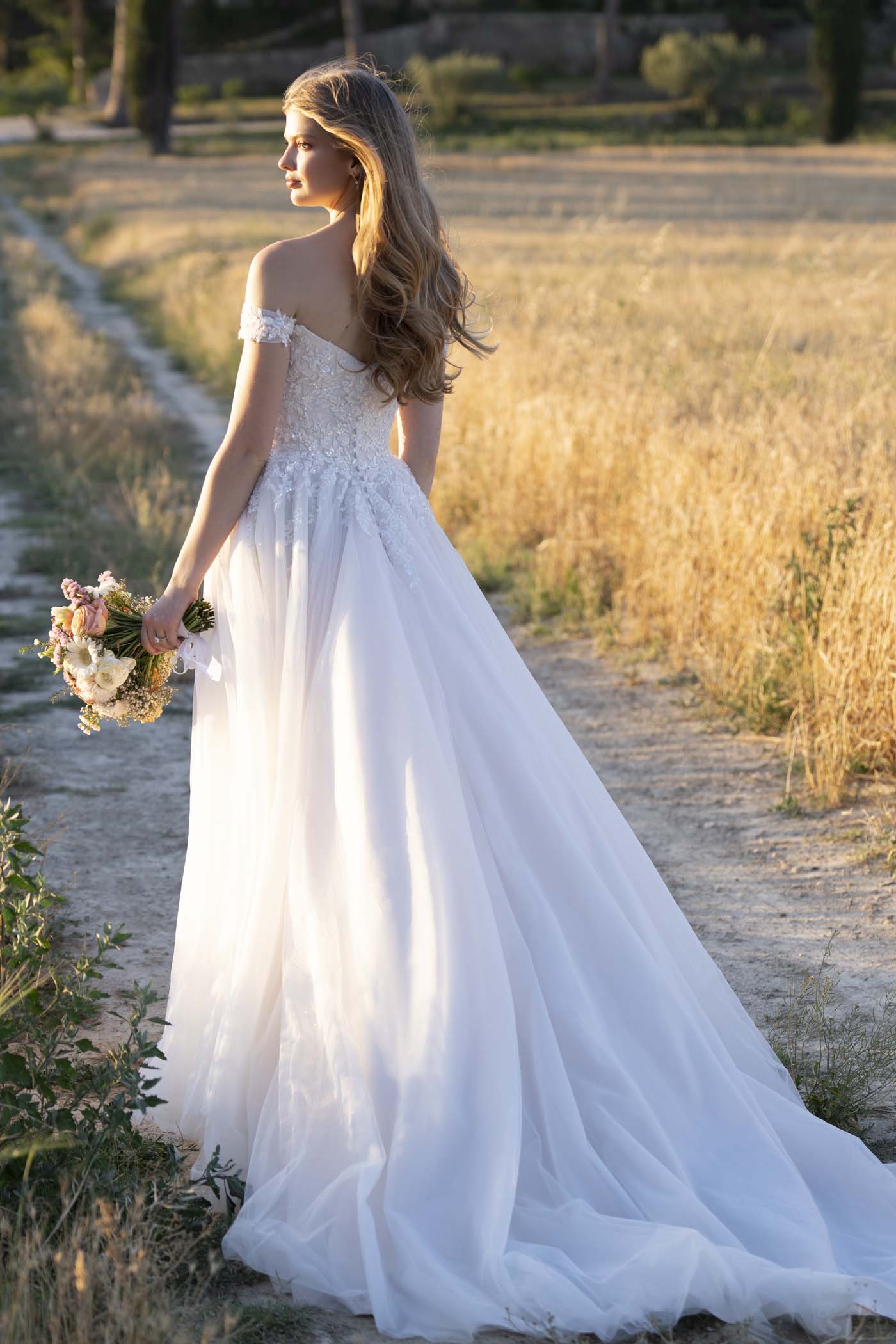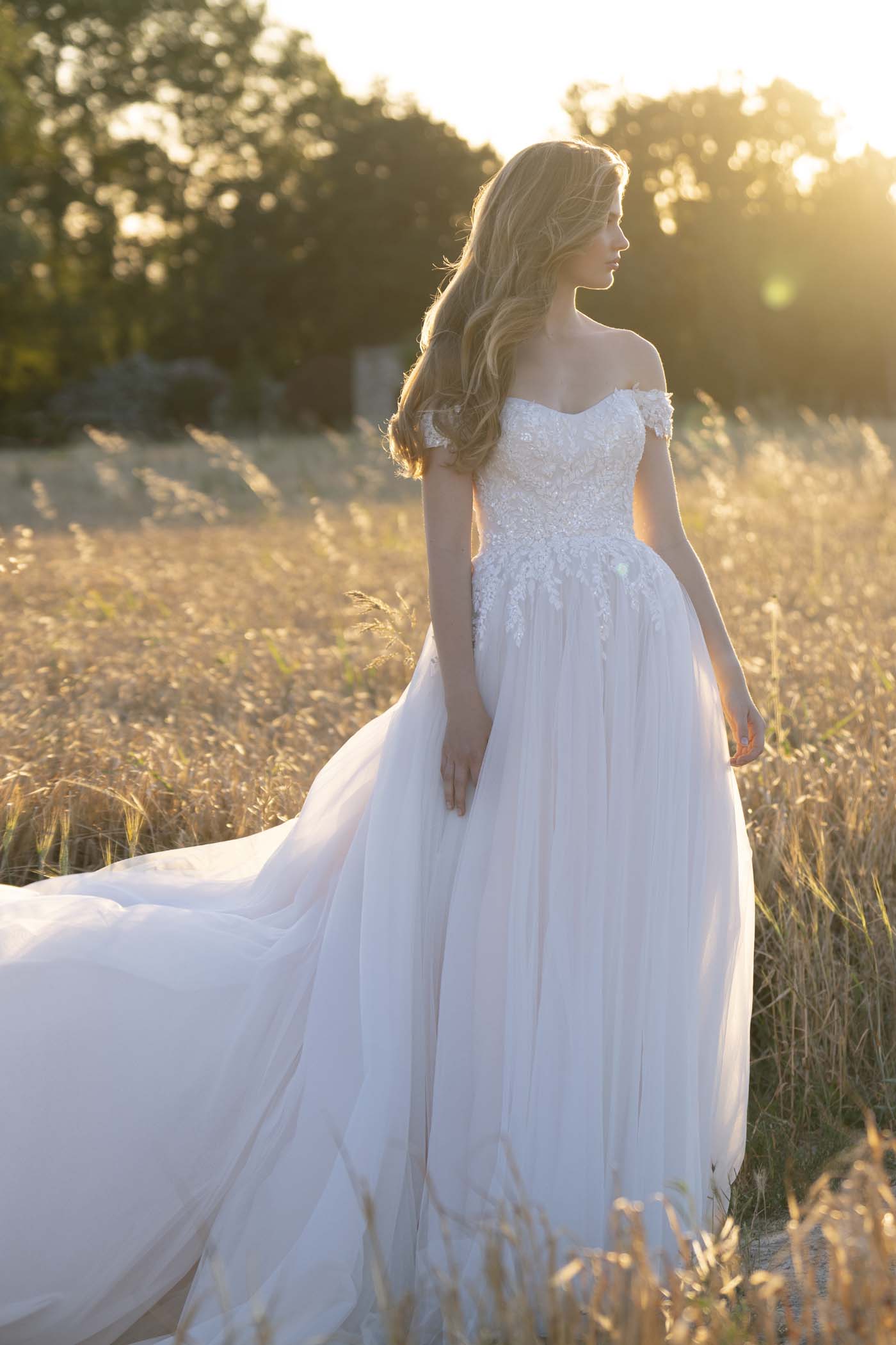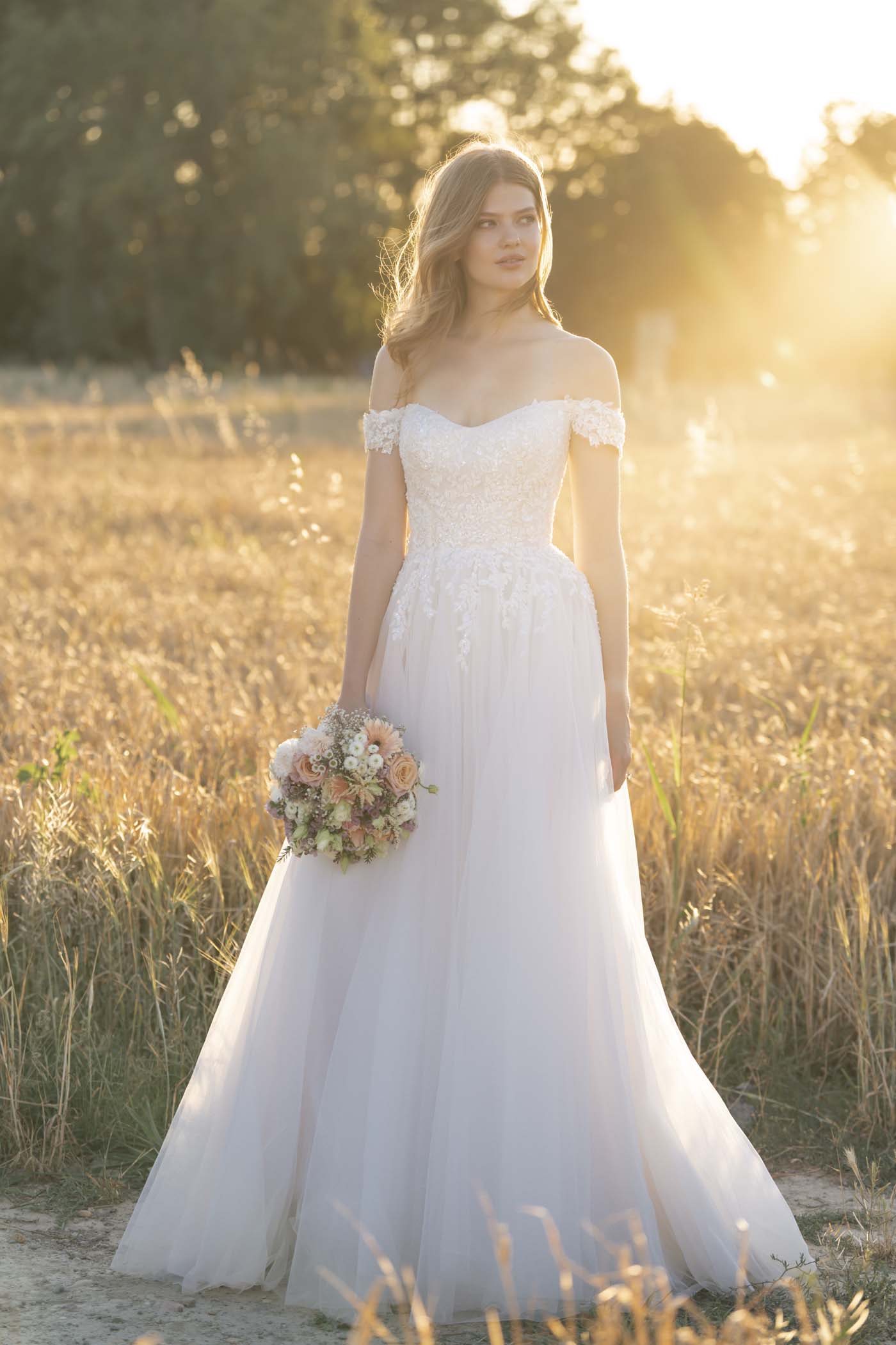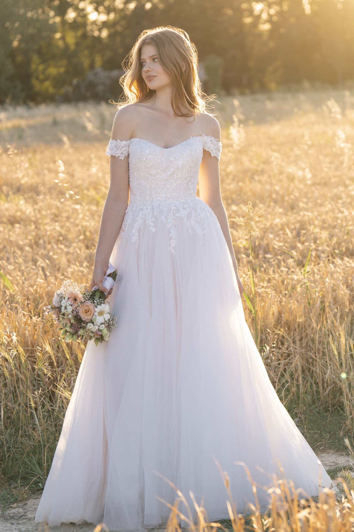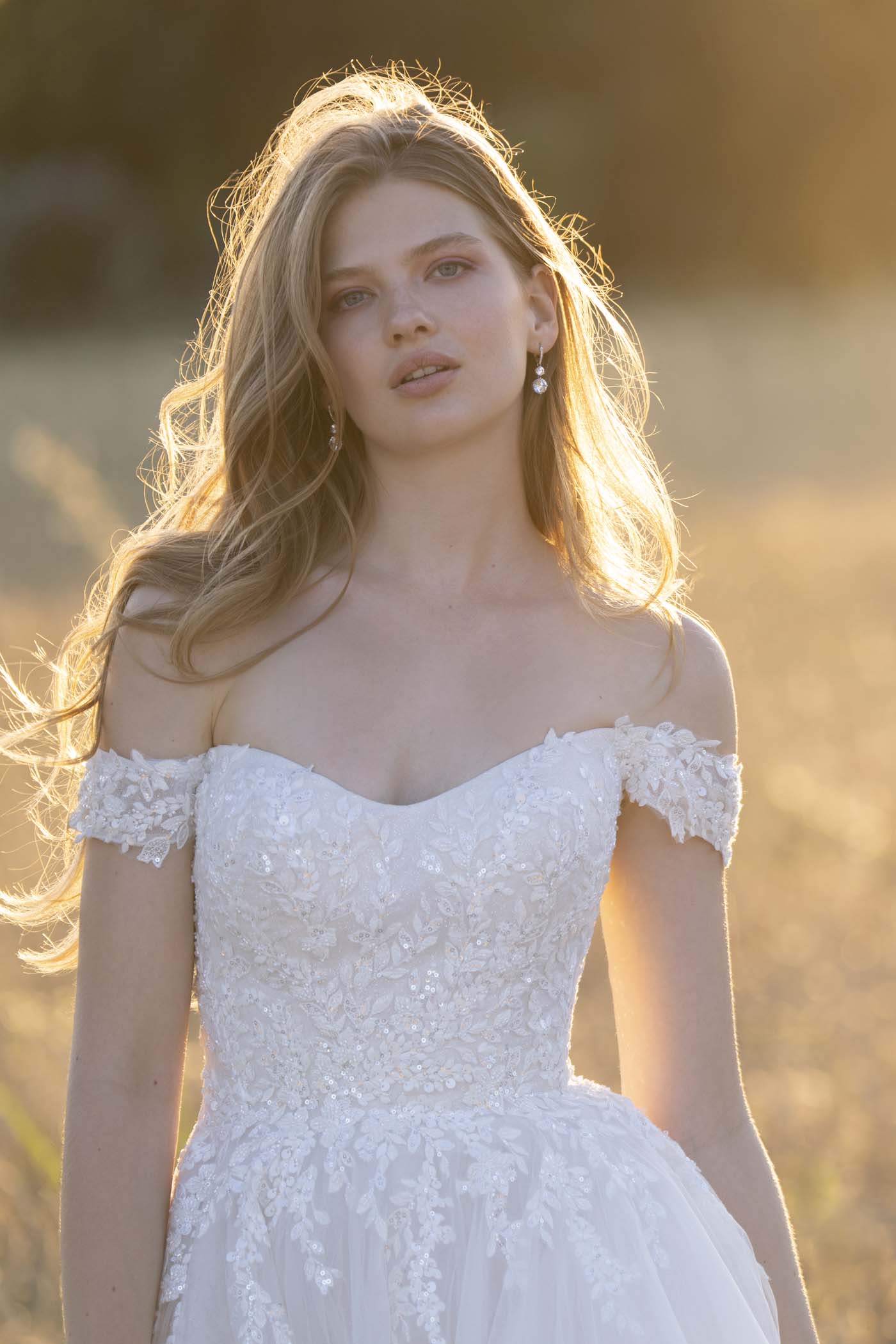 This off-shoulder tulle ballgown features sequined and beaded lace appliques.