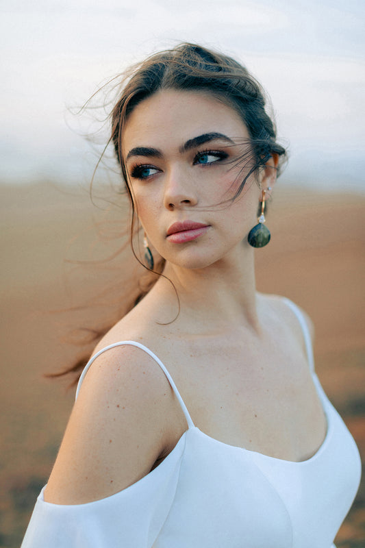 Matte lace and a Chantilly lace underlay compose the bodice of our Summer gown, which is finished with a fluid, A-line chiffon skirt.
