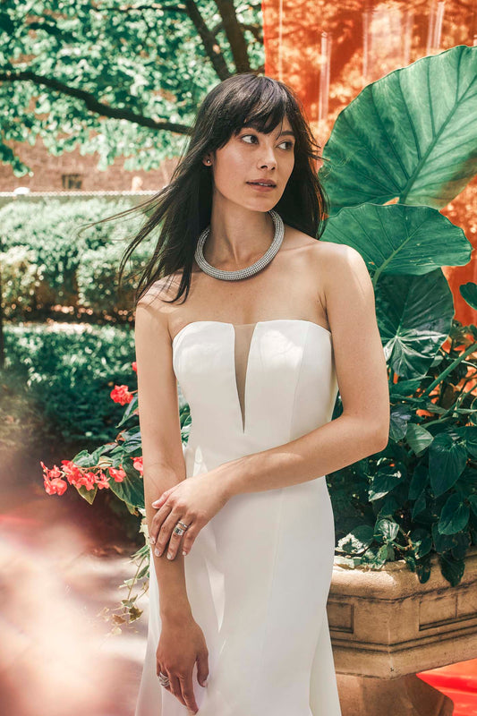 The Logan gown draws inspiration from the timelessness of an understated strapless silhouette, designed with richly textured crepe and finished with a bow at the back.