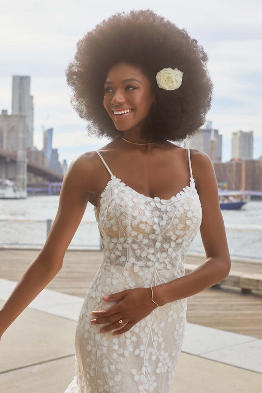 Kassi’s dimensional beaded lace and shimmering sequins trail down the bodice and skirt, creating a work of art.