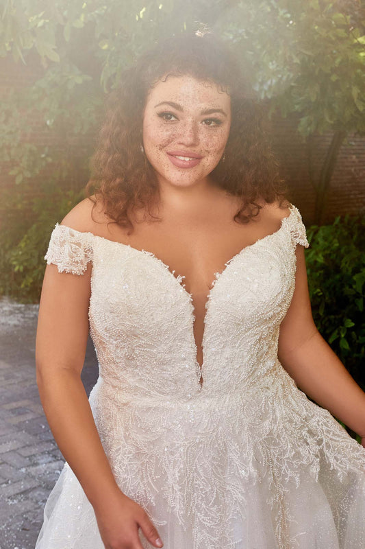 Ethereal pearl accents shimmer across the soft tulle of this off-shoulder A-line gown.