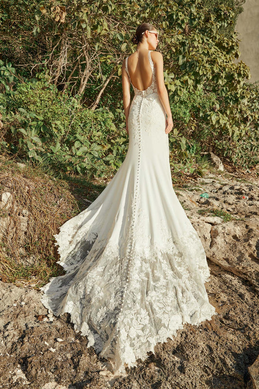 Soft crepe, paired with a transcluent beaded dand appliquéd train, make Joana -- our sleeveless sheath gown -- stand out from the crowd.