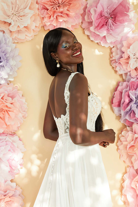 Shimmering sequined lace appliques are overlaid on a tulle A-line skirt, for a truly modern yet classic bridal silhouette.