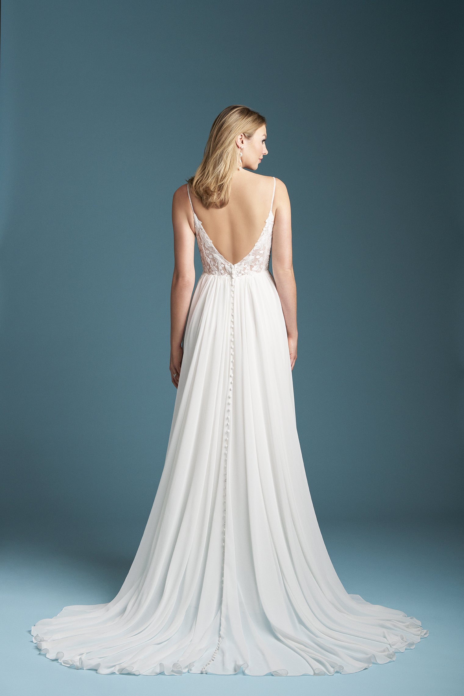 Light, airy, and endlessly romantic—this A-line wedding dress pairs a beaded and sequin lace bodice with delicate spaghetti straps and a flowing chiffon skirt made to move with you down the aisle, and at your reception!
