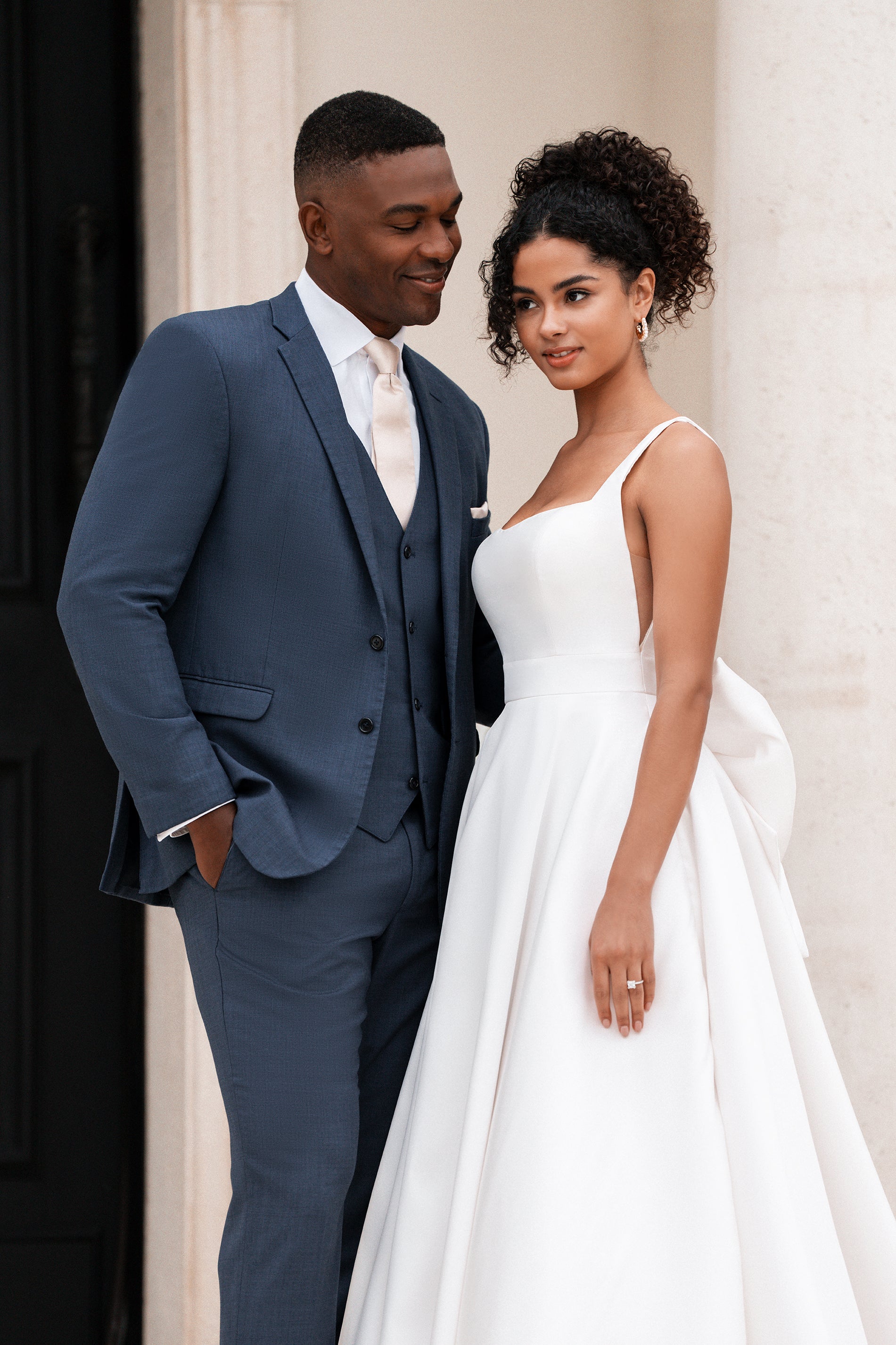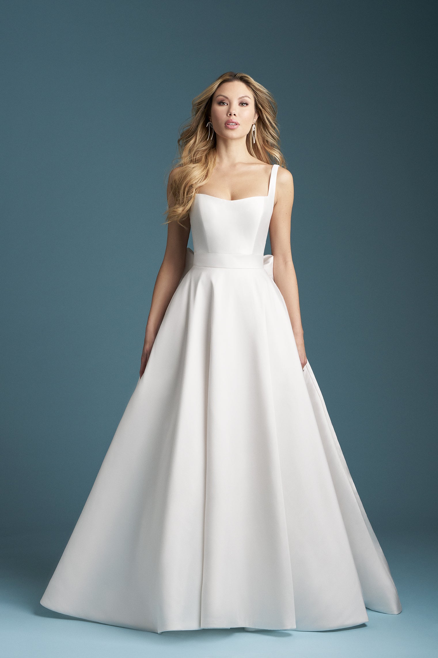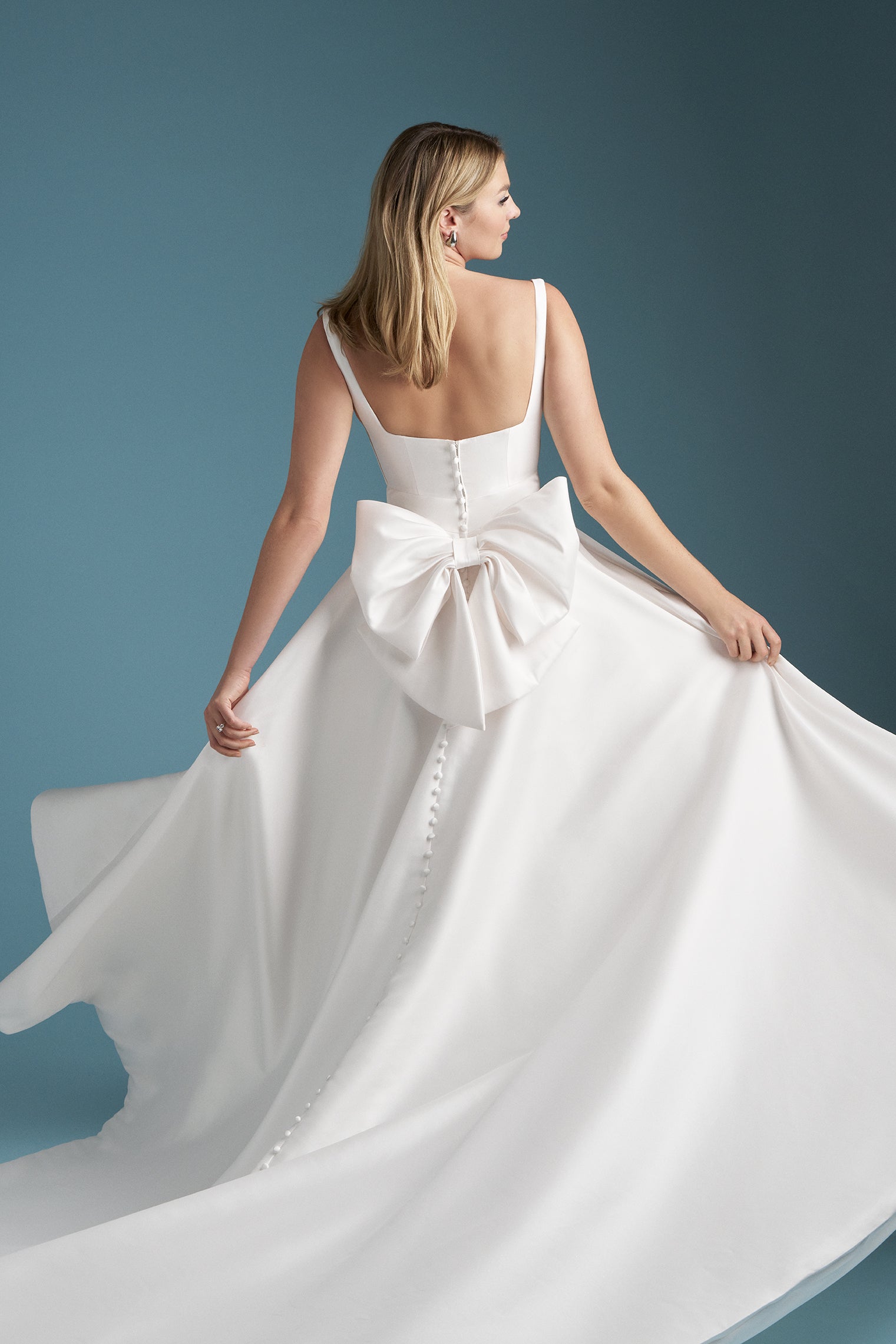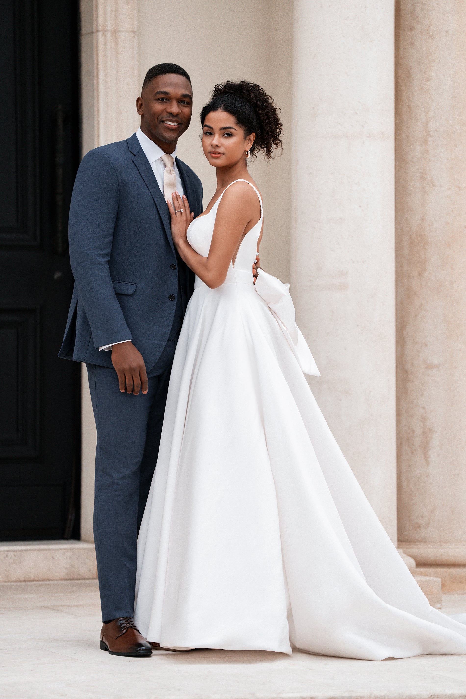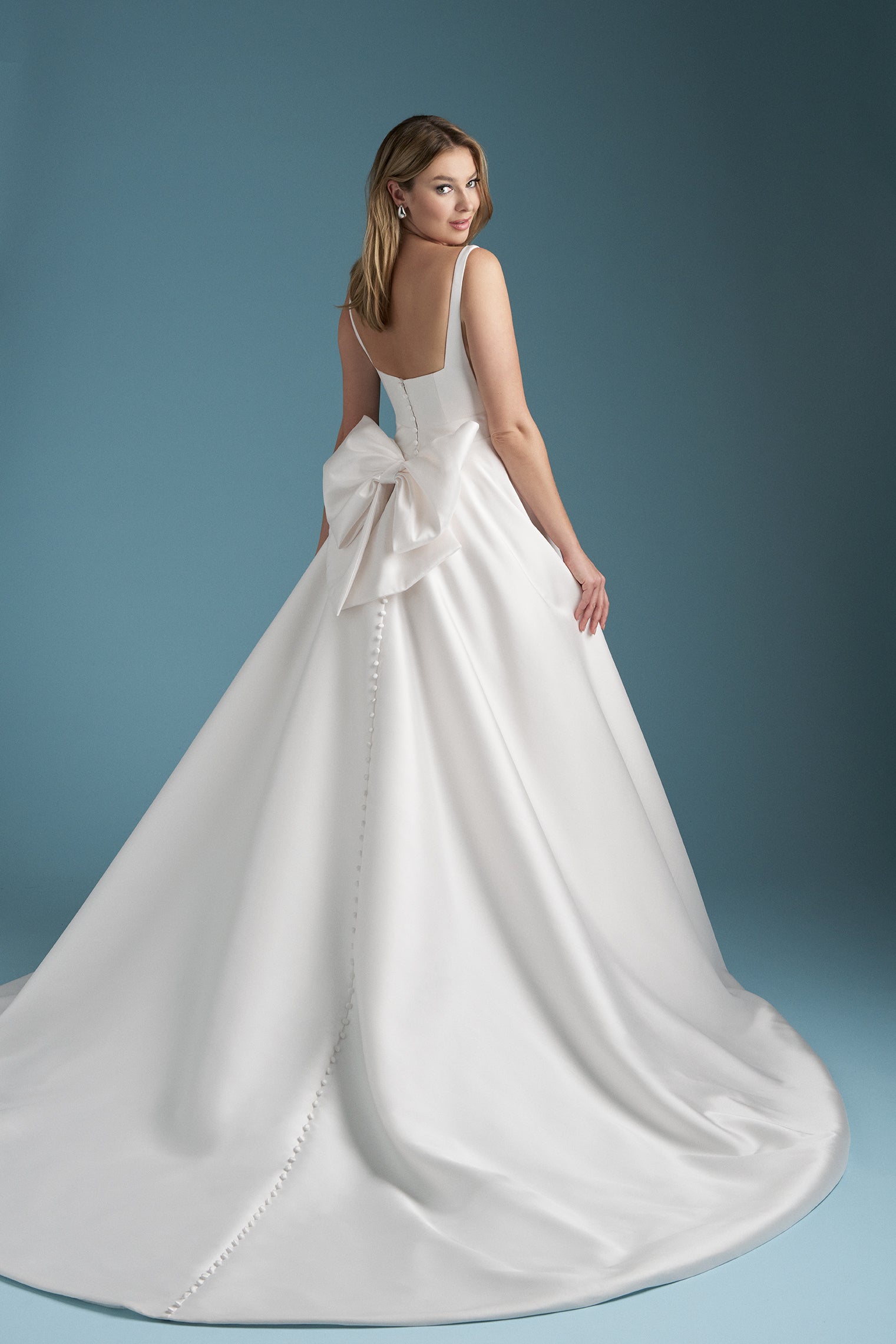 This Mikado ballgown stuns with a classic scoop neckline and delicate spaghetti straps, creating a sleek, timeless silhouette. A detachable bow at the back adds a playful, elegant detail for added versatility.