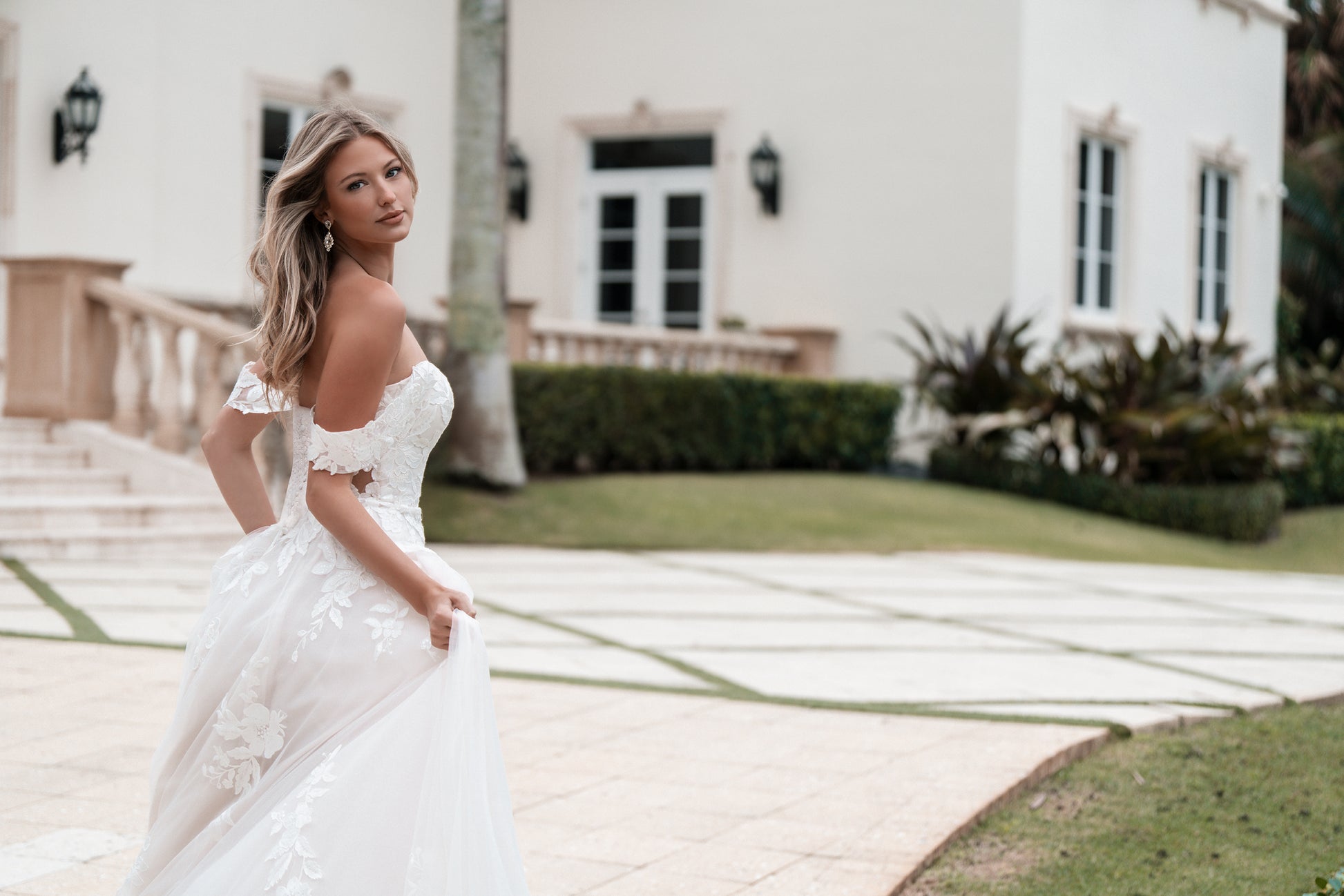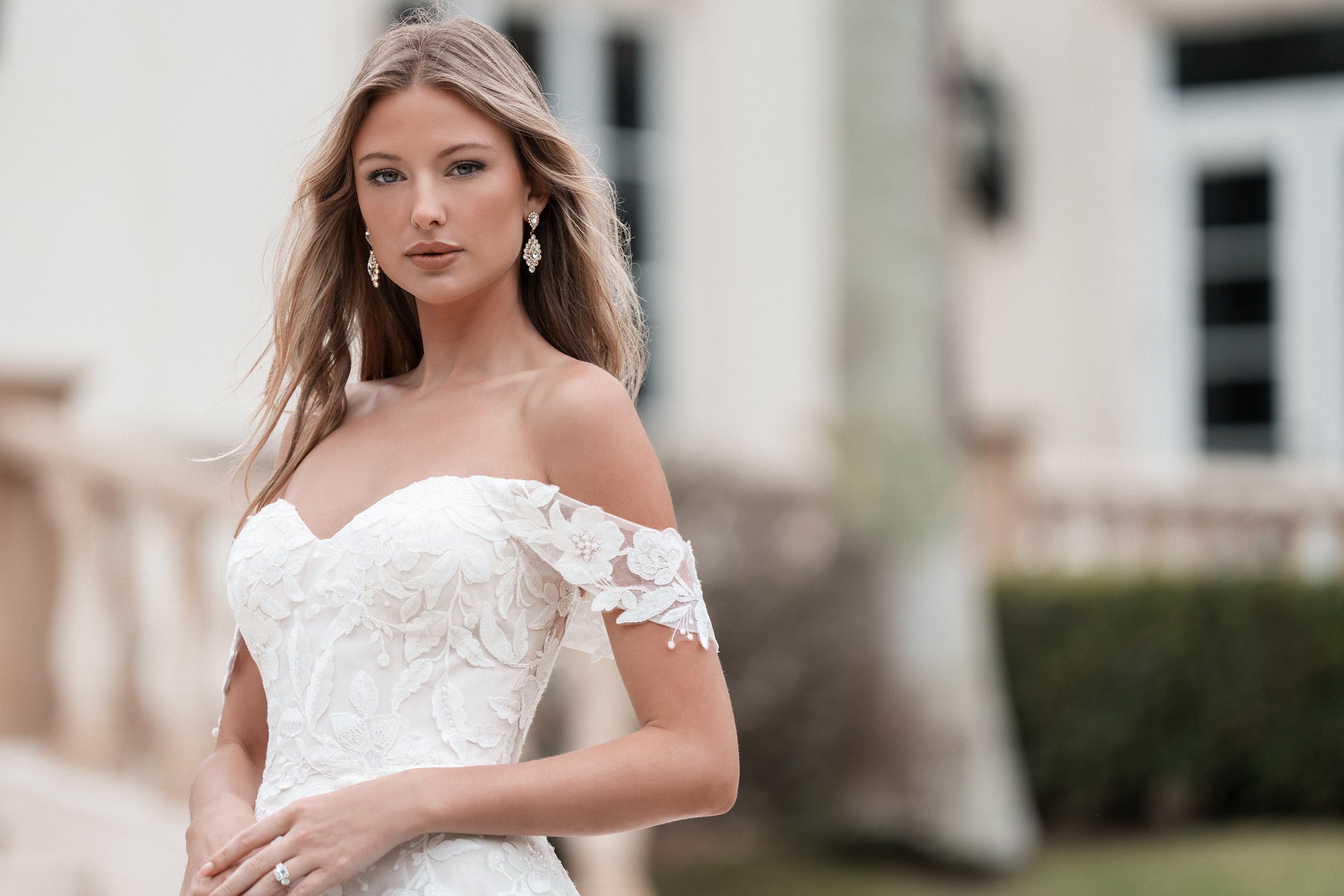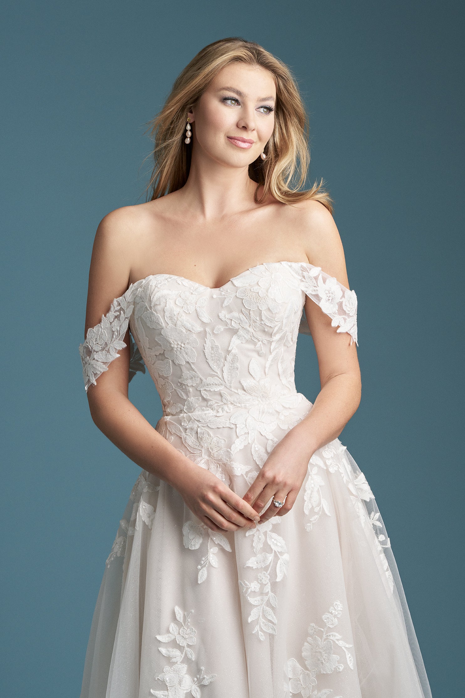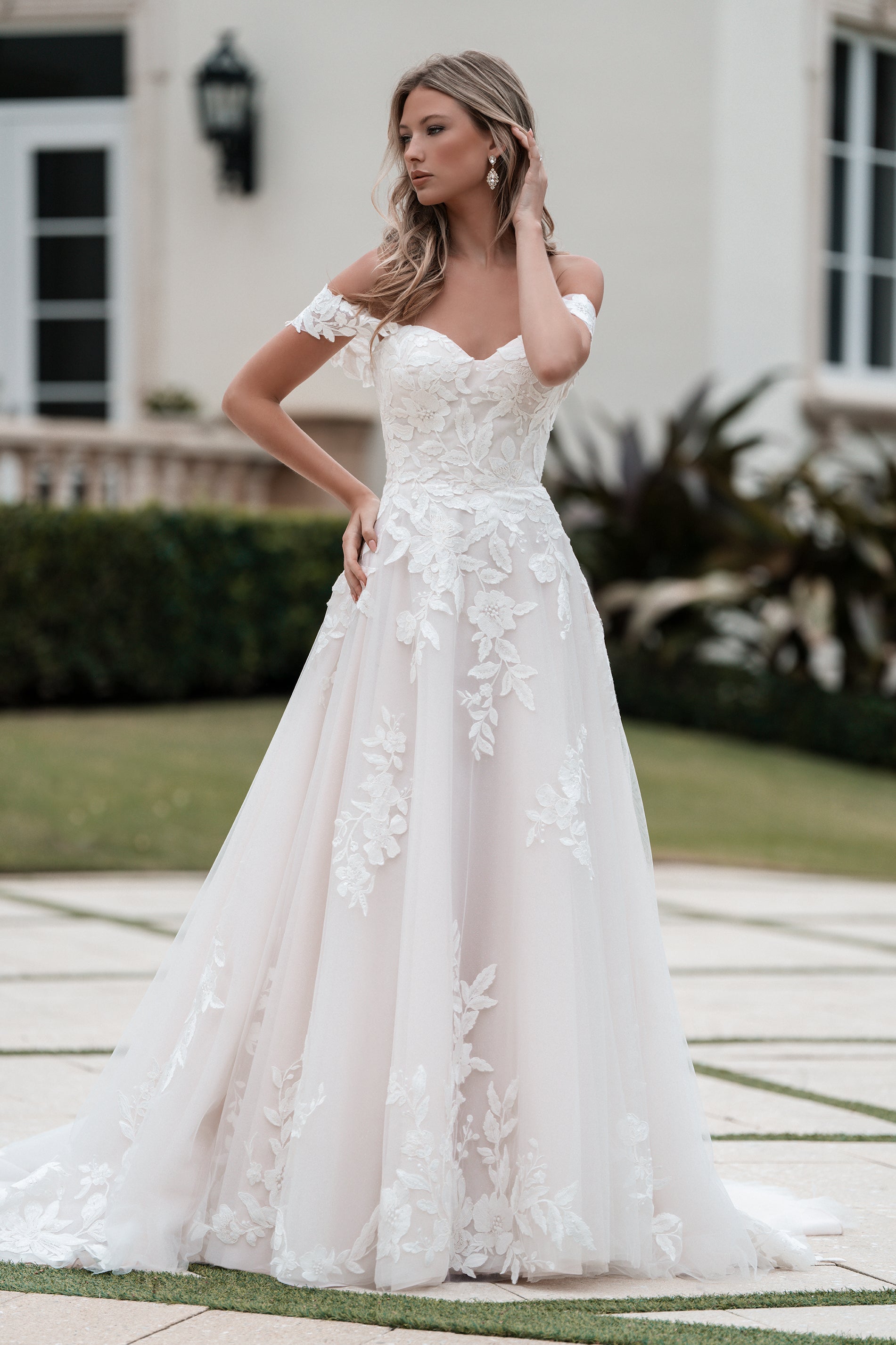 This A-line wedding dress features a romantic sweetheart neckline and off-the-shoulder sleeves, crafted from airy sparkle tulle. Bold, oversized lace appliques add striking texture and a fresh, modern twist on a classic silhouette.