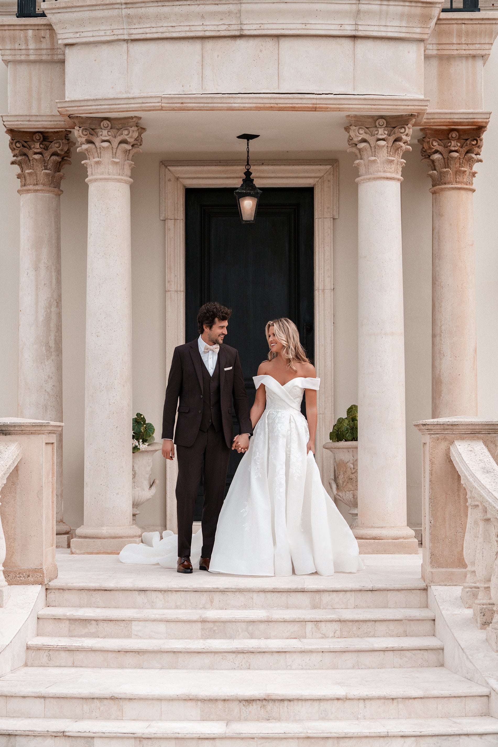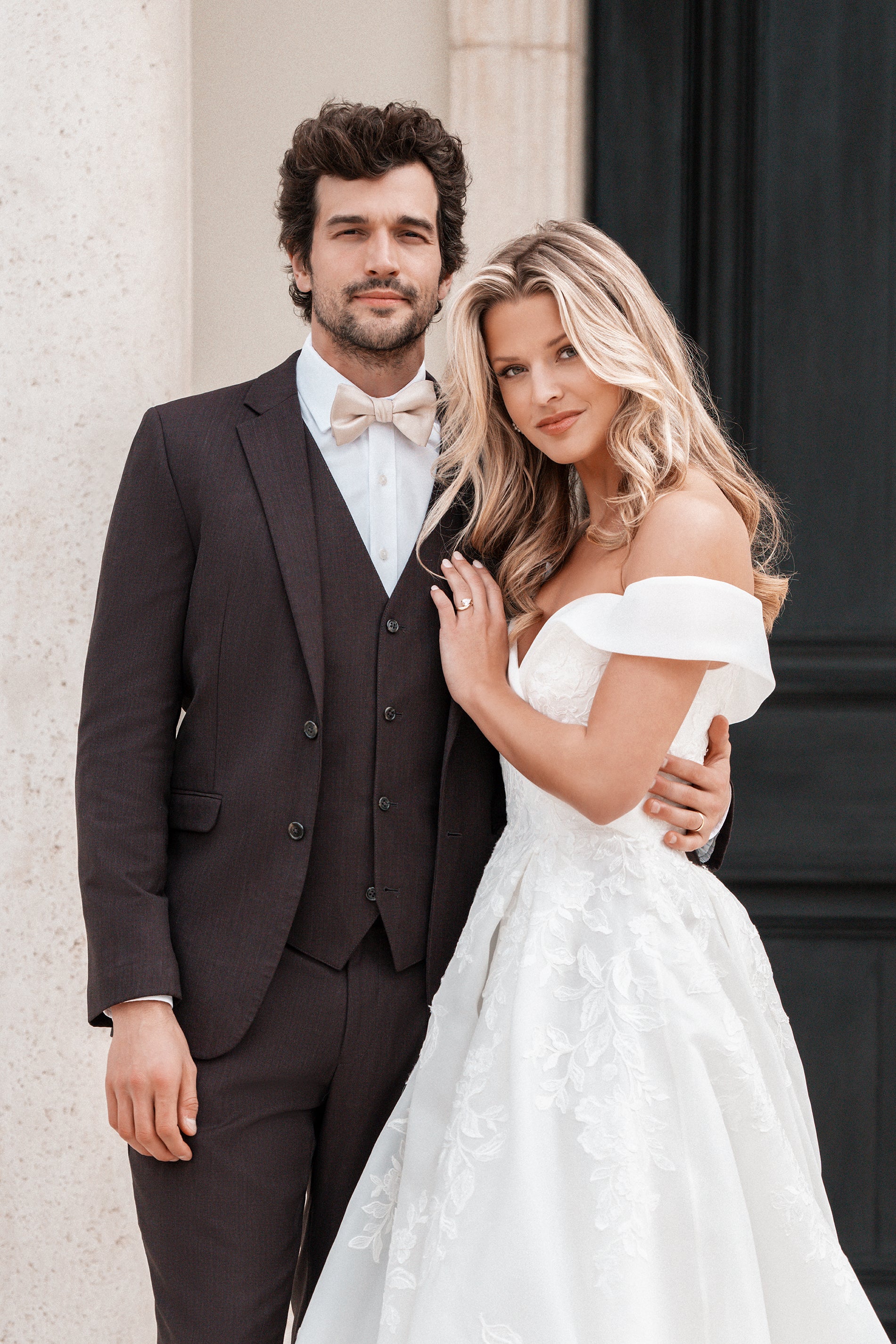 This dreamy ballgown features a sweetheart neckline framed by airy organdy and off-the-shoulder sleeves. Sequin lace appliques shimmer across the full skirt, while a subtle slit adds a modern, unexpected twist to the romantic silhouette.