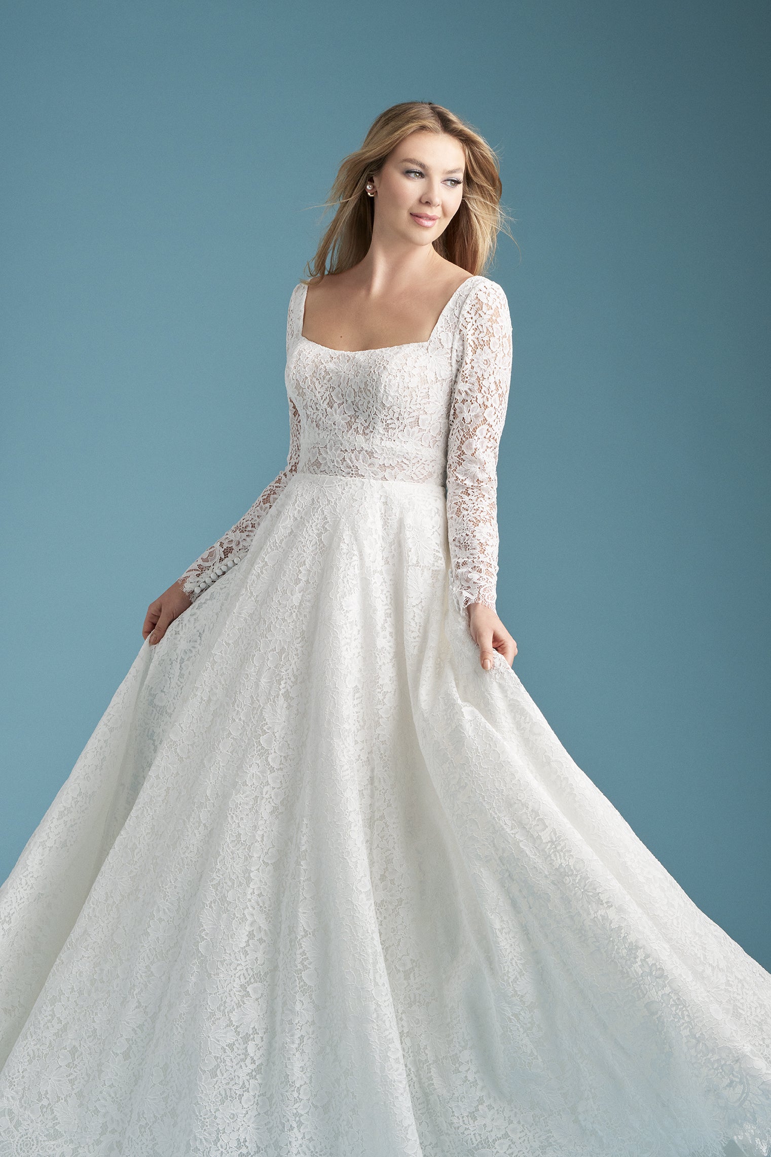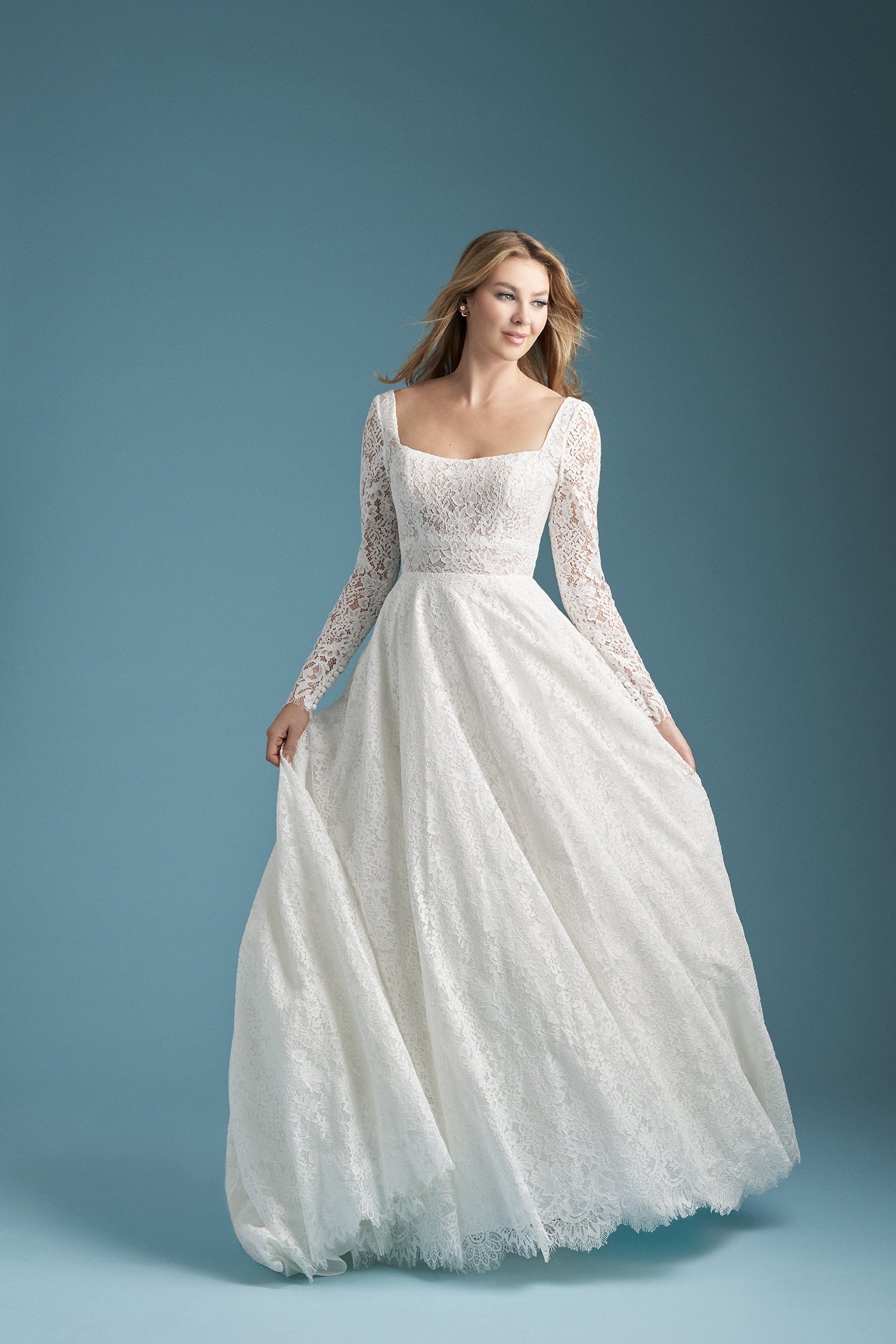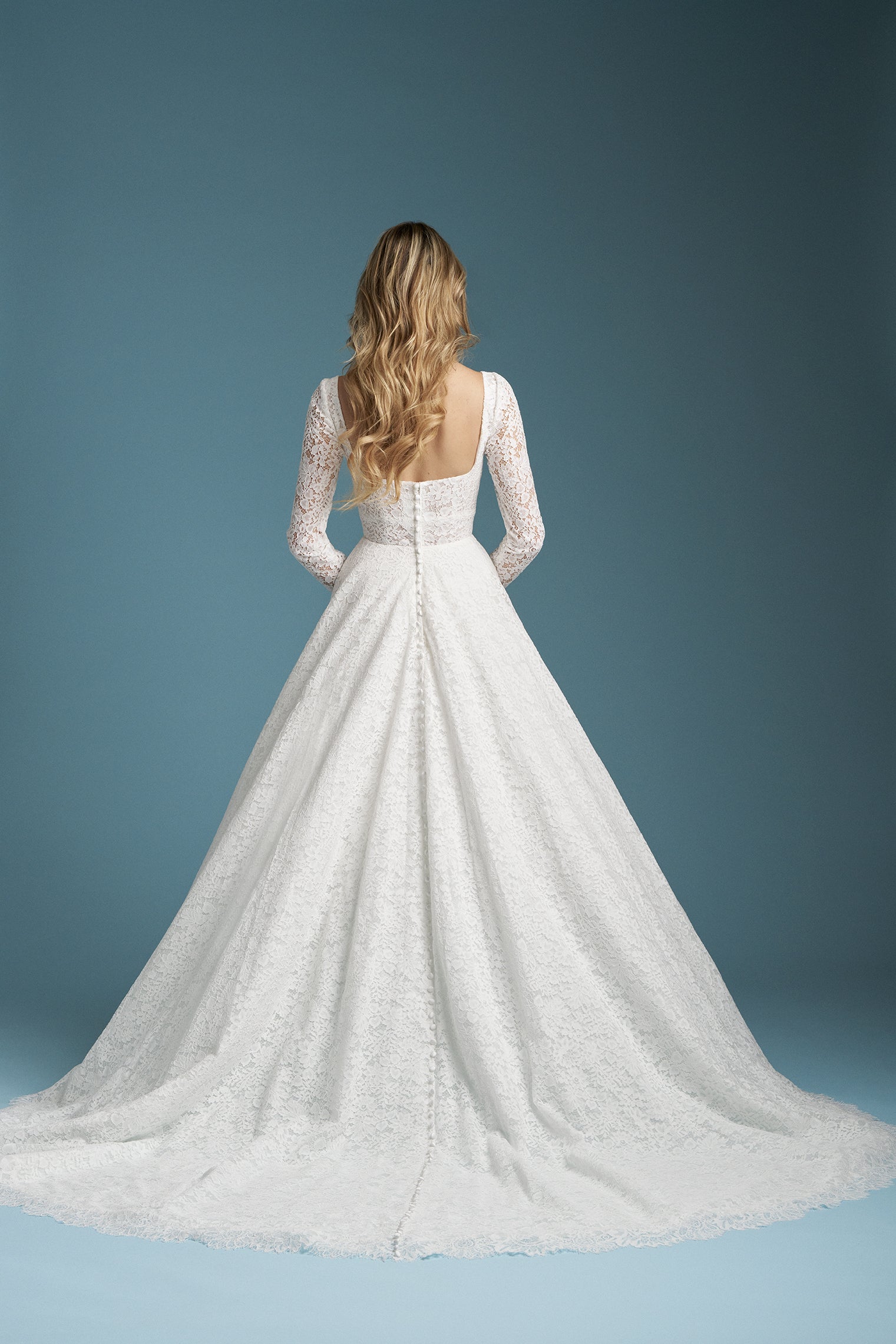 This A-line wedding gown features a classic scoop neckline and long sleeves, crafted from all-over sheet lace for a soft, romantic texture. A flattering natural waist defines the silhouette, while covered buttons trail all the way down the length of the train for an elegant finish.