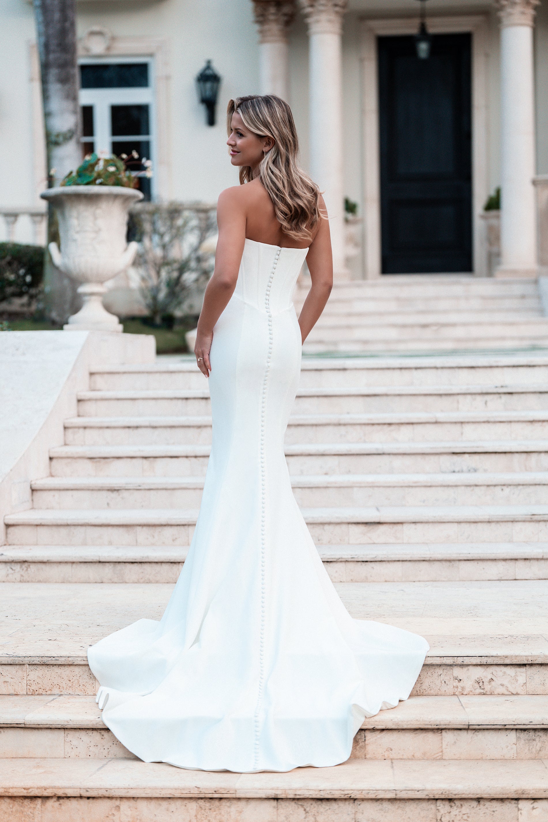 This sleek crepe sheath gown stuns with a corset-style bodice, featuring a draped sweetheart neckline and off-the-shoulder sleeves. A subtle Basque waistline adds sculpting, while covered buttons trail down the back of the train for a refined finish. Please note: This style does not all... Read More