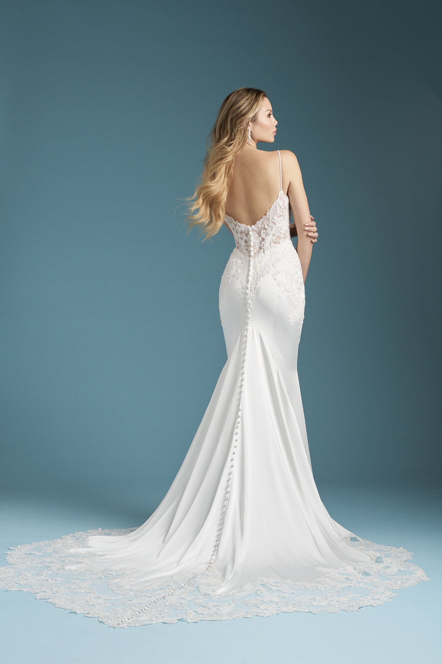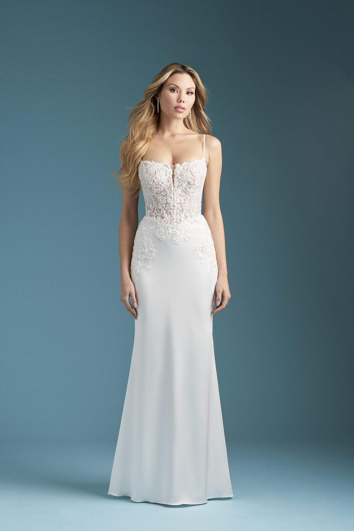 This sleek sheath gown features a sheer beaded lace bodice with a deep V-neckline and delicate spaghetti straps. A soft Basque waistline gently defines the figure, flowing into a stretch satin skirt that hugs every curve with understated elegance.