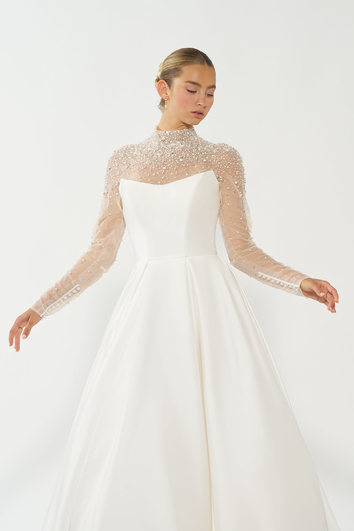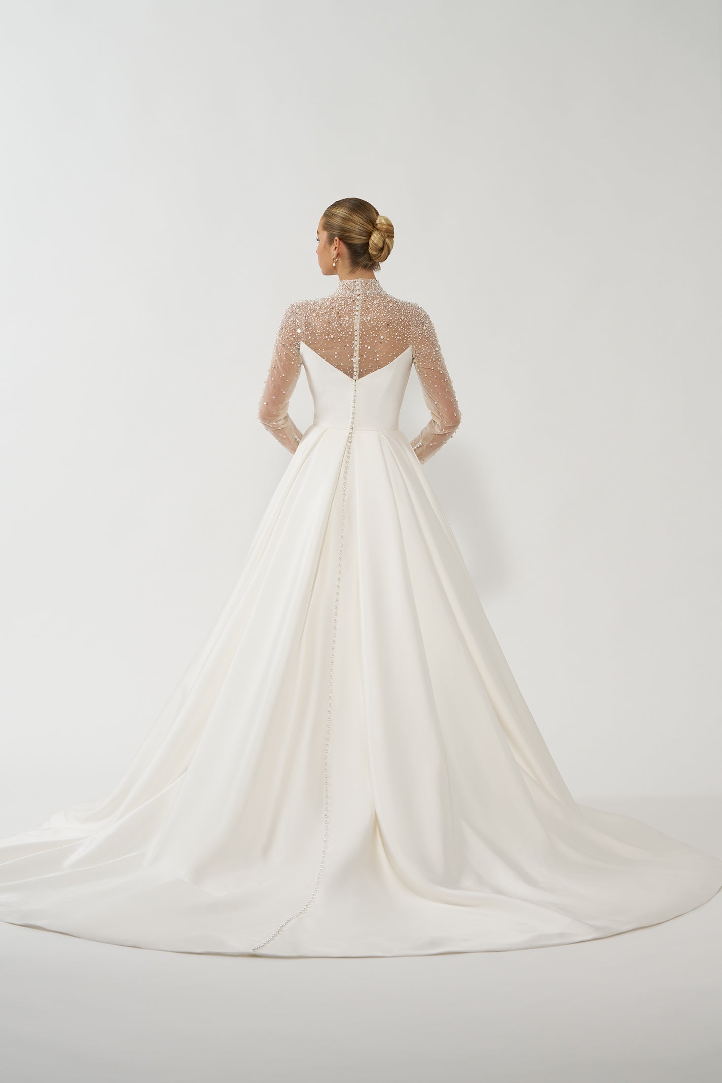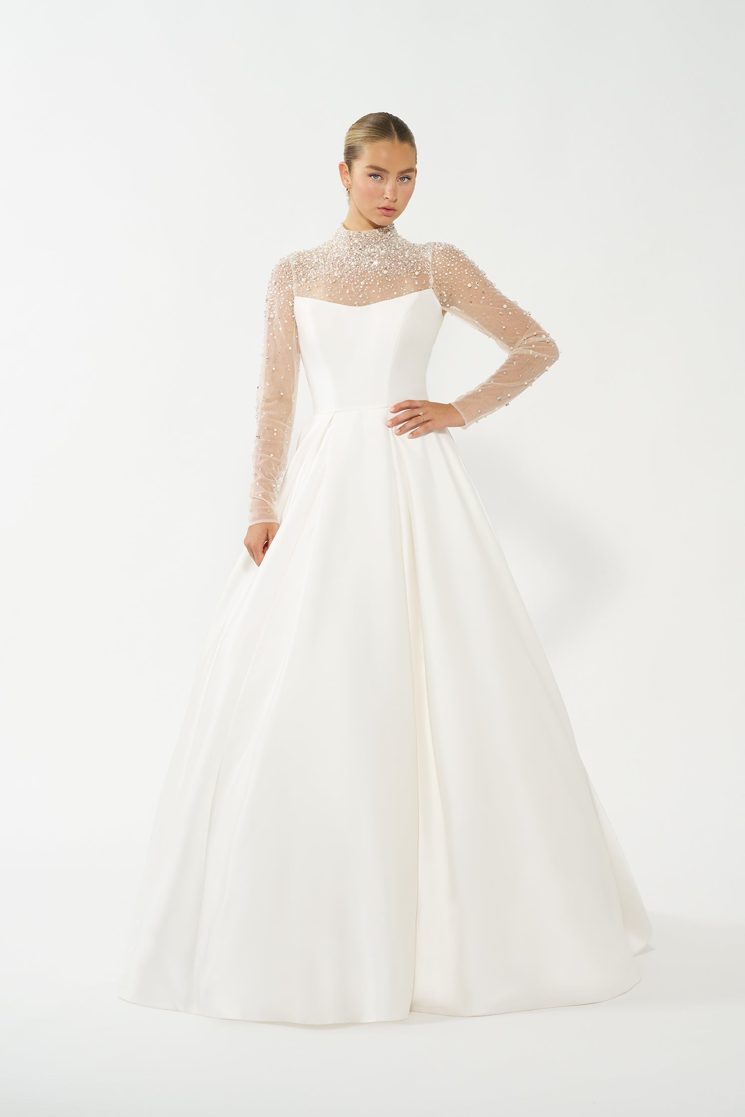 Balancing clean structure with intricate detail, this Mikado ballgown features a high neckline and sleeveless bodice embellished with pearl buttons and sequin-beaded clusters. Detachable matching long sleeves offers added versatility, though not pictured. Please note: This style does not allow for custom changes. Read Less