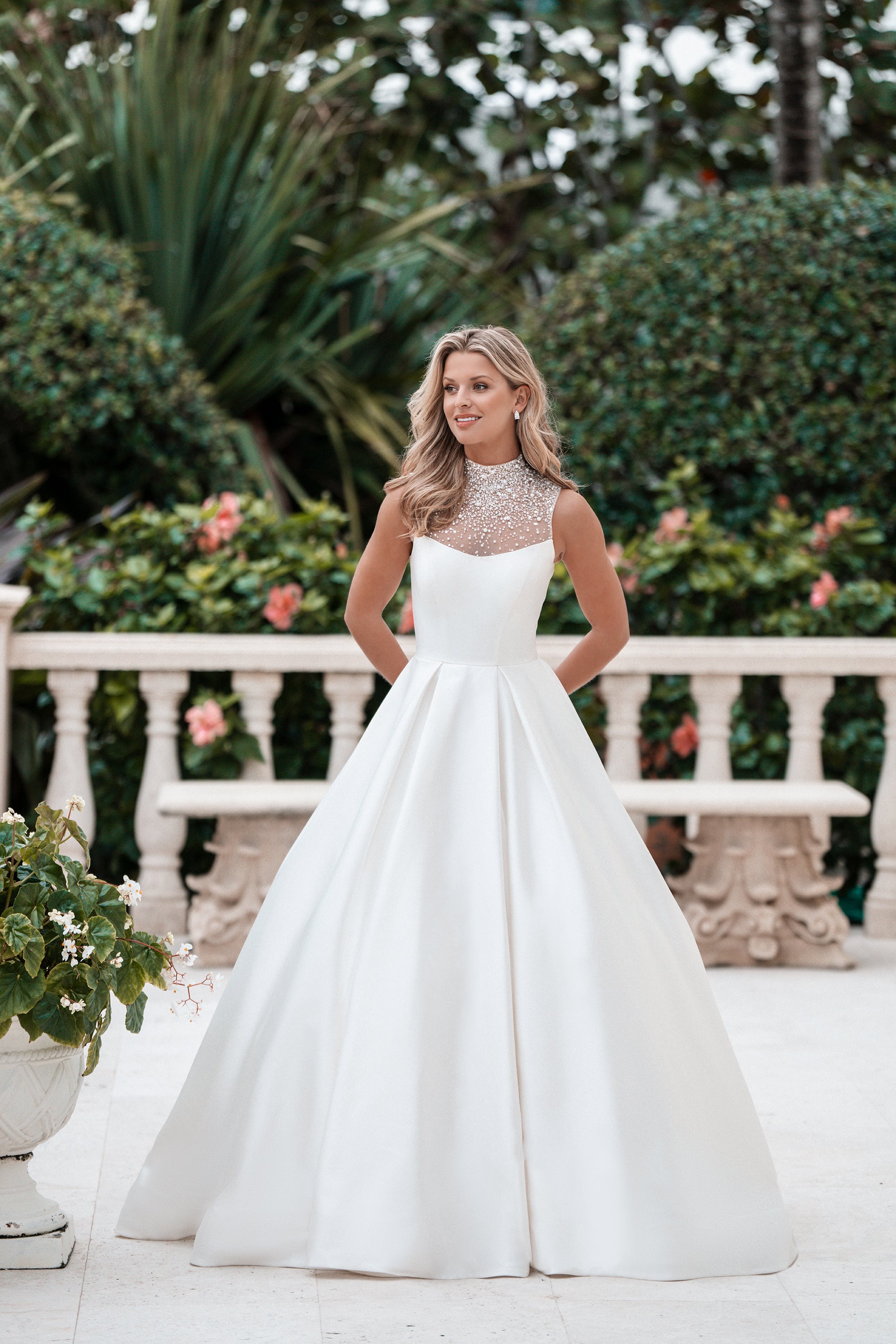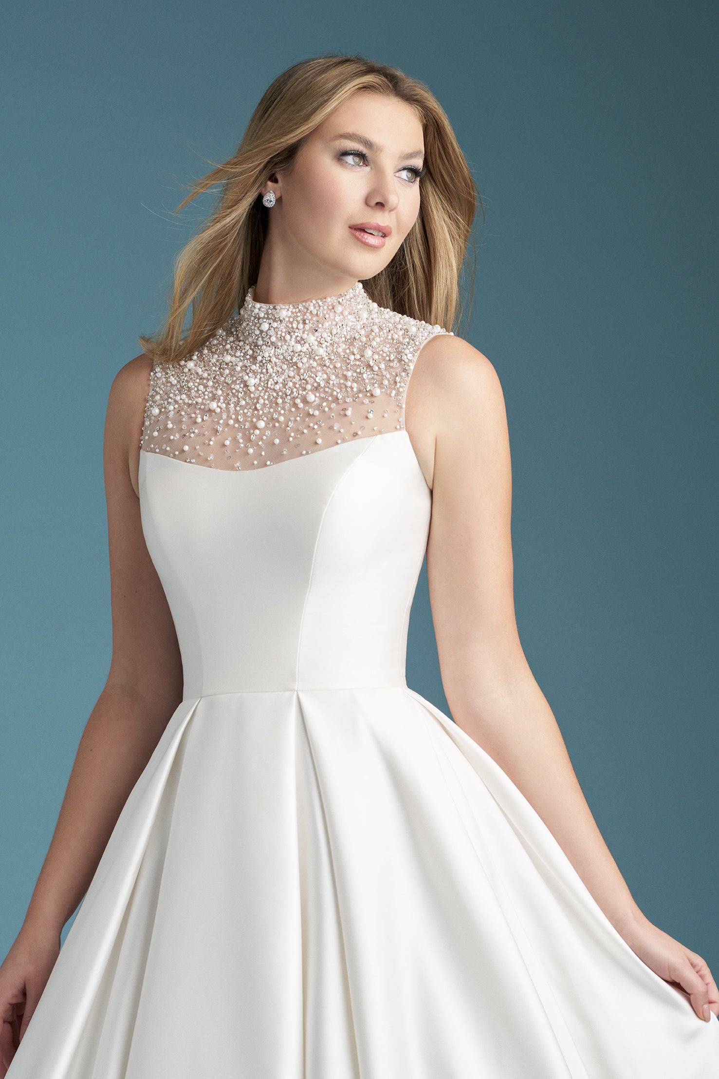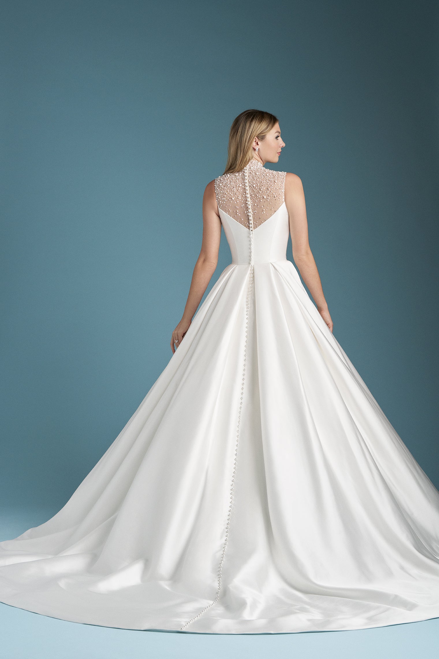 Balancing clean structure with intricate detail, this Mikado ballgown features a high neckline and sleeveless bodice embellished with pearl buttons and sequin-beaded clusters. Detachable matching long sleeves offers added versatility, though not pictured. Please note: This style does not allow for custom changes. Read Less