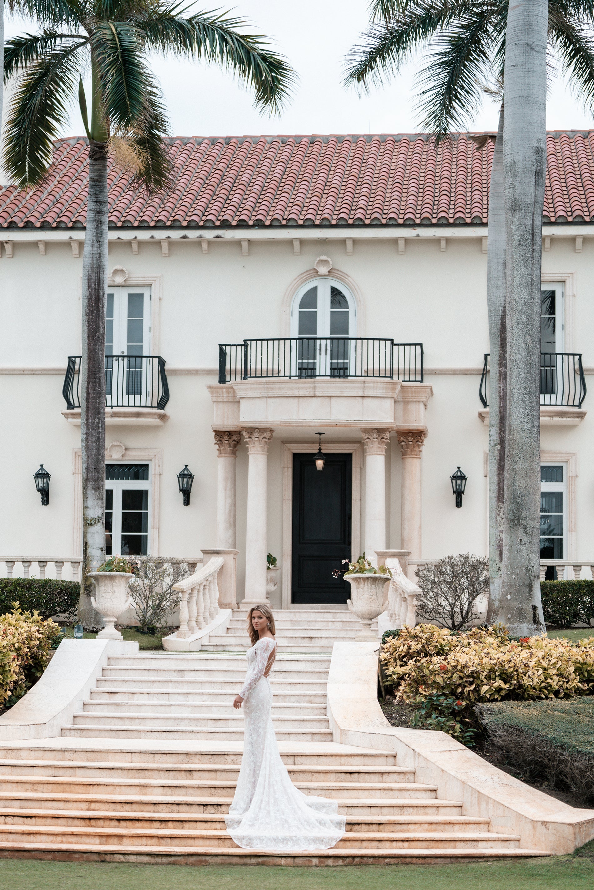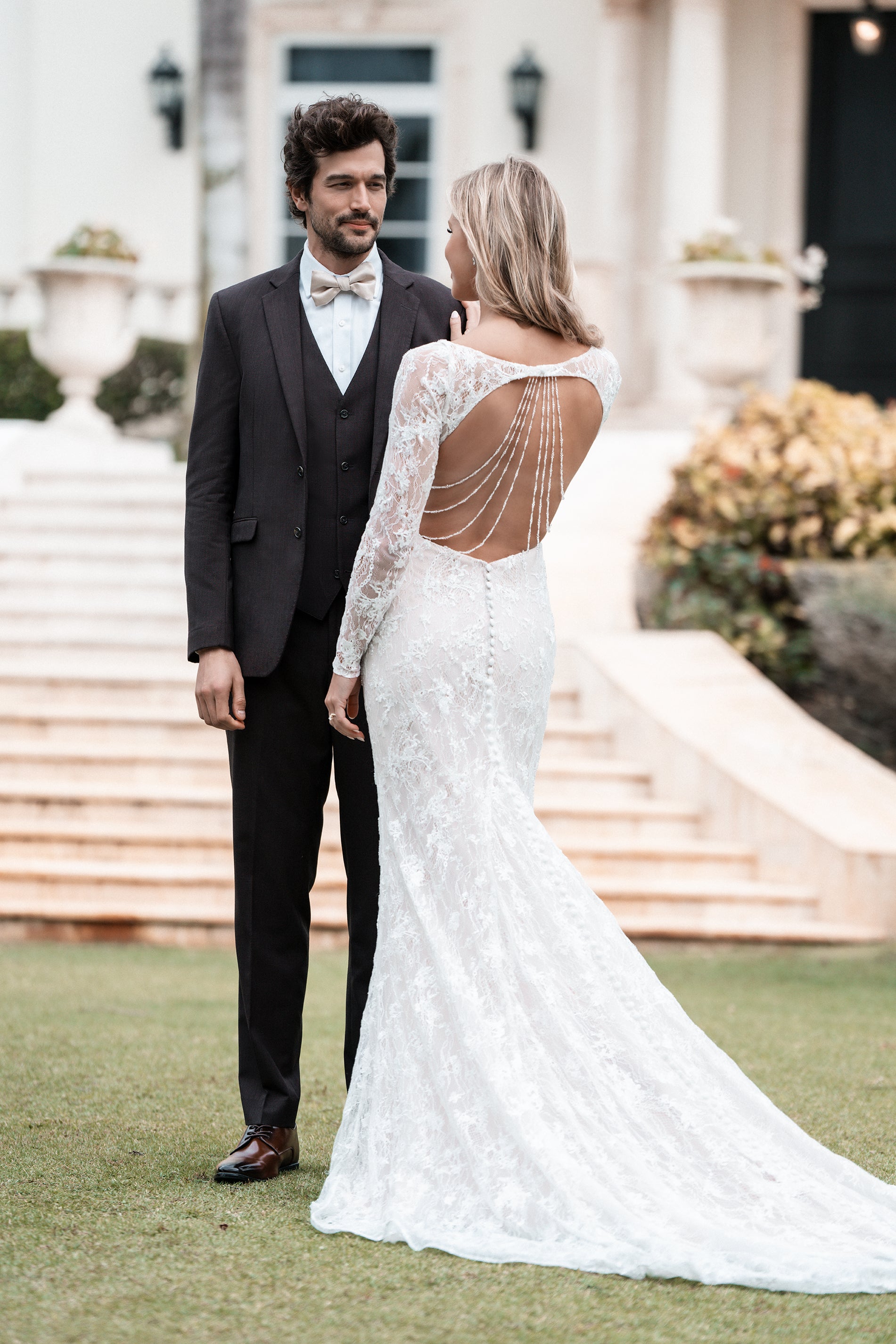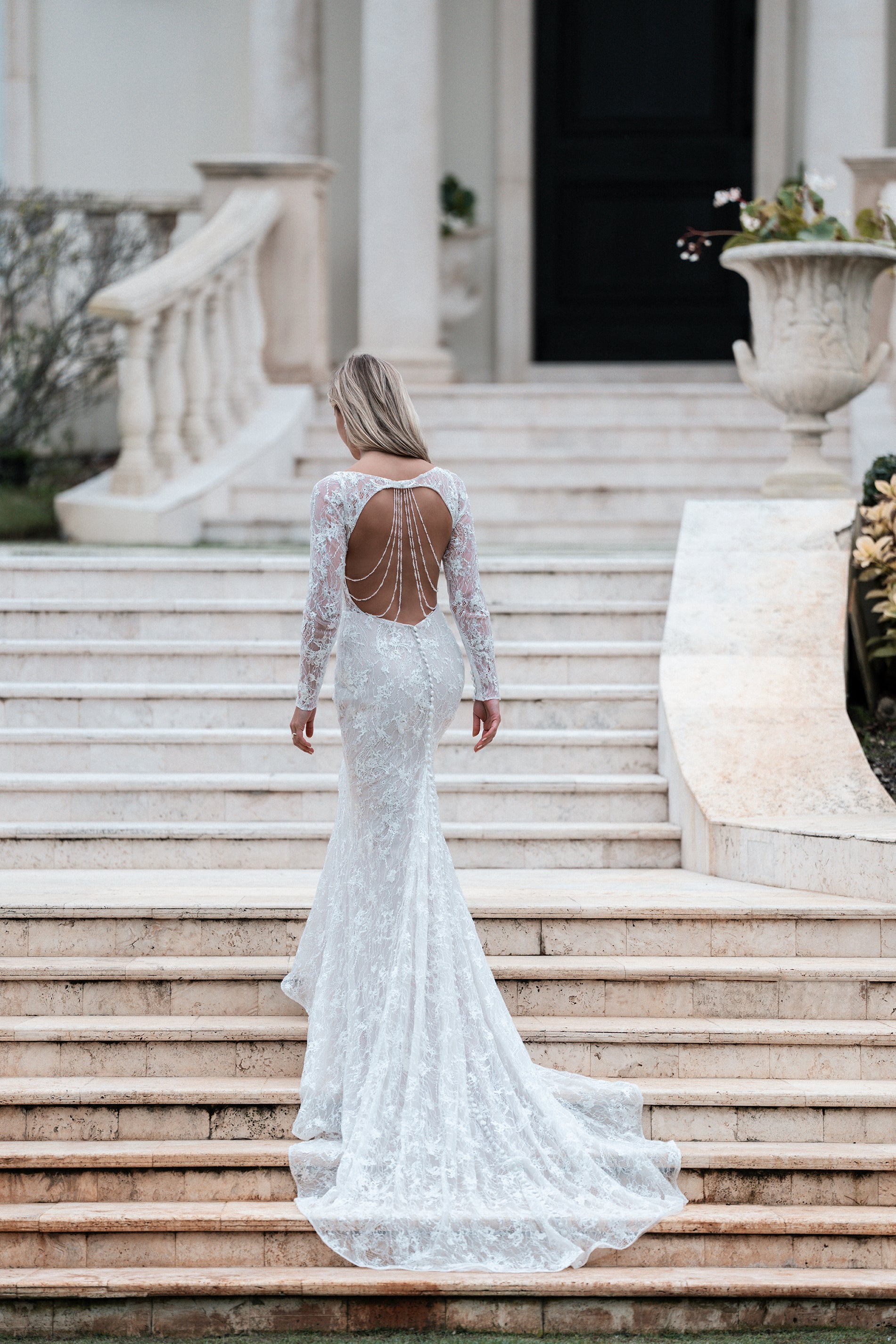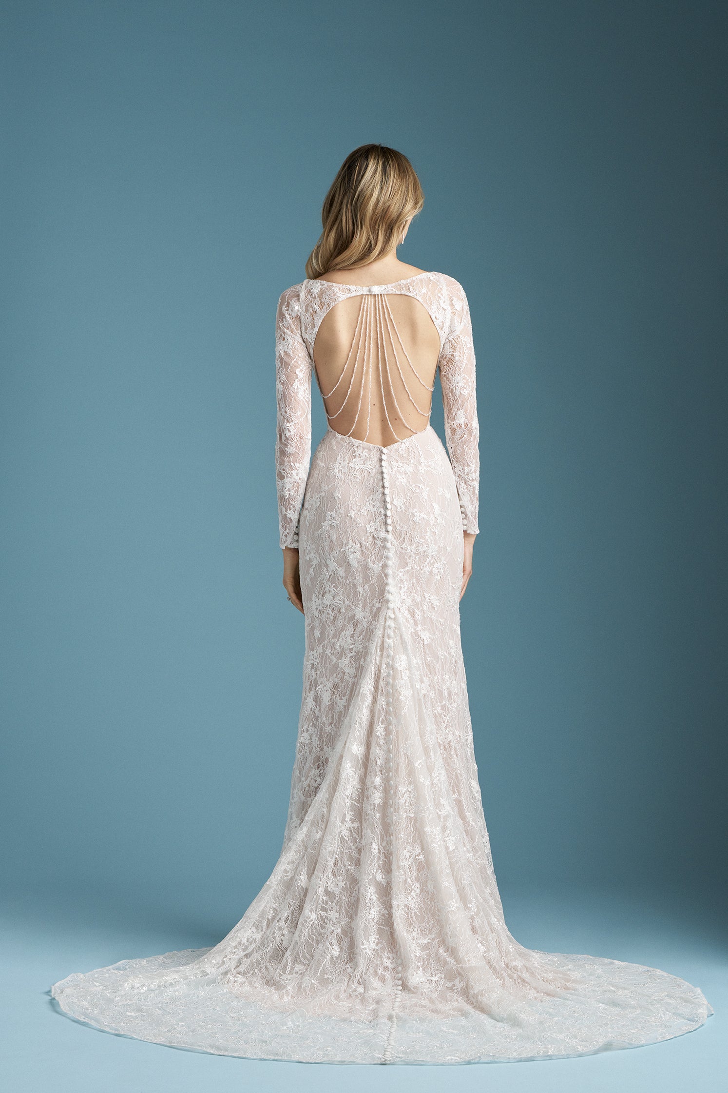Equal parts daring and refined, this sheath gown is crafted from beaded Chantilly lace with a sheer bodice and high scooped neckline. The open back is framed by delicate draped beading for a dramatic finish, while detachable long sleeves offer a touch of versatility. Please note: This style does not allow for custom changes. Read Less