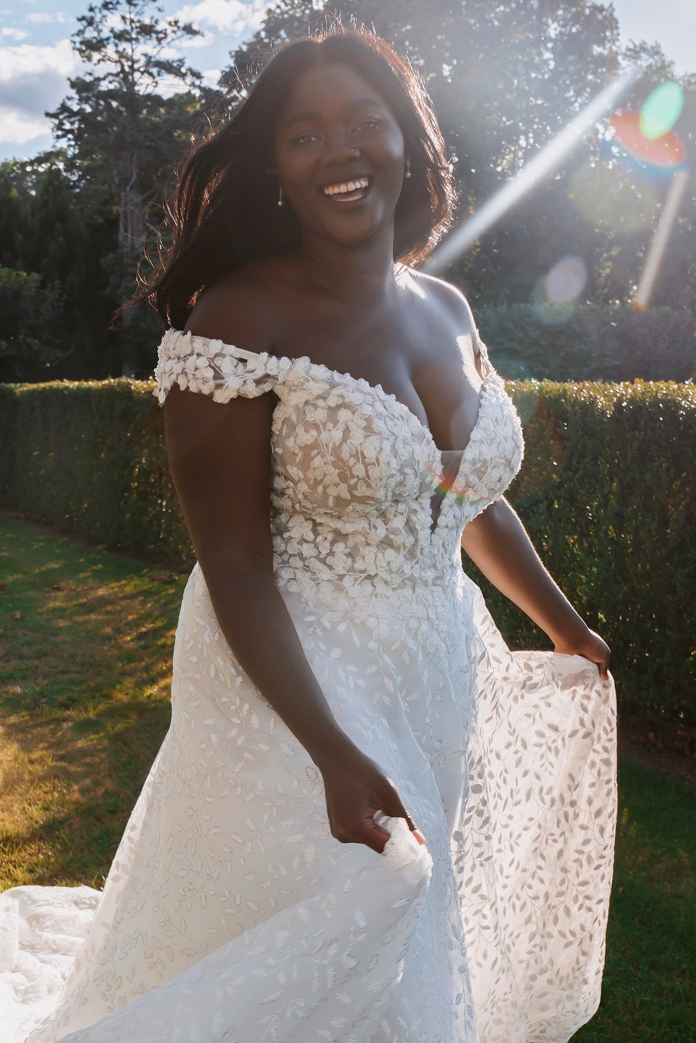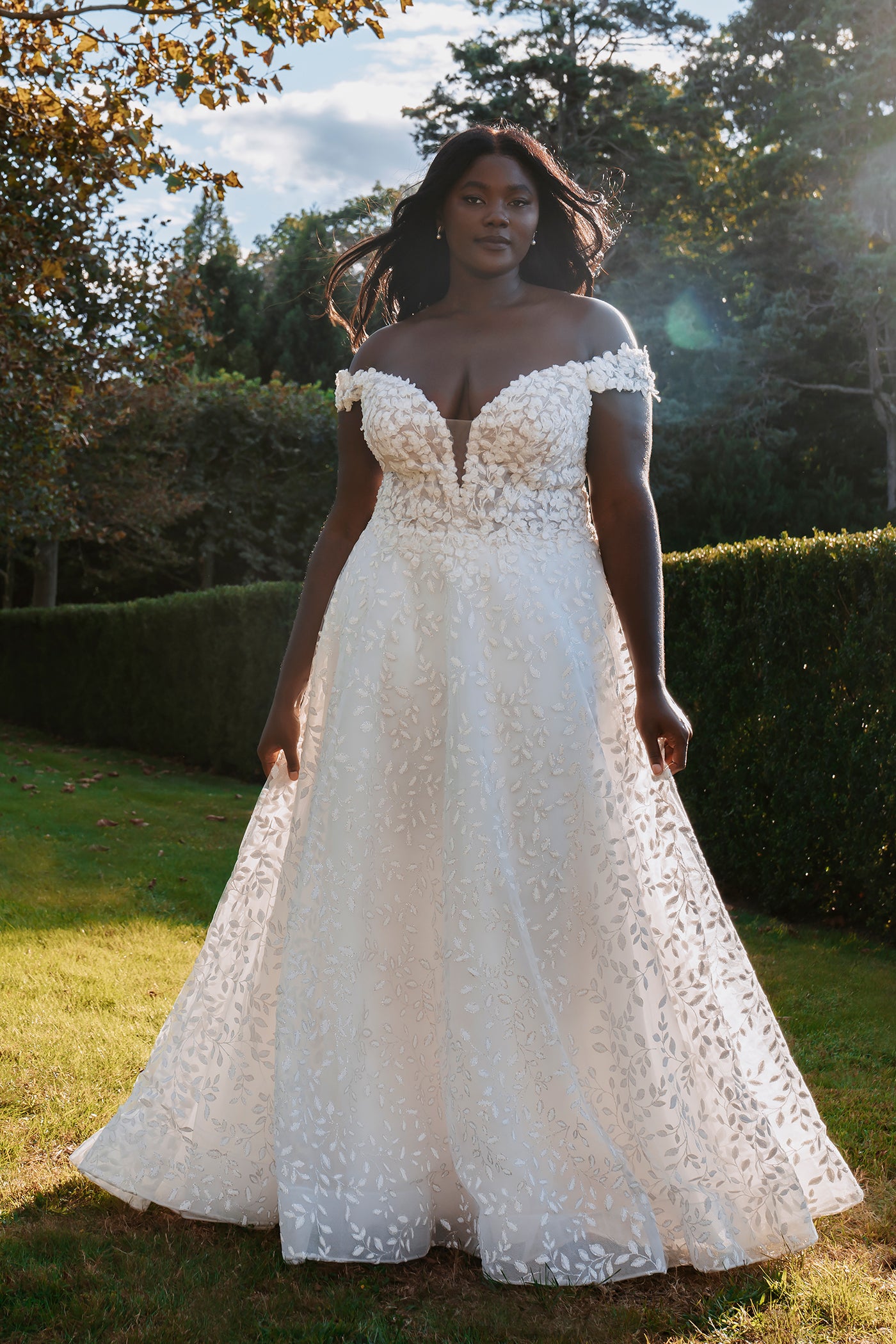 Accented by metallic threaded vines, the bodice of this off-shoulder ballgown is composed of soft overlapping petals for an additional touch of romance.