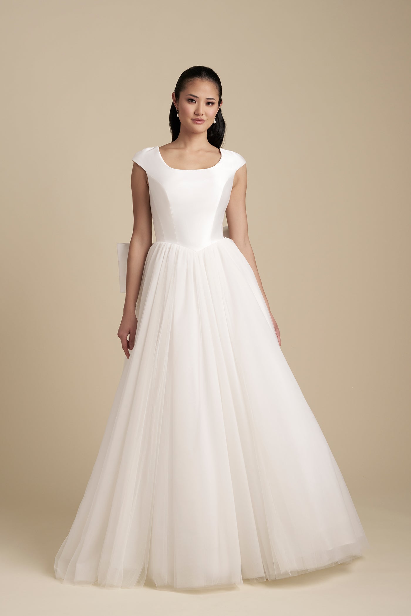 This modest ballgown features a soft scoop neckline and graceful cap sleeves, offering full coverage with quiet elegance. The paneled Mikado bodice is shaped with a subtle Basque waist that flows into a full tulle skirt. A detachable asymmetrical Mikado bow adds a sculptural accent, whi... Read More