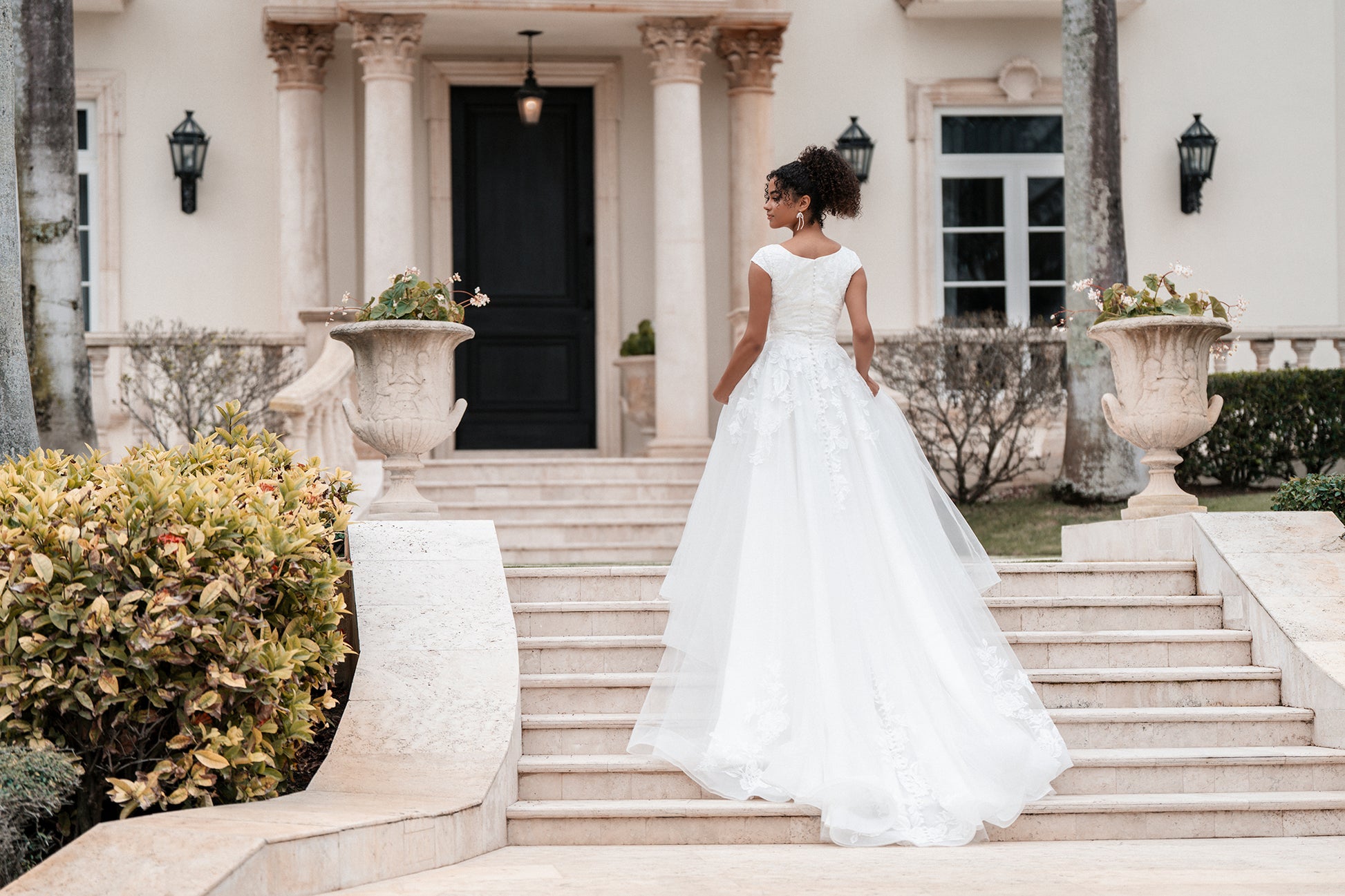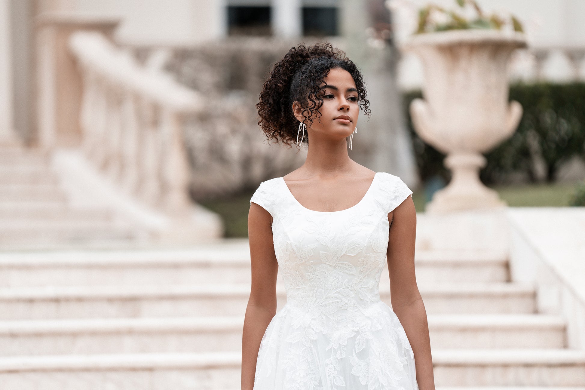 Timeless and graceful, this modest ballgown features delicate cap sleeves and a soft scoop neckline. Elongated lace appliques cascade over layers of sparkle tulle, creating texture and dimension throughout the bodice and skirt. A natural waistline enhances the silhouette, while covered buttons trail down the back for a refined, romantic finish. Read Less