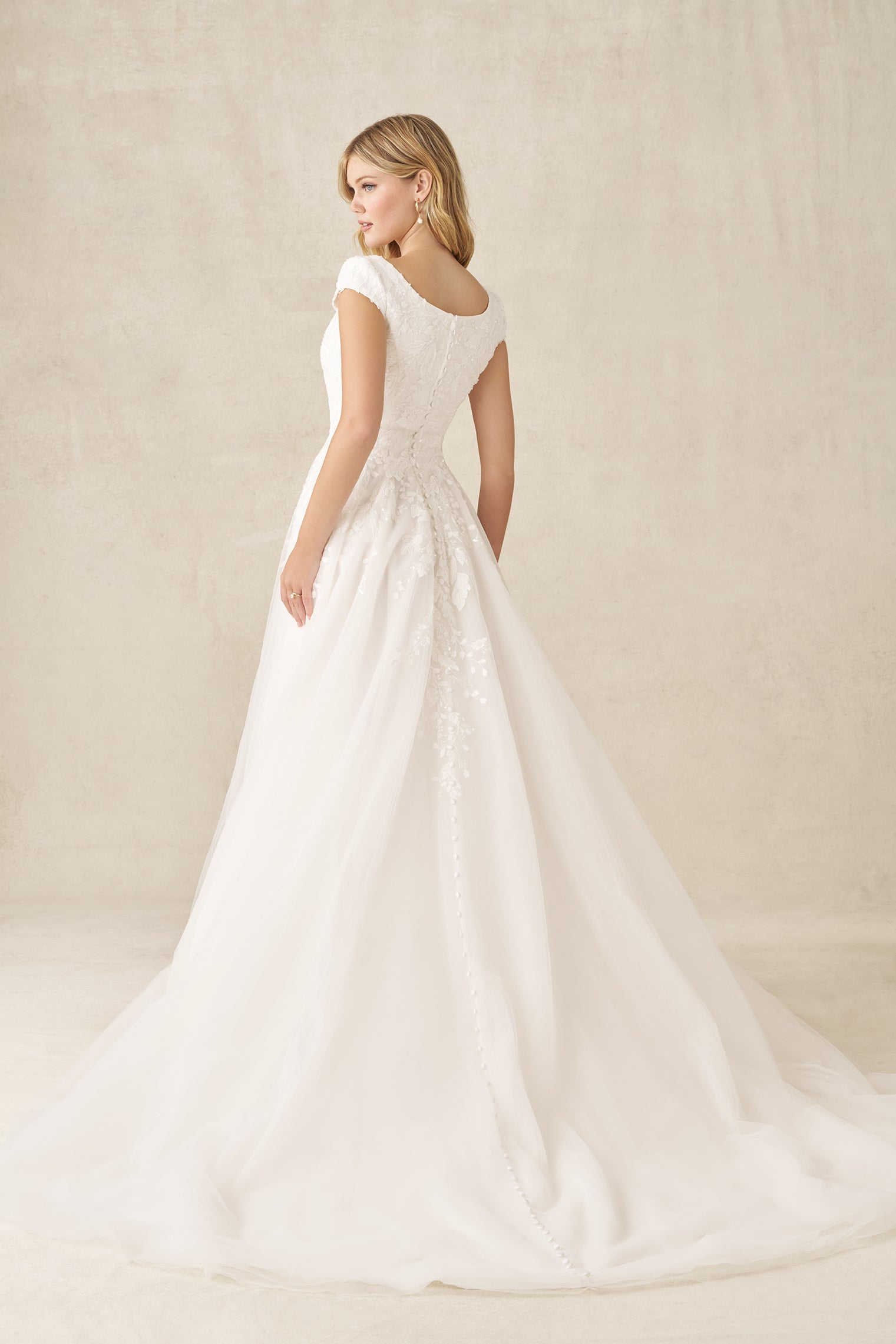 With a modest scooped neckline and cap sleeves, this gown exudes gentle elegance. The lace bodice extends gracefully into the tulle A-line skirt, creating a flowing, refined silhouette that is both romantic and modestly styled.