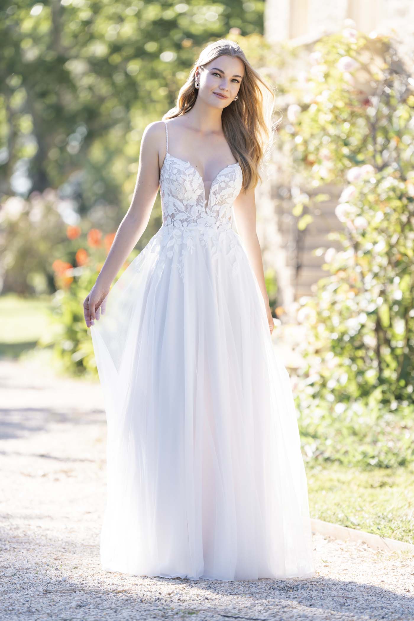 Dimensional beaded lace appliques embellish the bodice of this A-line gown, which is finished with a skirt composed of tulle over crepe.