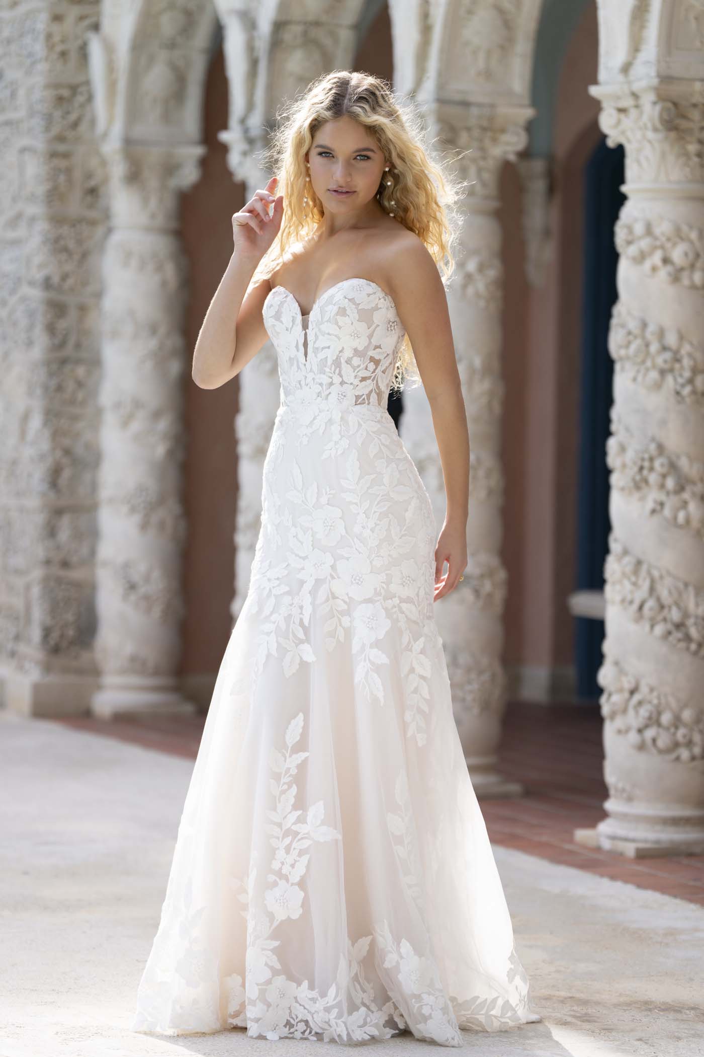 Minimal in silhouette but rich in detail, this strapless sheath gown features a sweetheart neckline and a sheer bodice with exposed boning beneath sequin lace appliques. The soft tulle layers fall from a natural waistline into a clean, floor-length hem for an effortlessly refined finish... Read More
