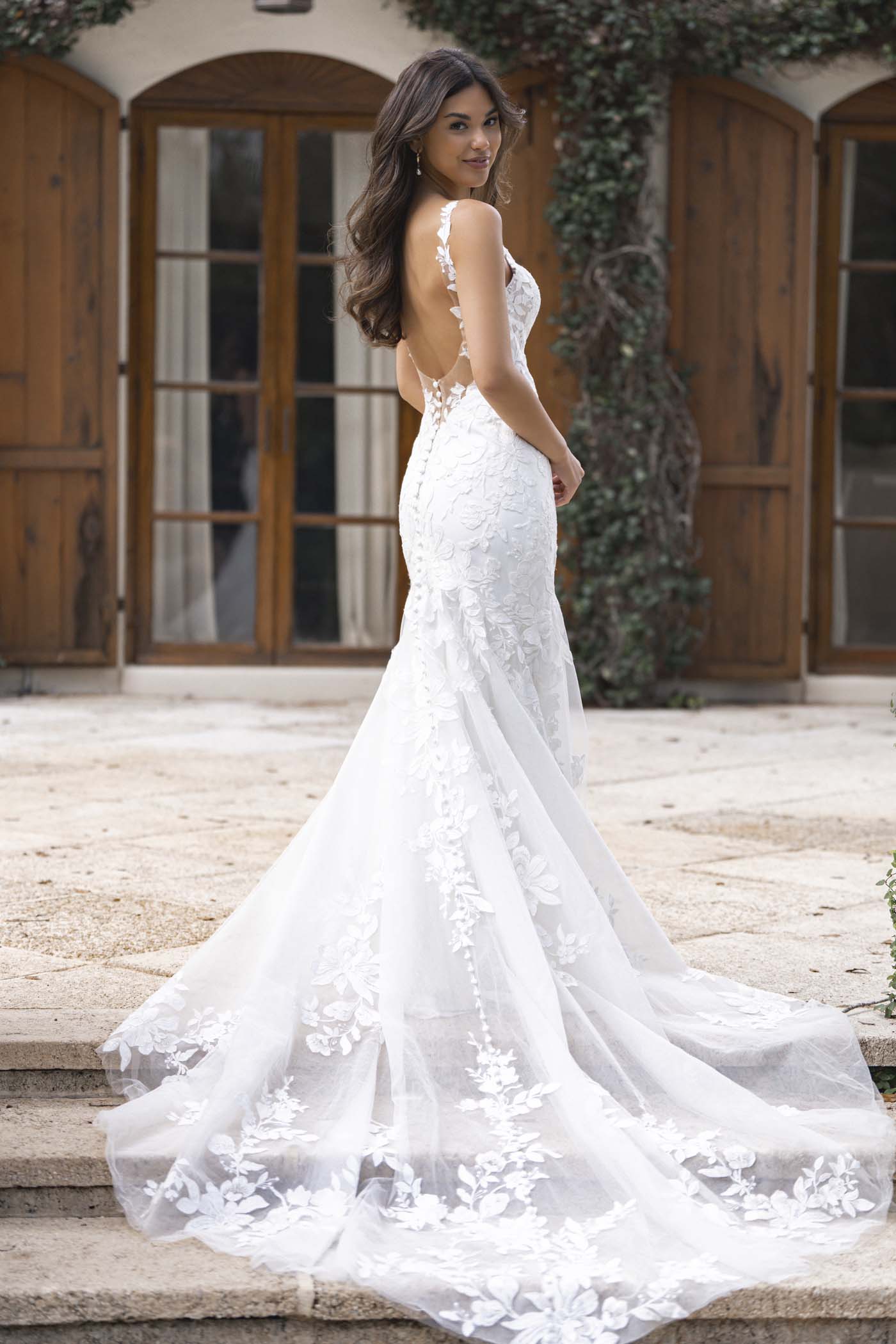 This fit and flare gown offers a refined take on romance, featuring a sleeveless, V-neckline. Sequin lace appliques layer over Chantilly lace and tulle, creating soft dimension from bodice to hem. Finished with a natural waistline and a graceful floor-length skirt, the silhouette flatte... Read More