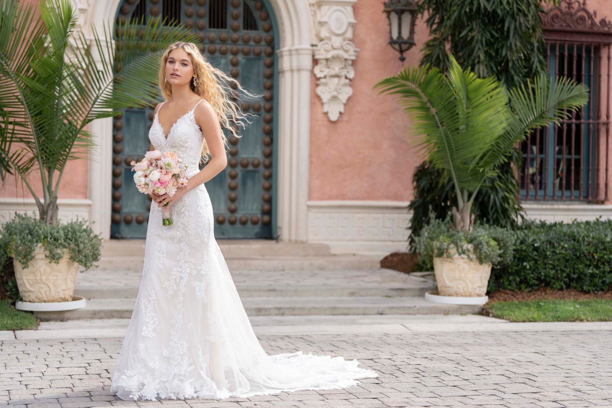 This sheath gown is rich in detail, featuring a V-neckline and delicate spaghetti straps. Beaded and sequin lace appliques are layered over Chantilly lace and sparkle netting, creating depth and light-catching texture. A natural waistline completes the silhouette with a flattering, refined finish. Read Less