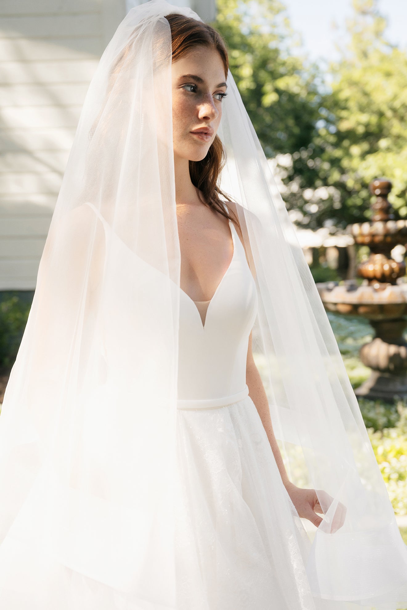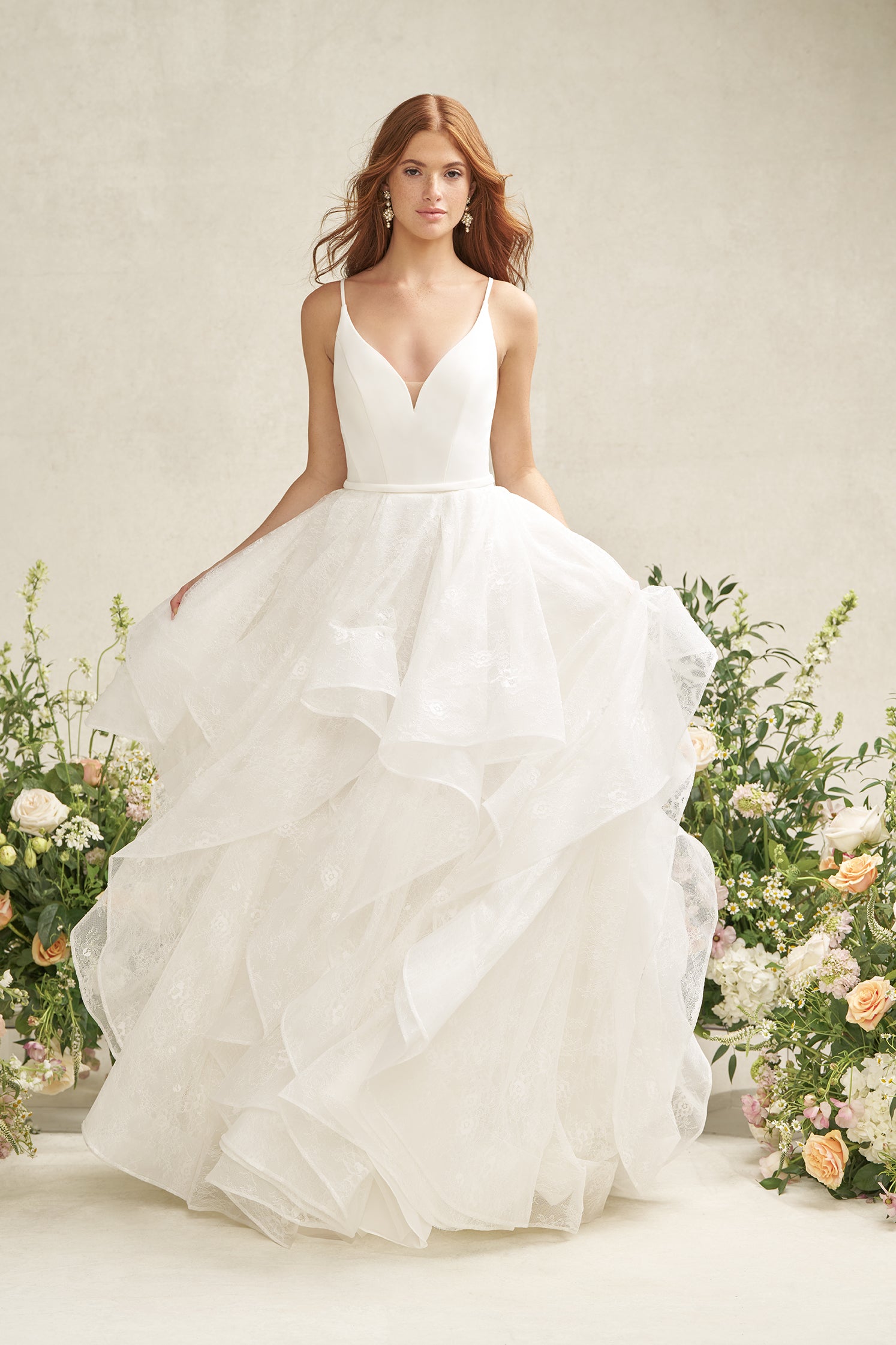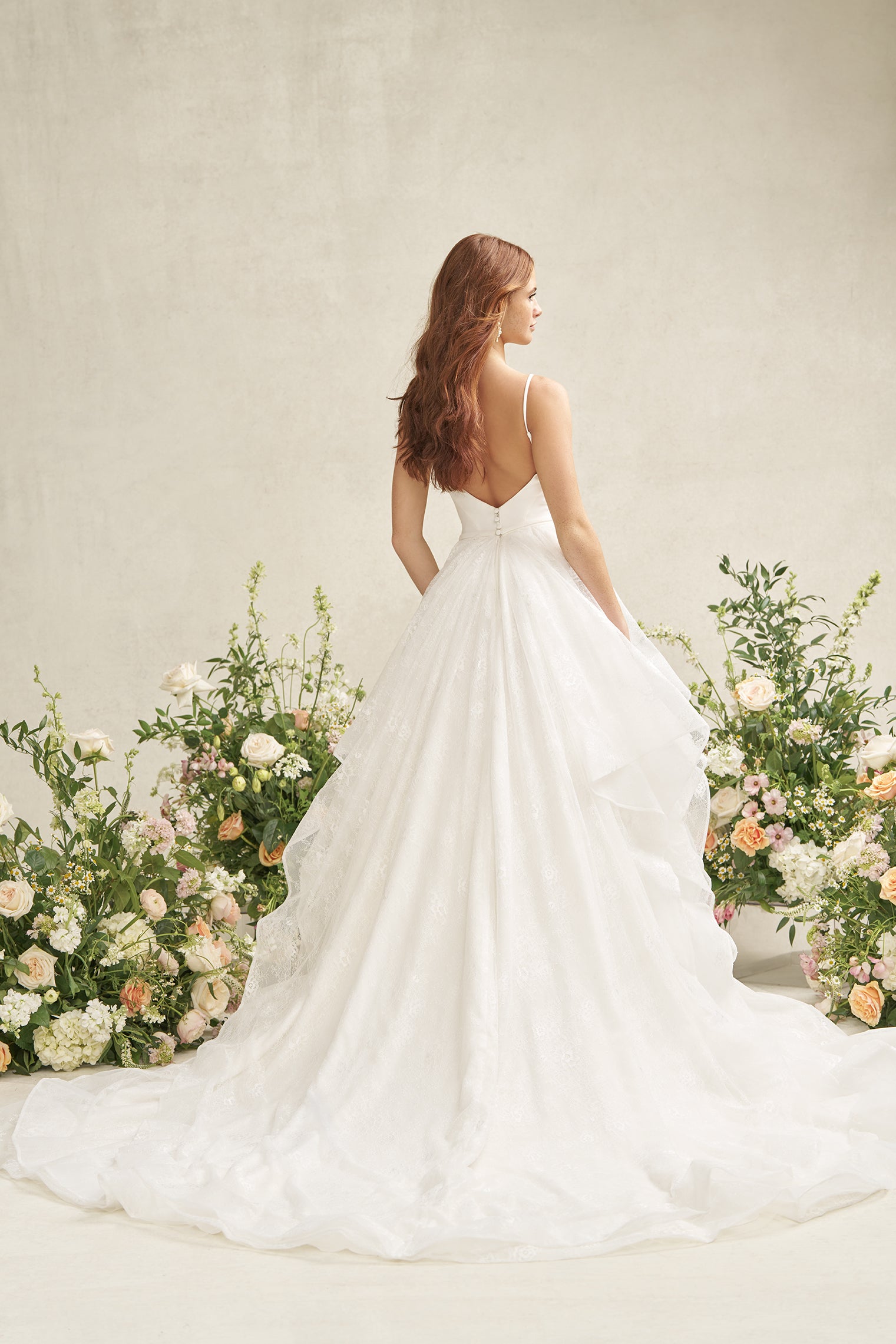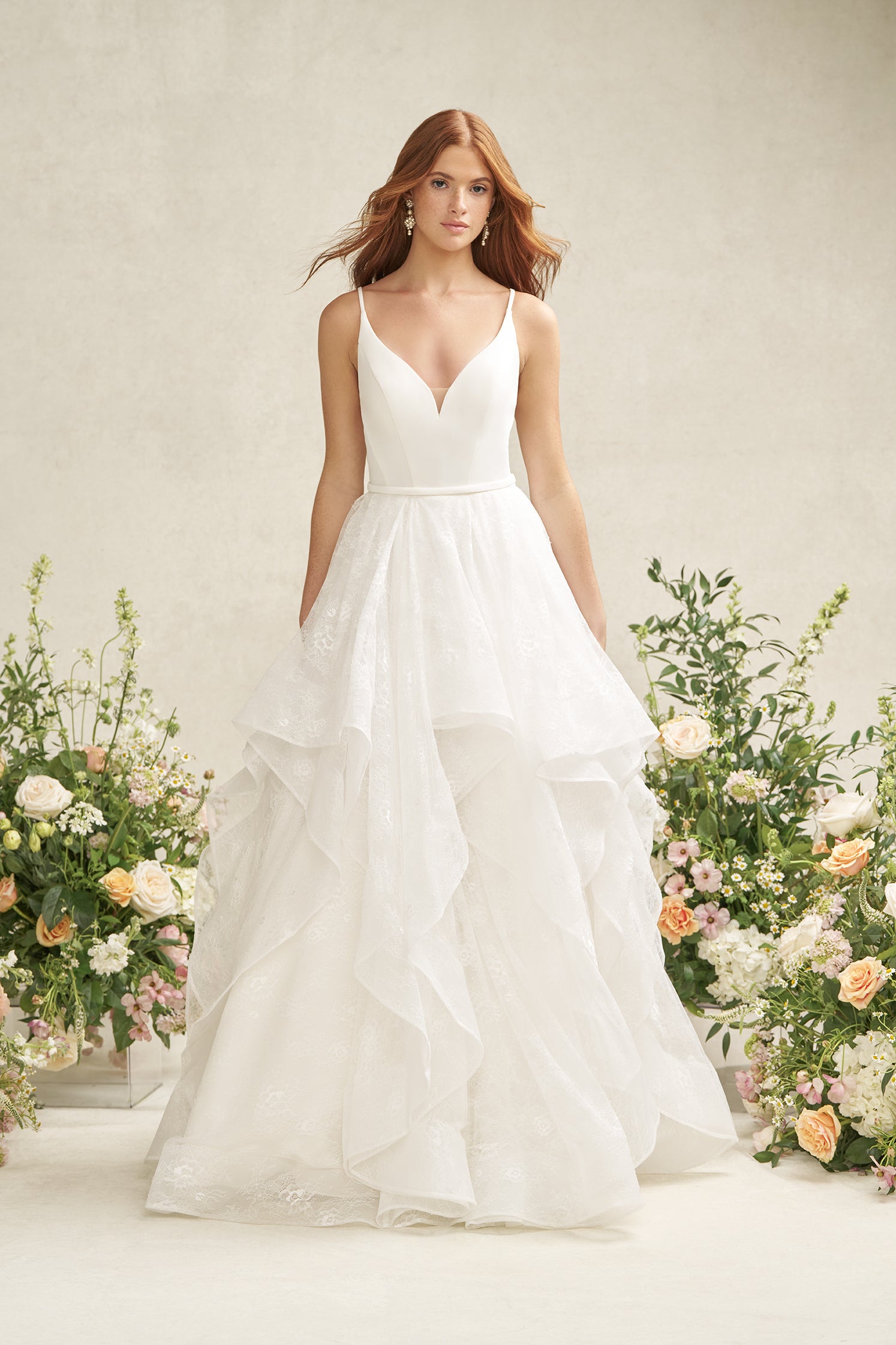 Softly structured and effortlessly graceful, this A-line gown pairs a sleek crepe bodice with a Chantilly lace skirt that falls into a sweeping handkerchief hem. The V-neckline and delicate spaghetti straps create a light, feminine frame, while the detachable belt defines the natural waist for a flattering finish. With its airy movement and gentle contrast of textures, this gown feels modern yet timeless—an elevated take on romantic design. Read Less