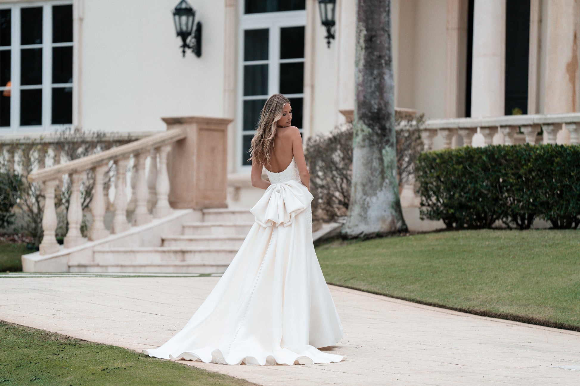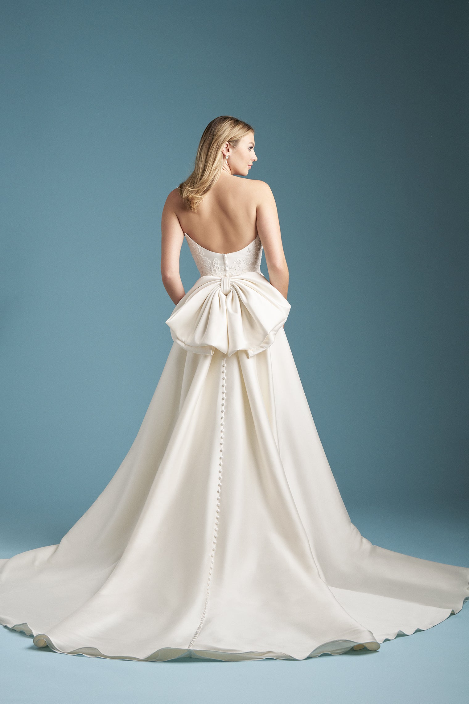 Crafted in luxurious Mikado to perfectly match style A1362, this detachable train offers a seamless, versatile transition from ceremony to reception. Covered buttons trail down the length of the train, finishing in a dramatic draped bow for a striking, romantic statement.