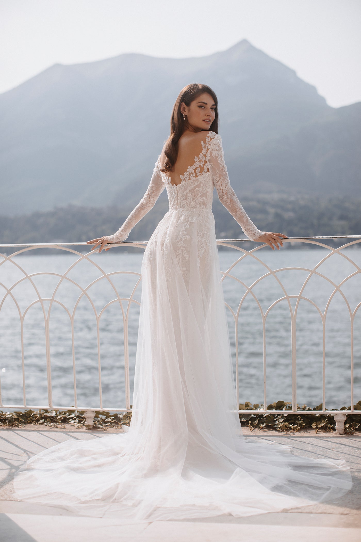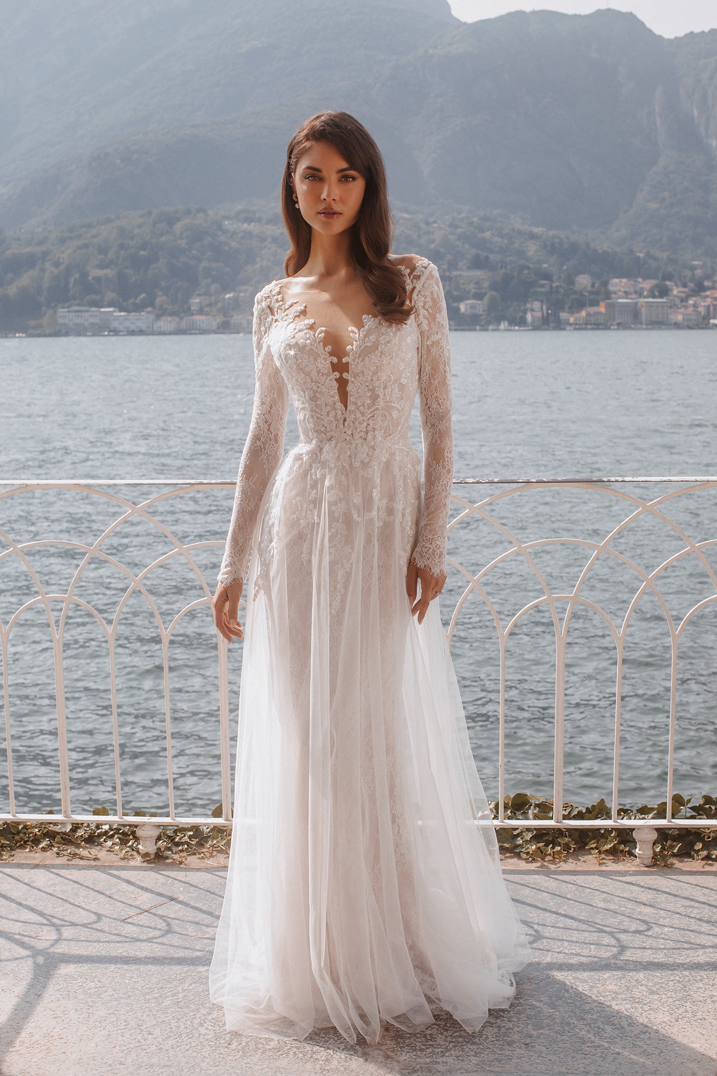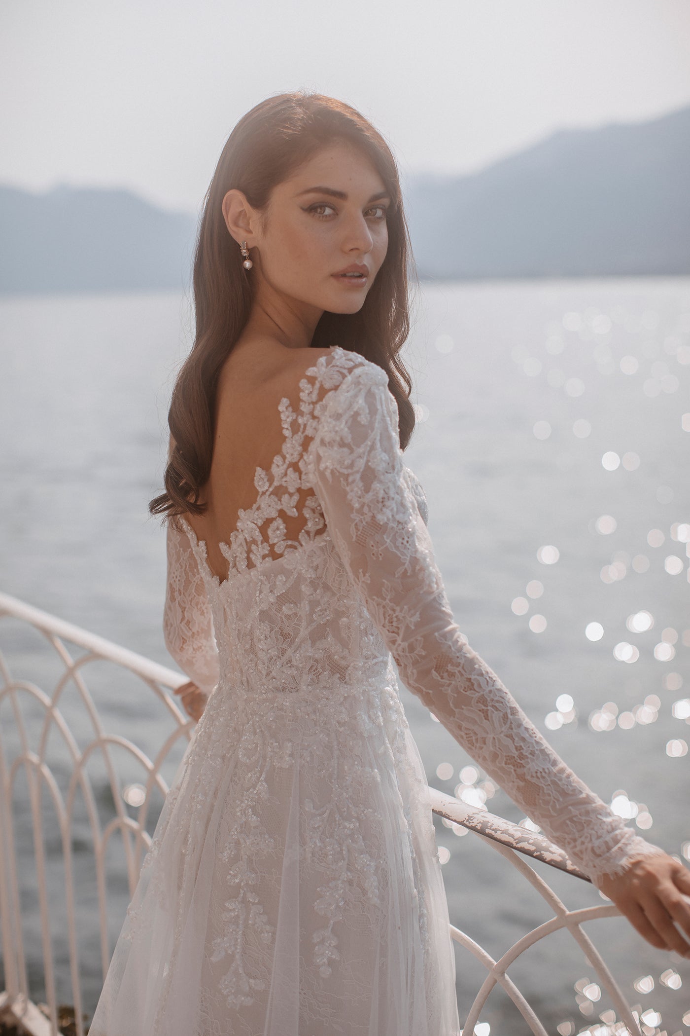 Sequined lace delicately embellishes the long sleeves and bodice of Mae's Chantilly lace and tulle silhouette.