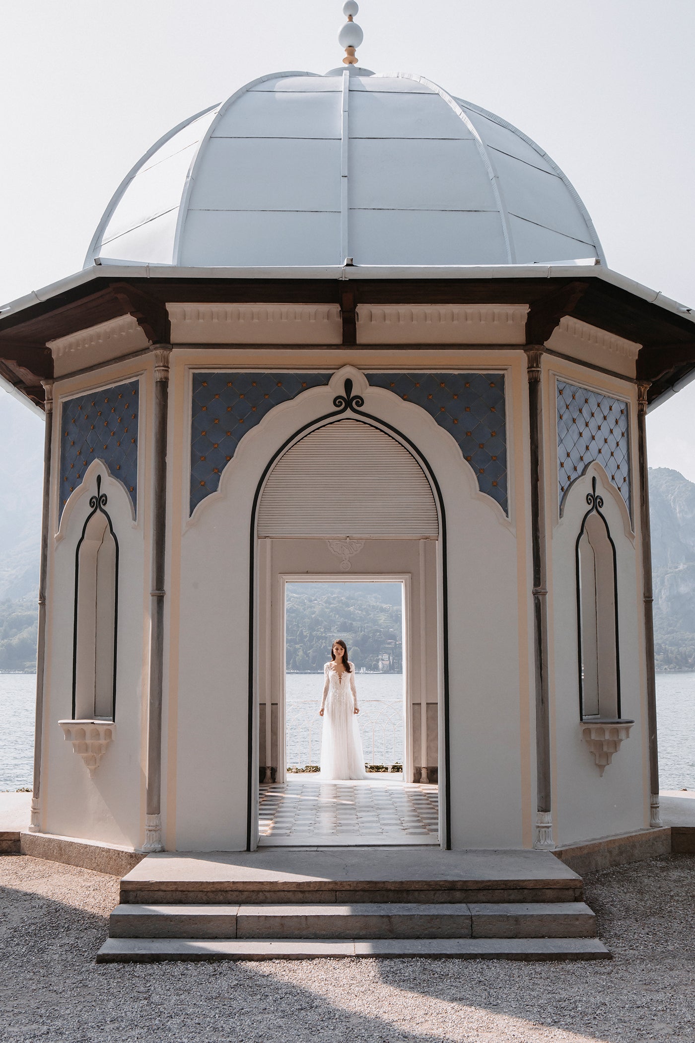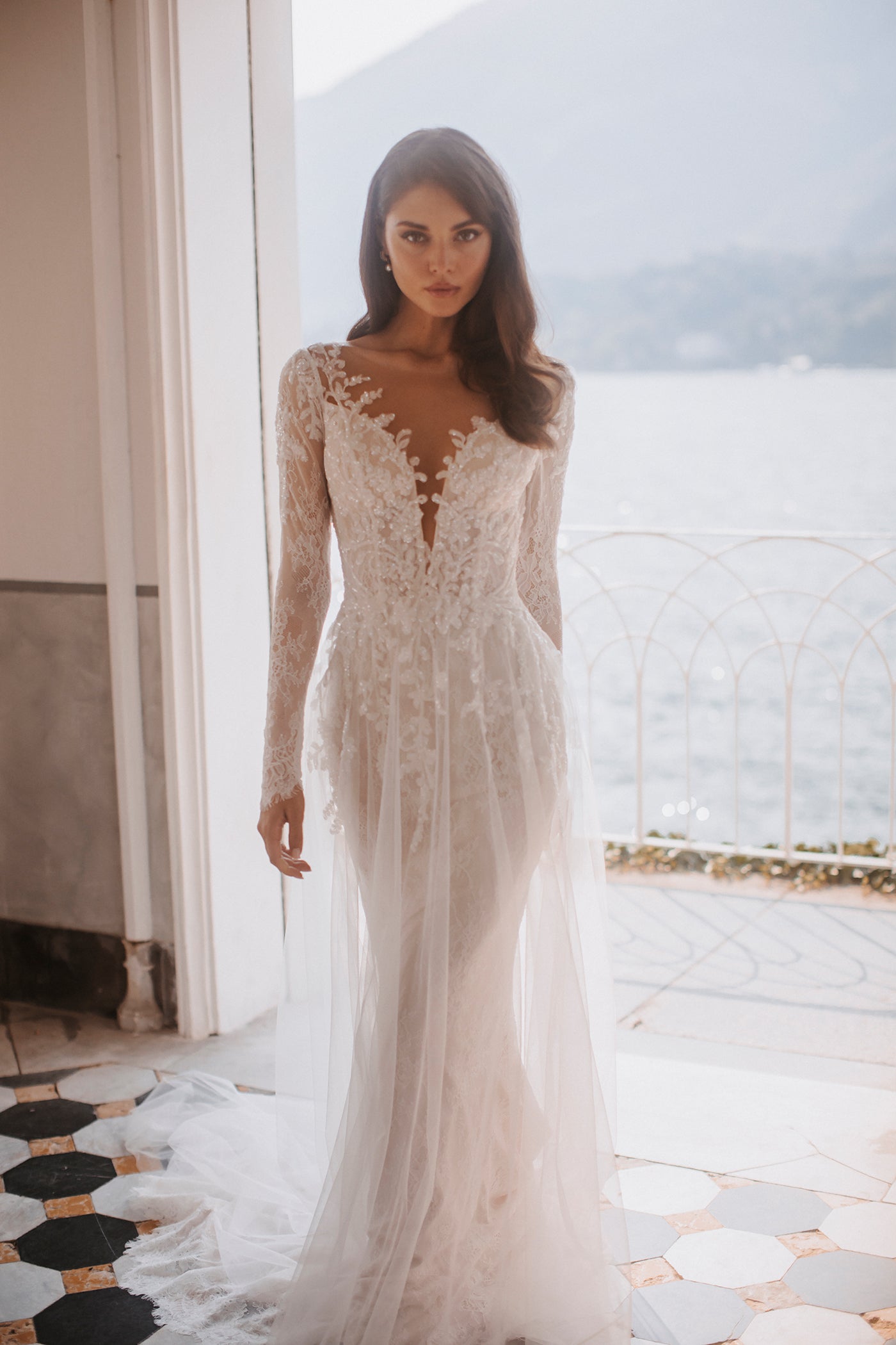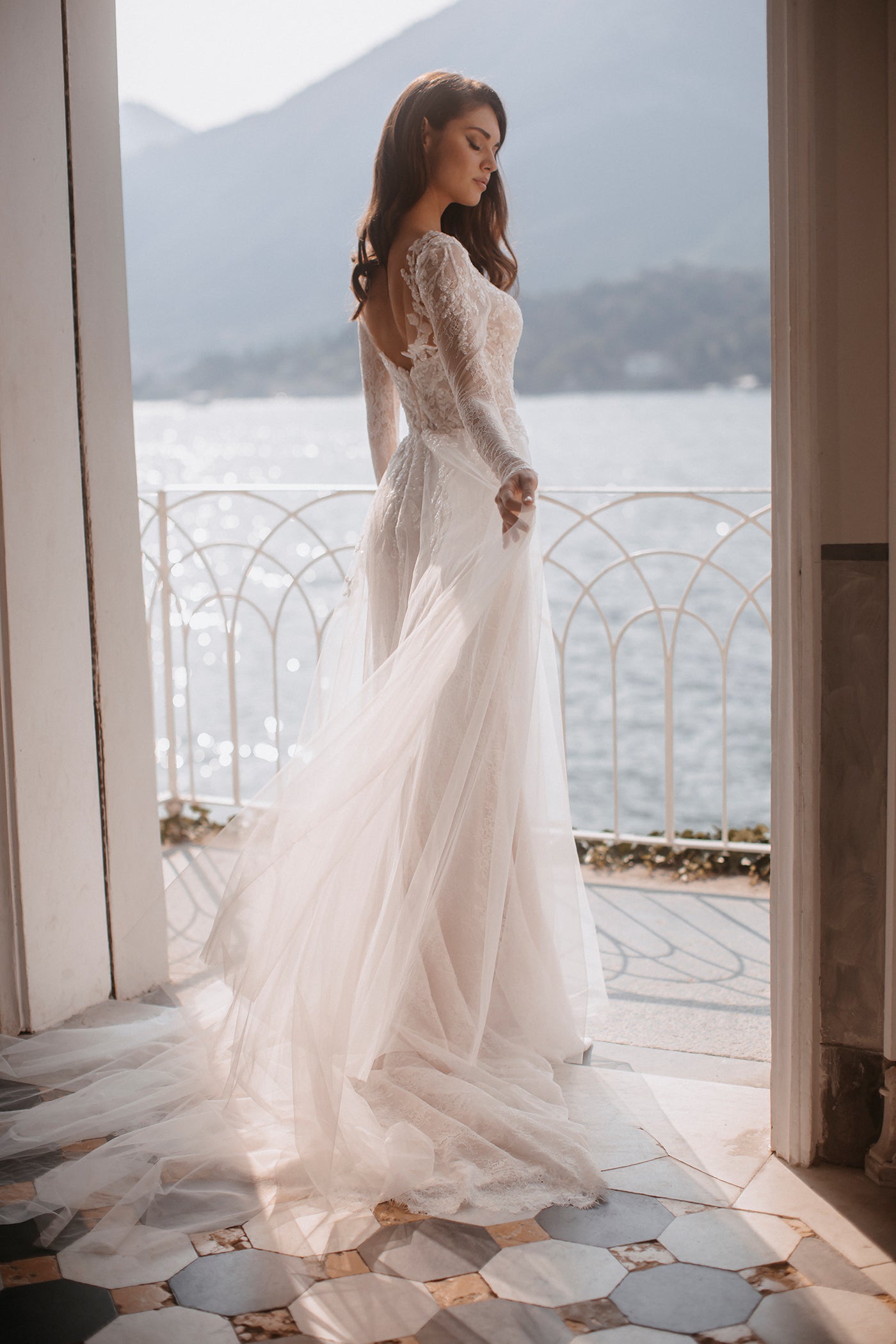 Sequined lace delicately embellishes the long sleeves and bodice of Mae's Chantilly lace and tulle silhouette.