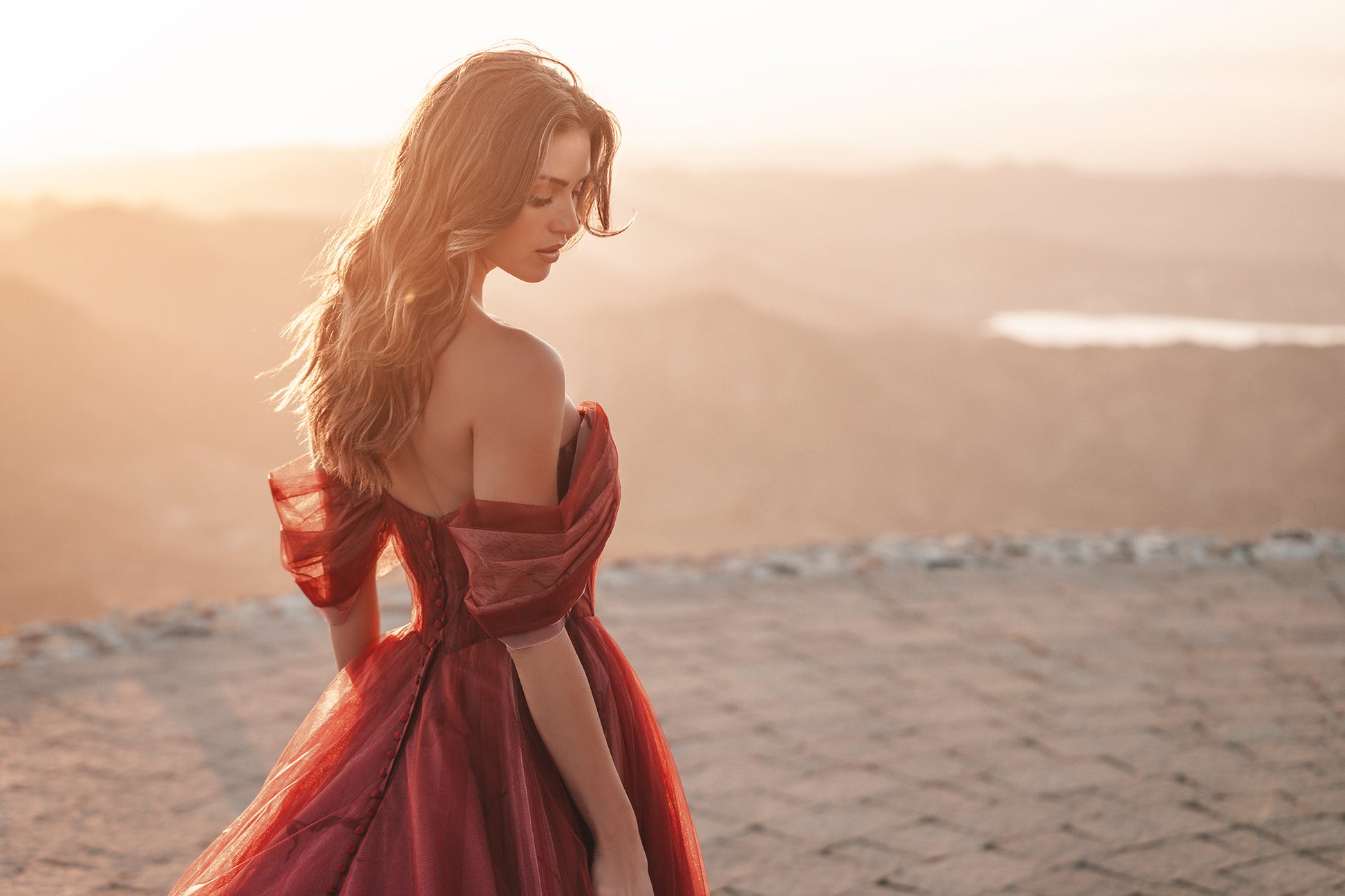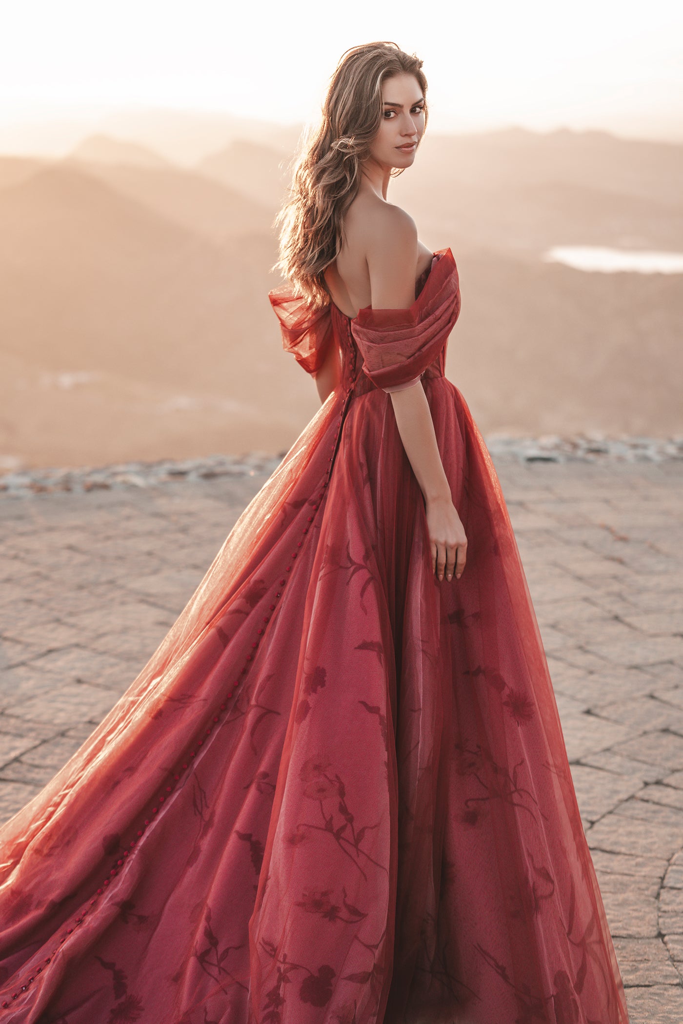 Uninhibited, wildly beautiful. This off-shoulder bridal ballgown is both ethereal and unforgettable in ivory and wine red.