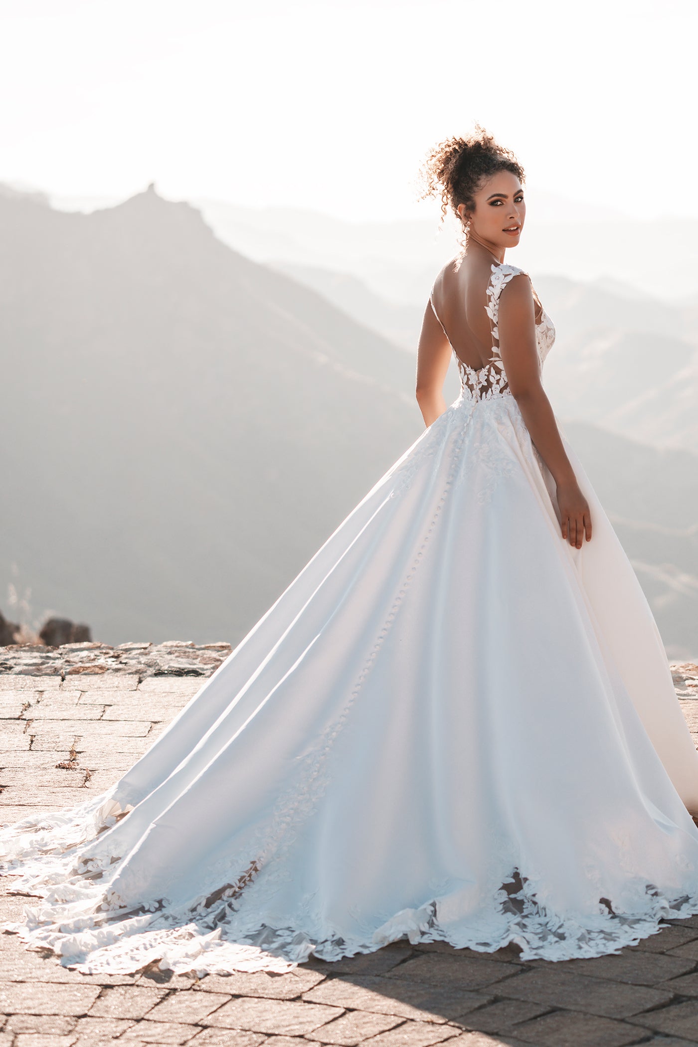 Regal dove satin, paired with sequined lace appliques, crafts a bridal ballgown worthy of royalty.