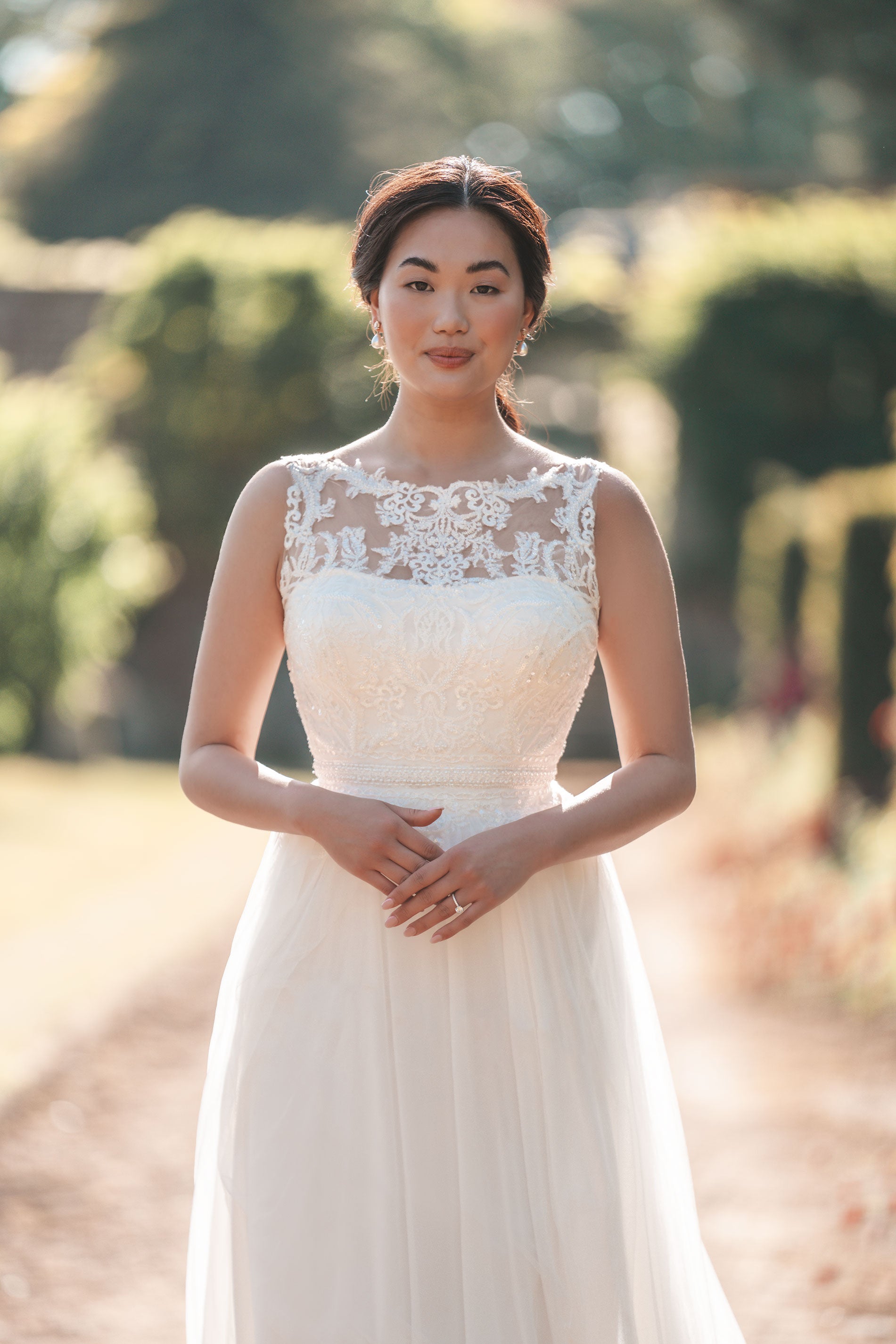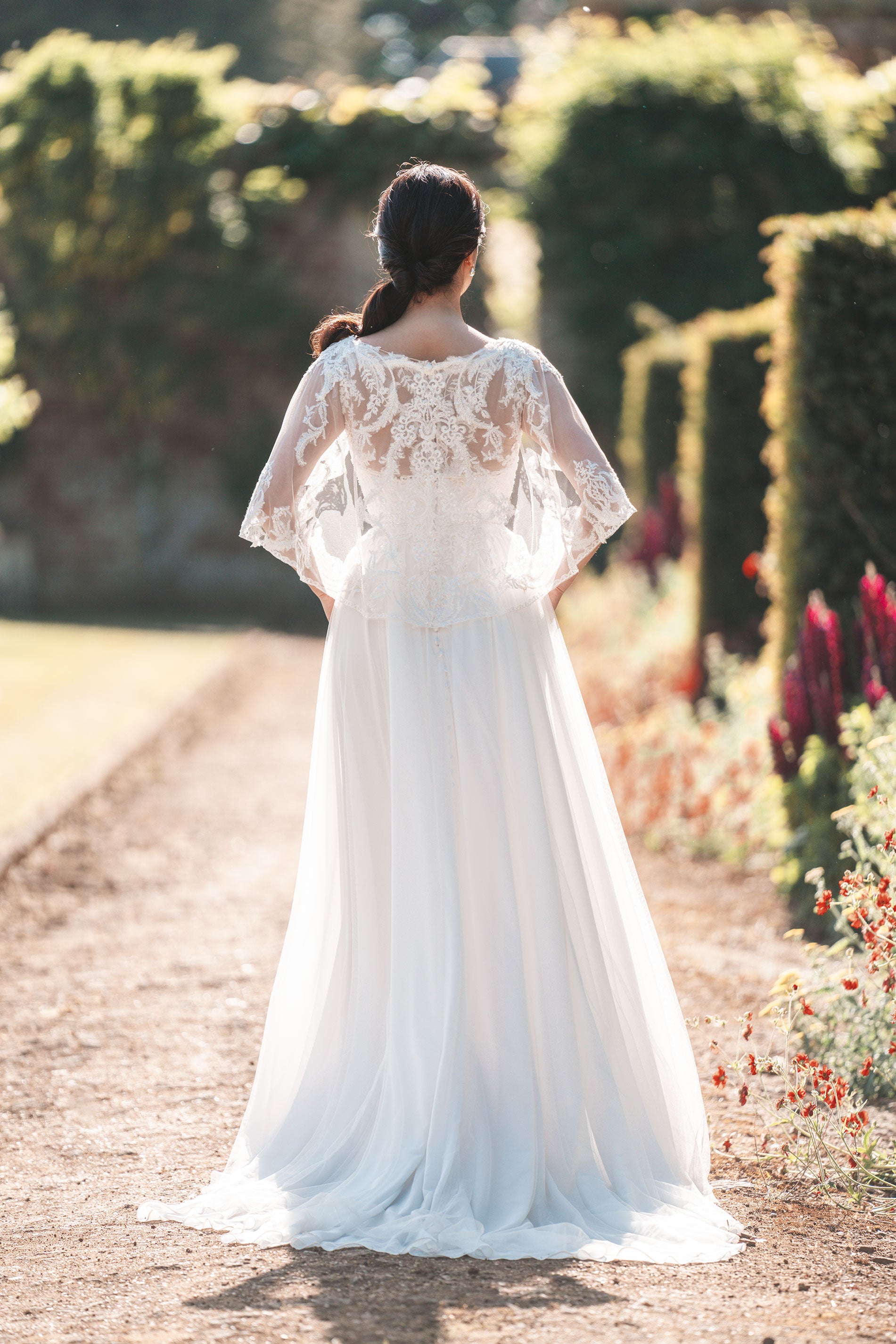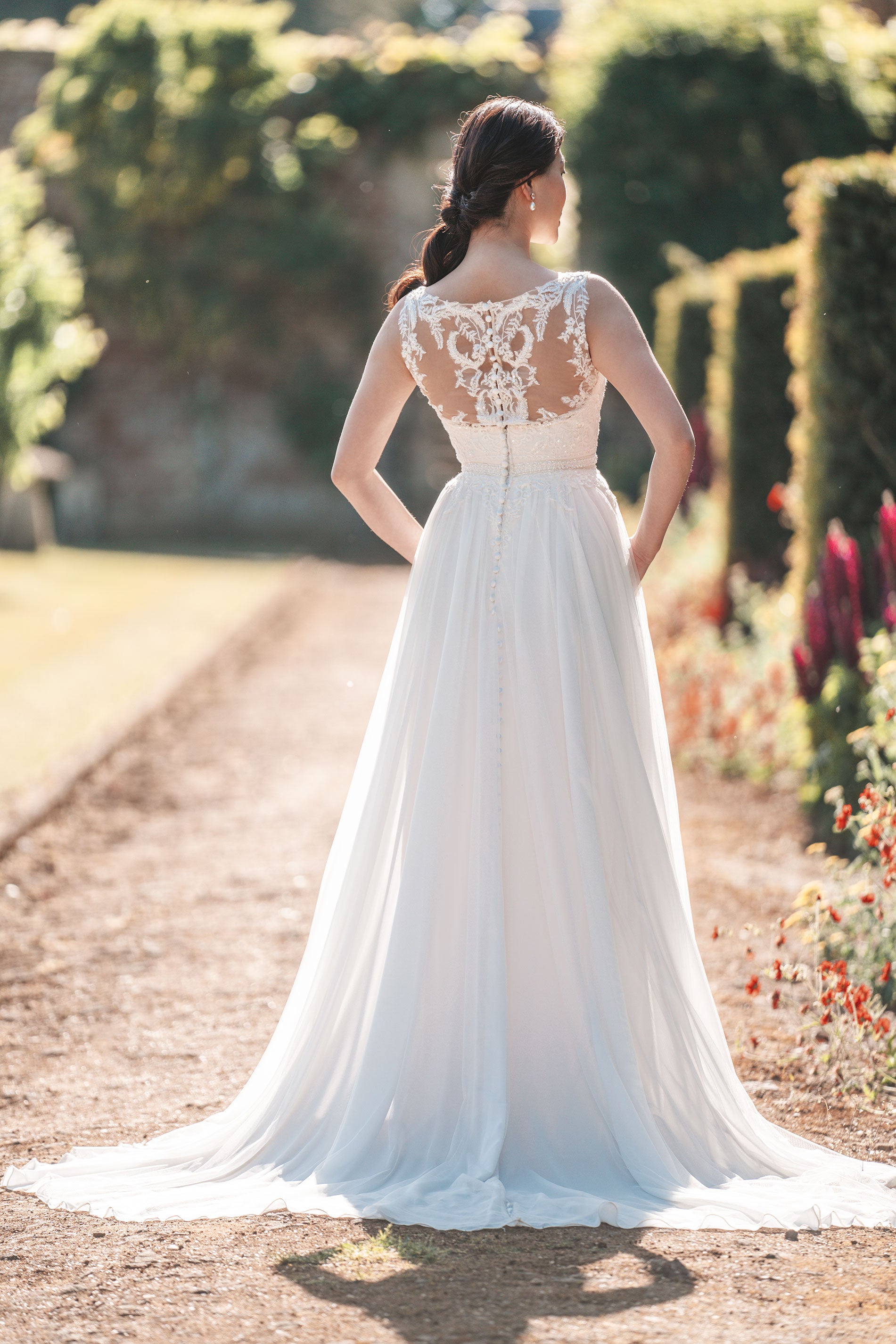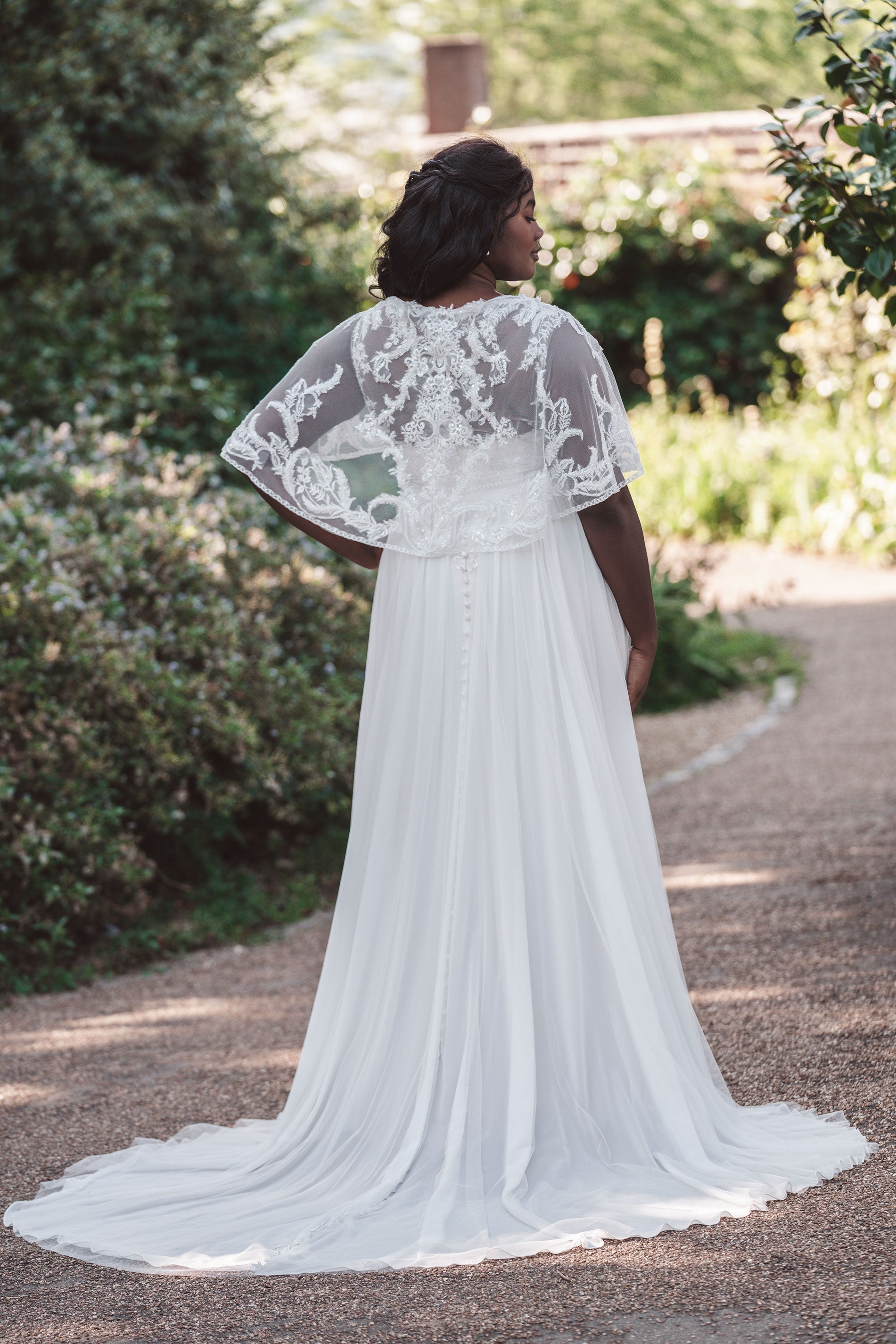Beaded and sequined lace appliques adorn the soft A-line silhouette of this elegant bridal gown; a skirt of soft tulle is banded at the waist, while the sleeveless illusion bodice is paired with a matching lace capelet.