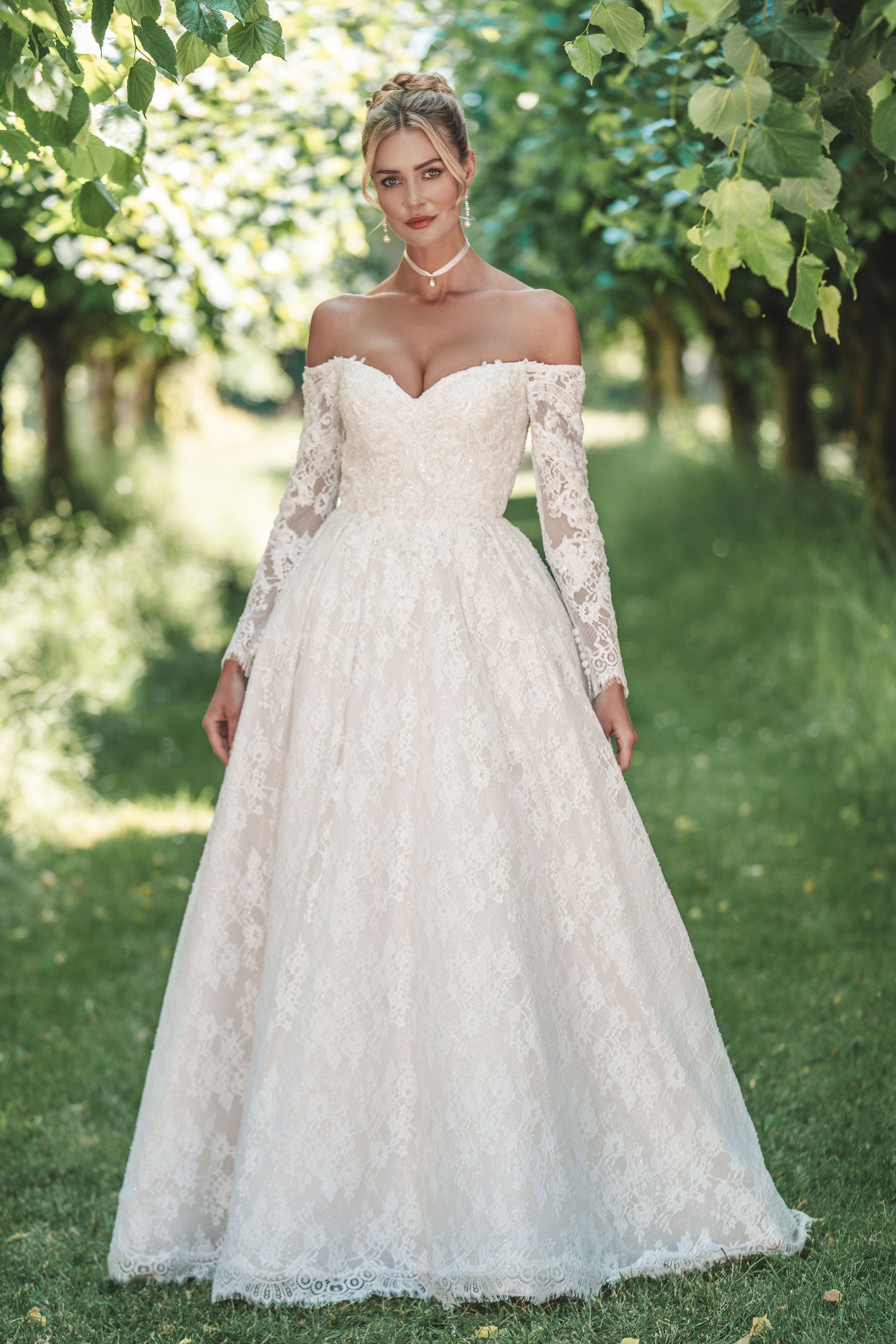 This jaw-dropping lace and tulle ballgown is indeed the object of all our desires this season. And the gorgeous neckline steals the show, with a subtle V-neck that seamlessly blends with off-shoulder lace sleeves.