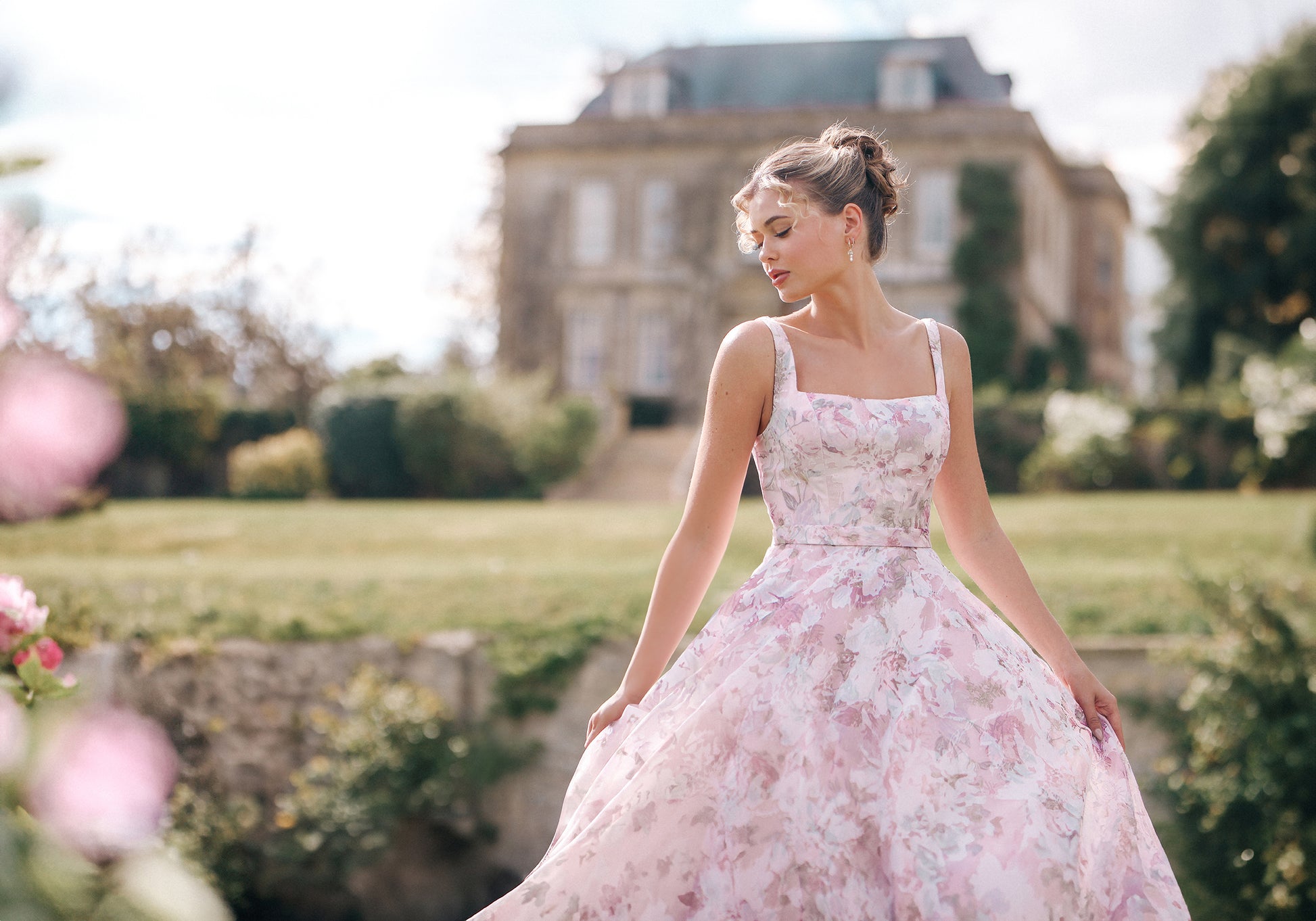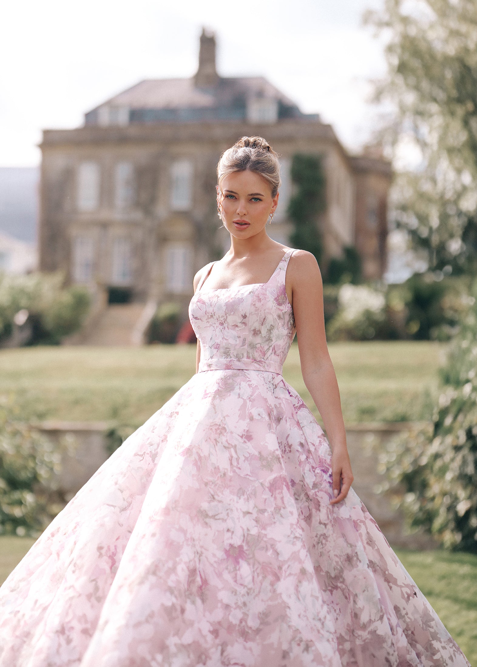 The Penelope gown is a vision of charm in printed organza. This sleeveless A-line wedding dress features a square neckline and natural waistline, flowing into a graceful, floor-length skirt. Light as air yet striking in its detail, the printed organza creates a soft, romantic impression that feels utterly unique. Like Penelope Featherington herself, this bridal gown carries an unexpected depth—gentle on the surface, but with a quiet confidence and cleverness beneath. A dress designed not only to enchant, but to leave a lasting impression long after the moment has passed. Read Less