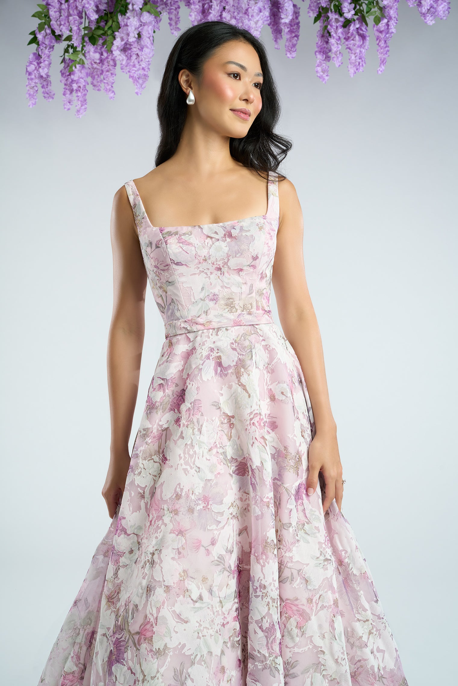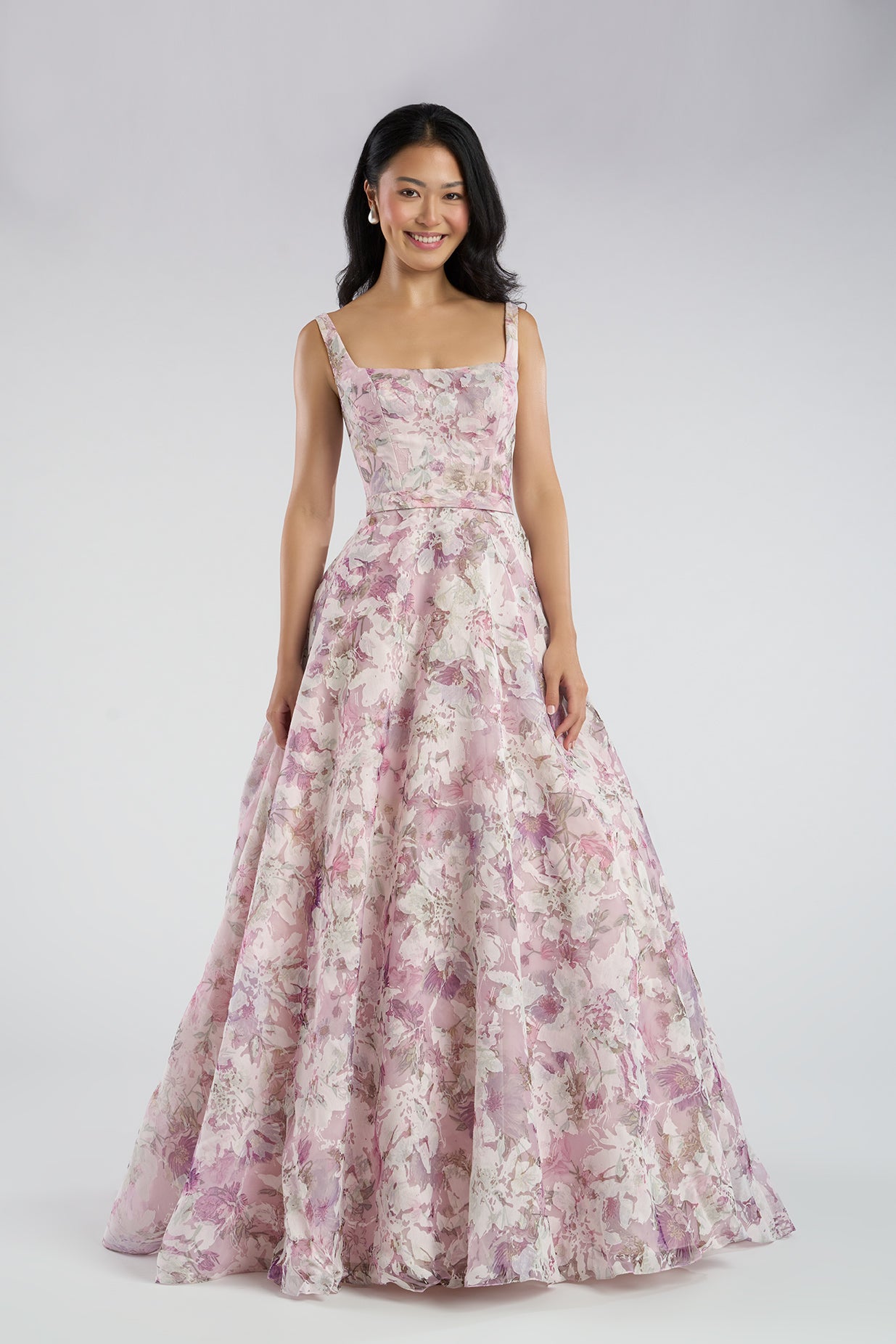 The Penelope gown is a vision of charm in printed organza. This sleeveless A-line wedding dress features a square neckline and natural waistline, flowing into a graceful, floor-length skirt. Light as air yet striking in its detail, the printed organza creates a soft, romantic impression... Read More