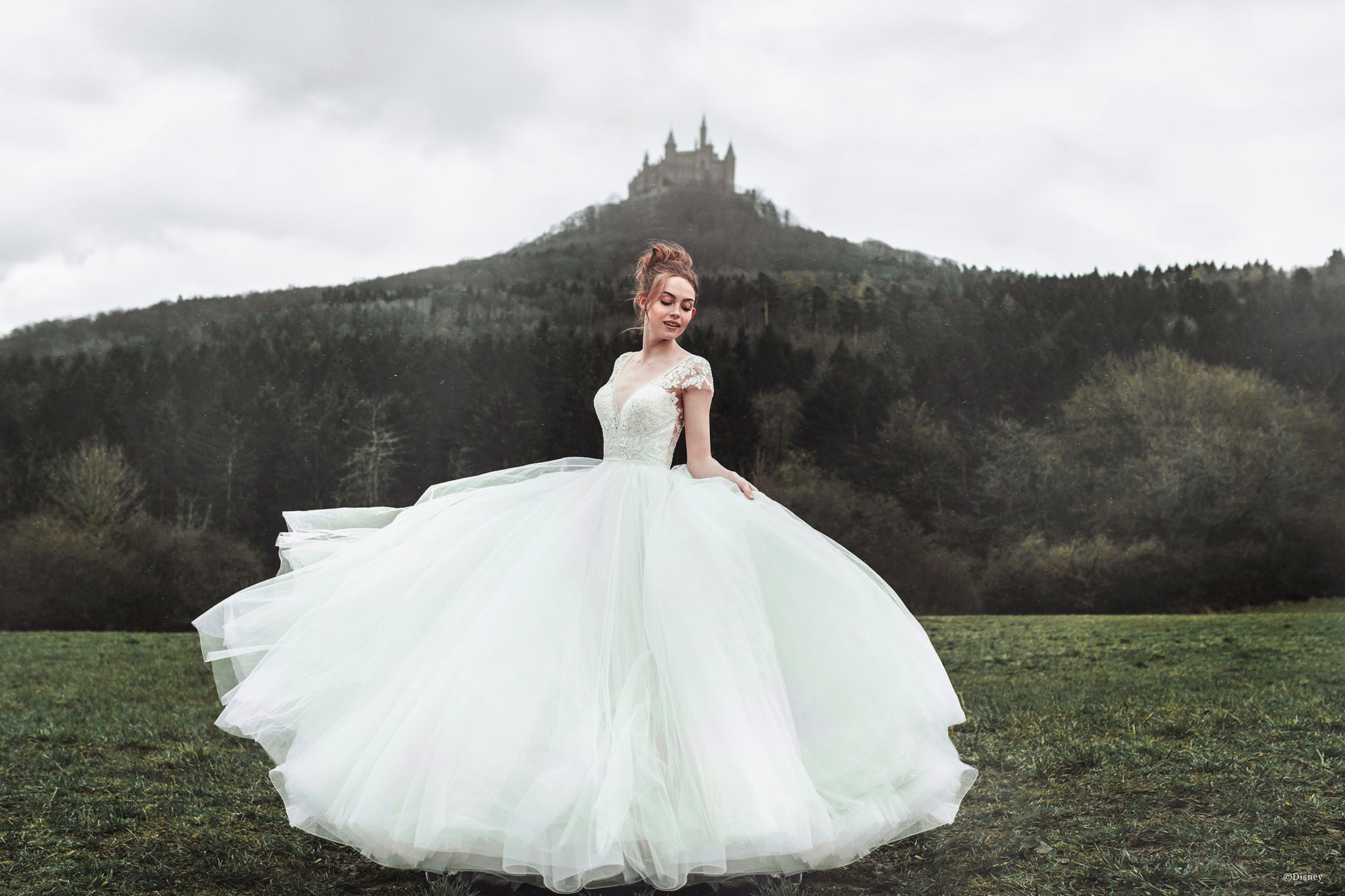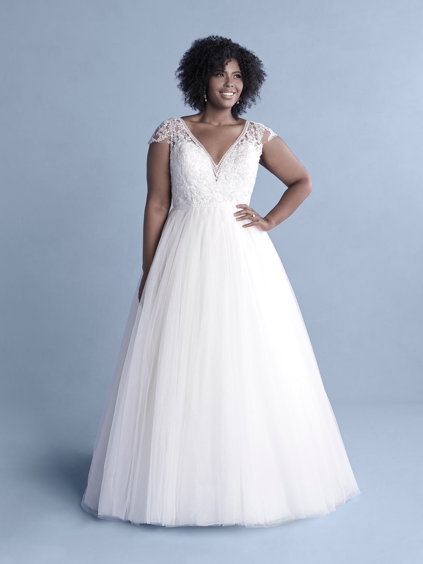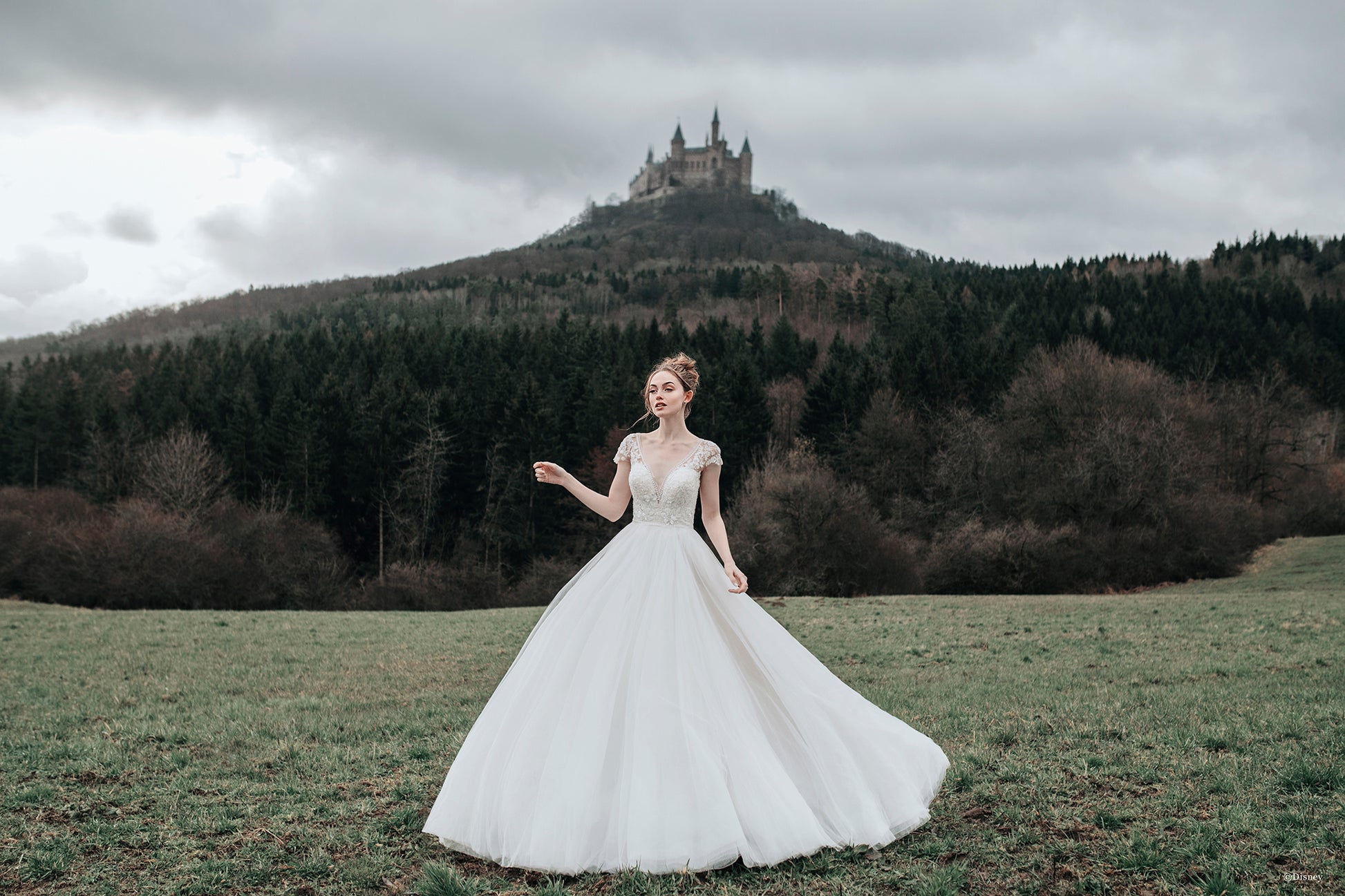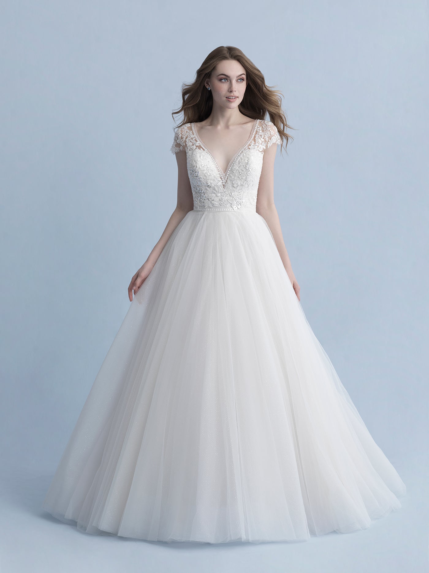 Our Cinderella inspired gown features a dramatic v-shaped bodice adorned with hundreds of crystals, and Alencon lace appliques. Lovely capped sleeves add feminine glamour and the shimmering, sparkling tulle within the skirt illuminates this enchanting ballgown making it transformation ready. Read Less