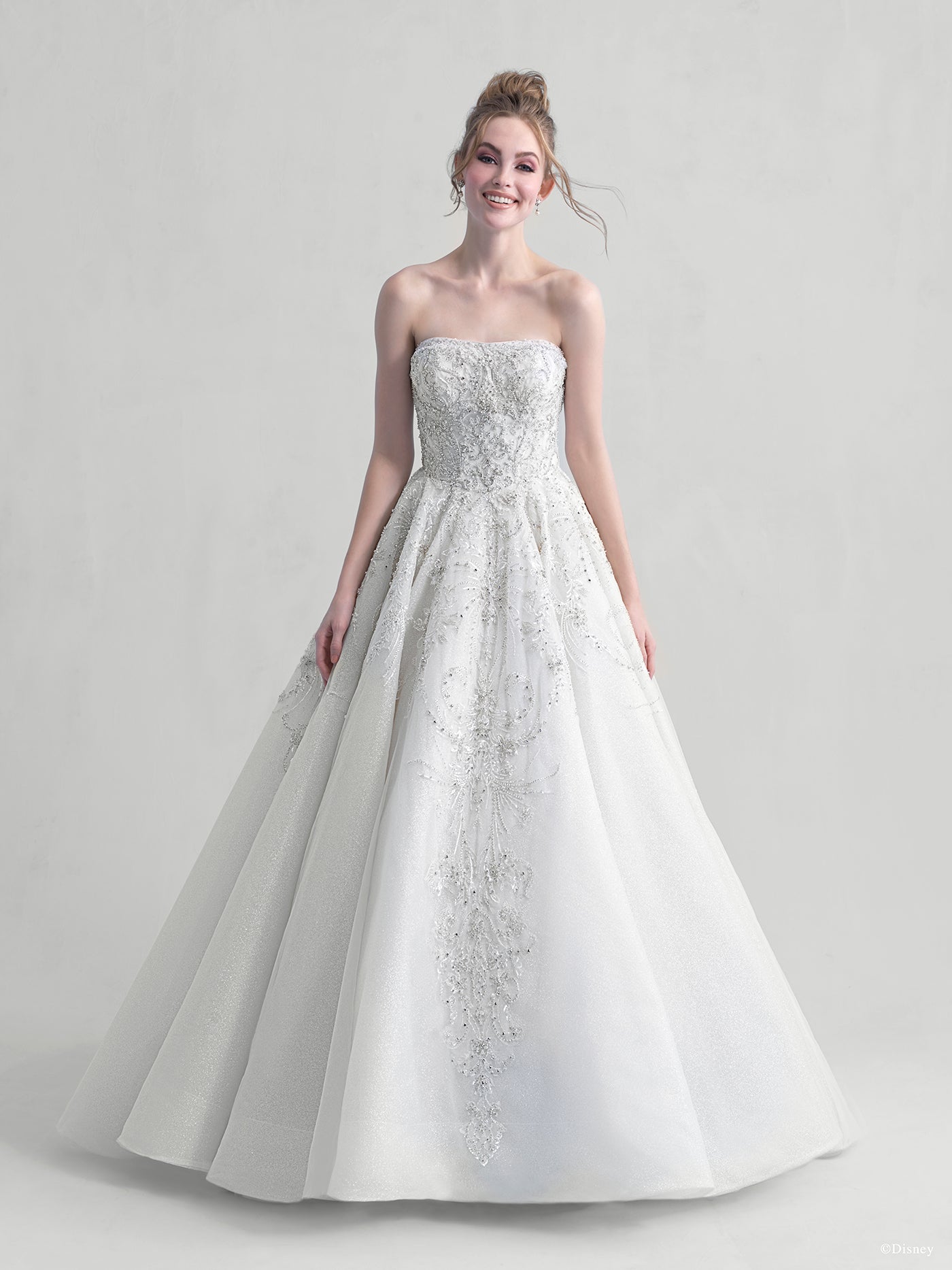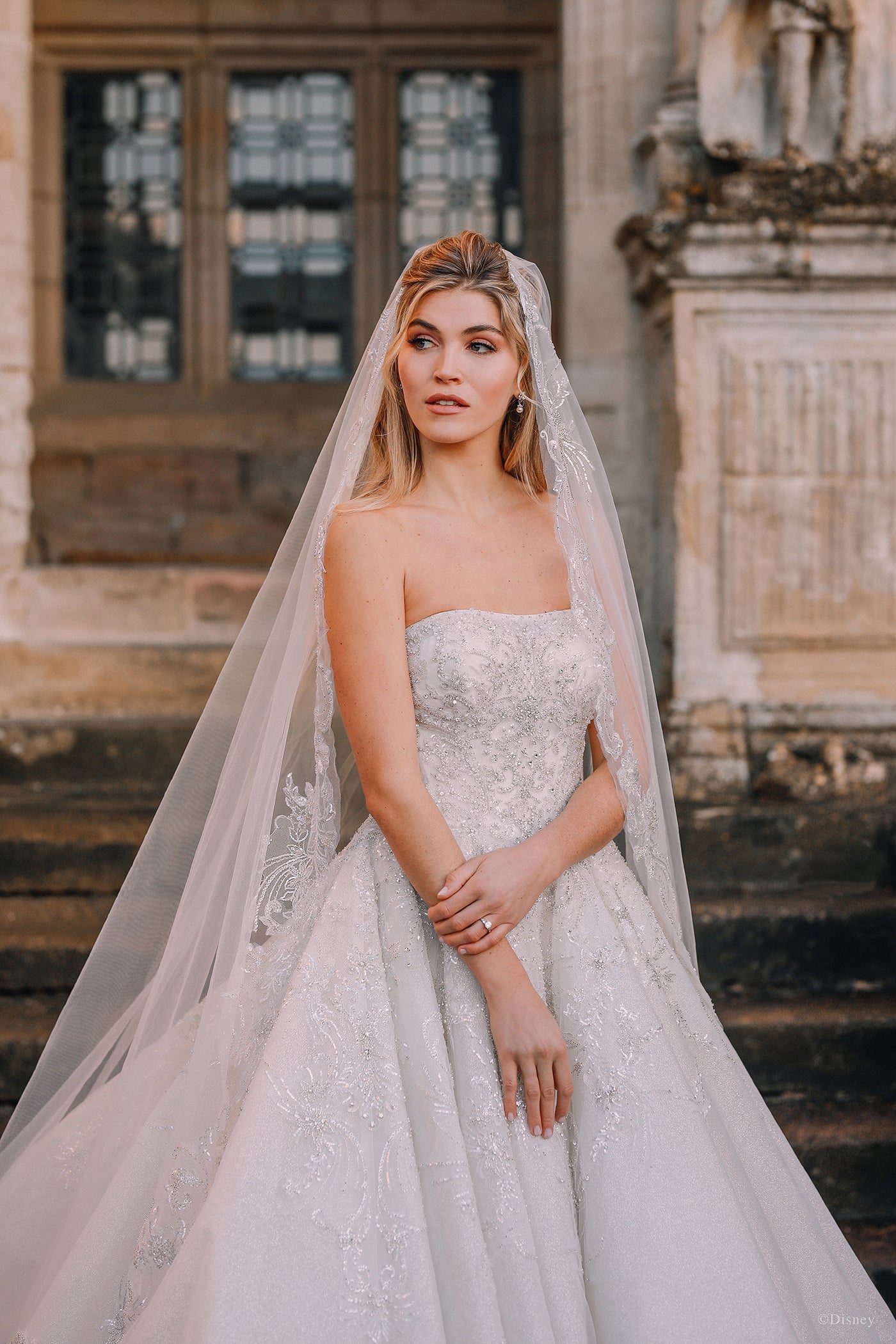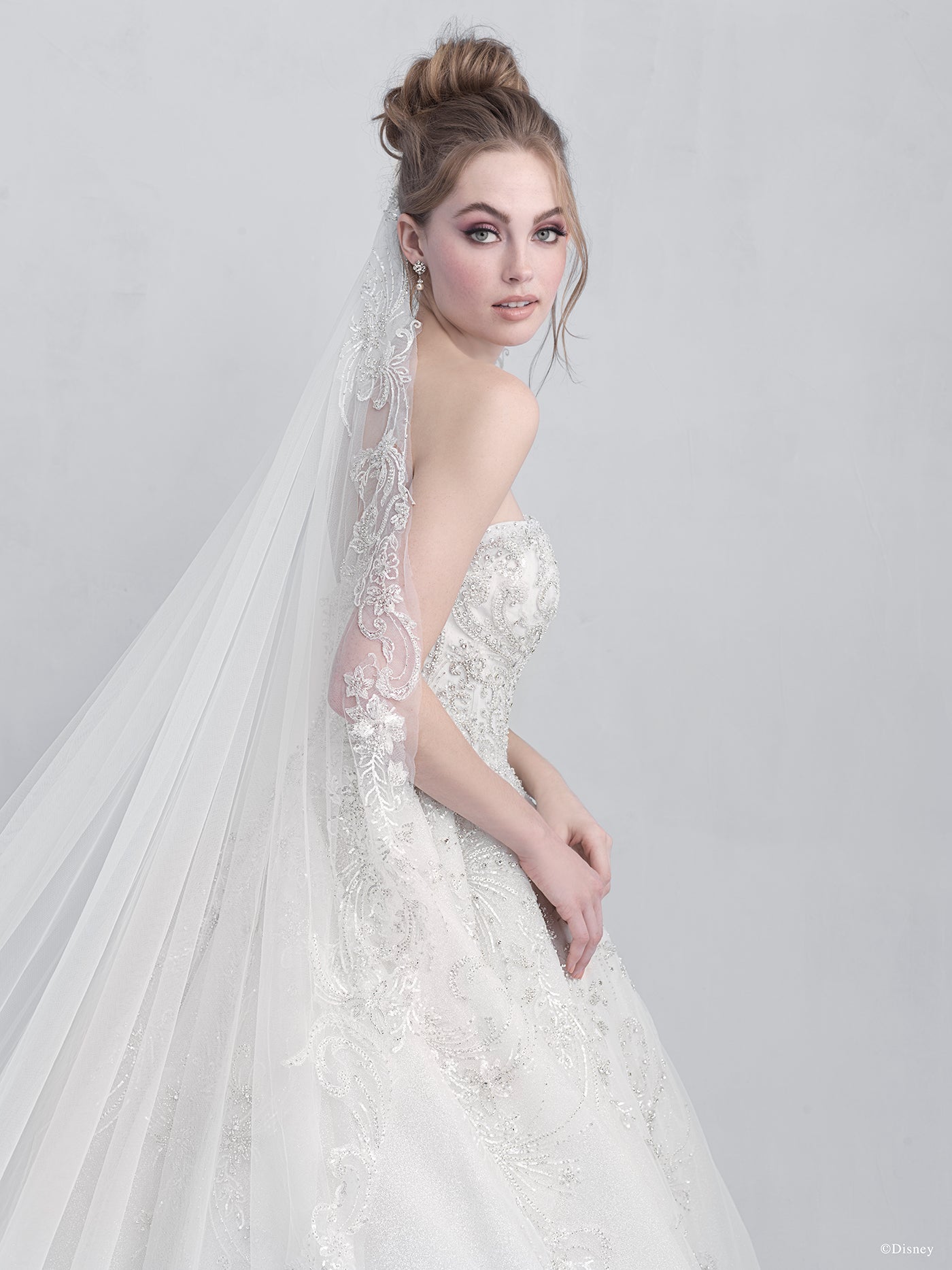 The Cinderella Platinum ballgown is a dream come true! Inspired by Cinderella's magical transformation, this graceful gown is embellished with intricate silver embroidery, delicate crystals adorn a strapless bodice and trail down the full ballgown skirt. All you need to complete the look is a pair of glass slippers! Shown with matching veil, DV03, sold separately. Read Less