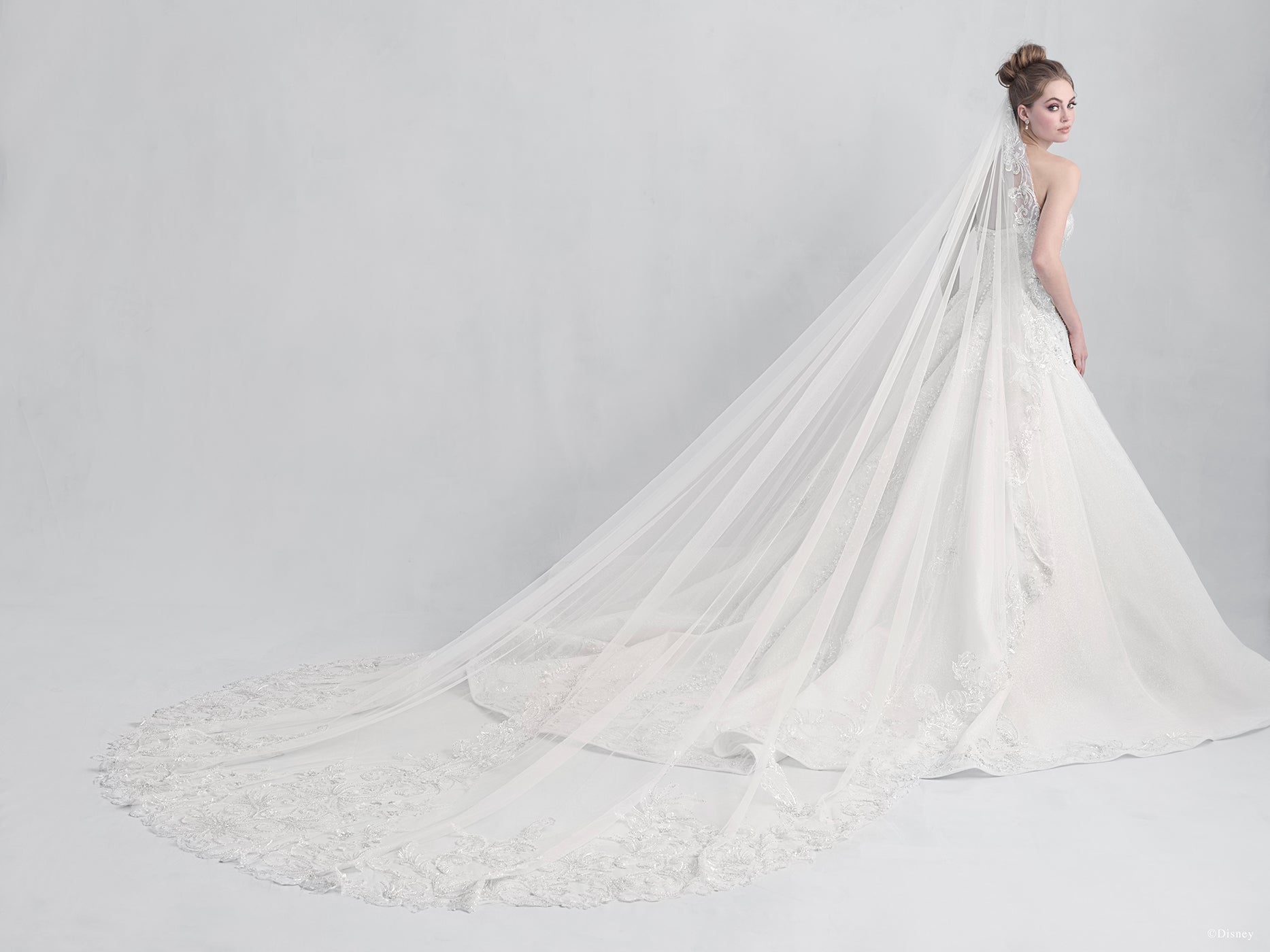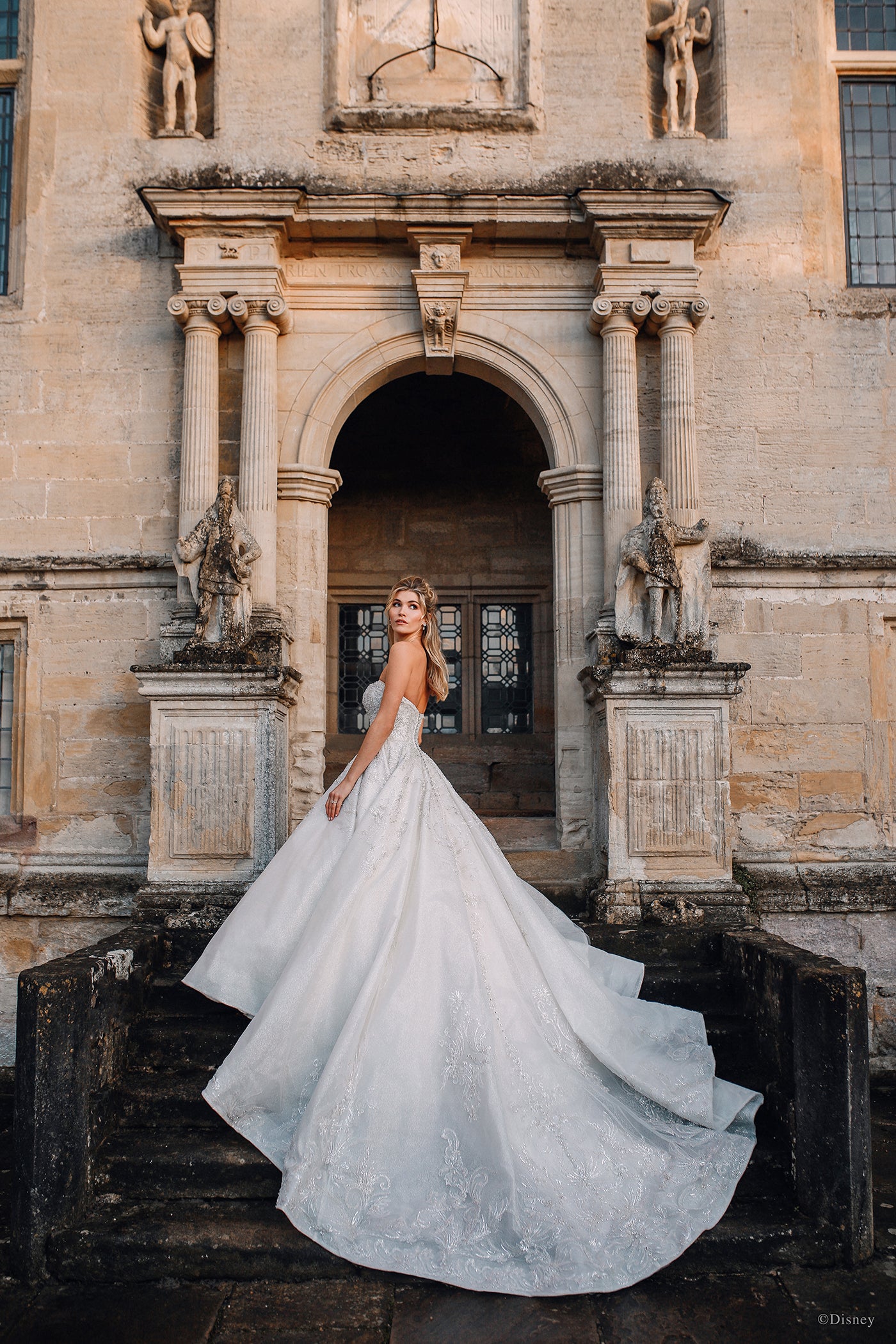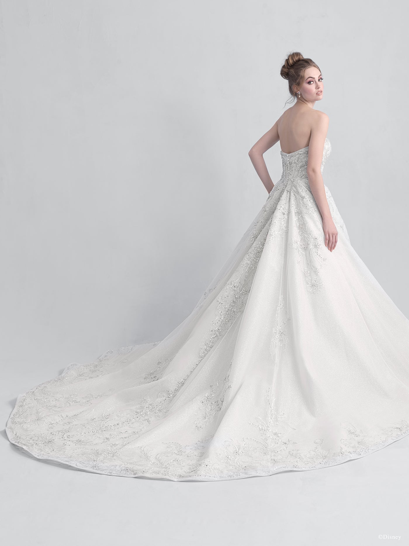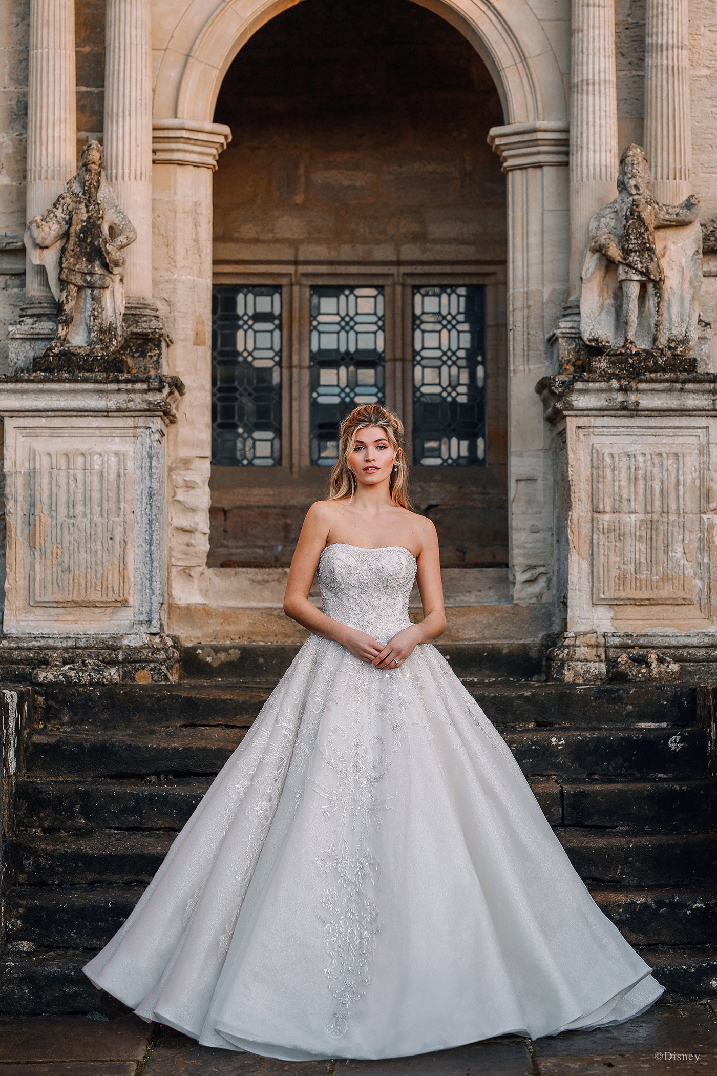 The Cinderella Platinum ballgown is a dream come true! Inspired by Cinderella's magical transformation, this graceful gown is embellished with intricate silver embroidery, delicate crystals adorn a strapless bodice and trail down the full ballgown skirt. All you need to complete the look is a pair of glass slippers! Shown with matching veil, DV03, sold separately. Read Less