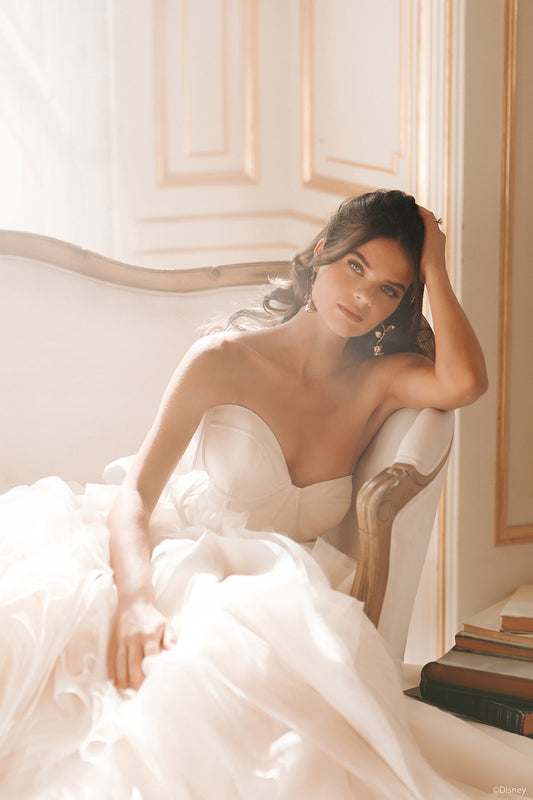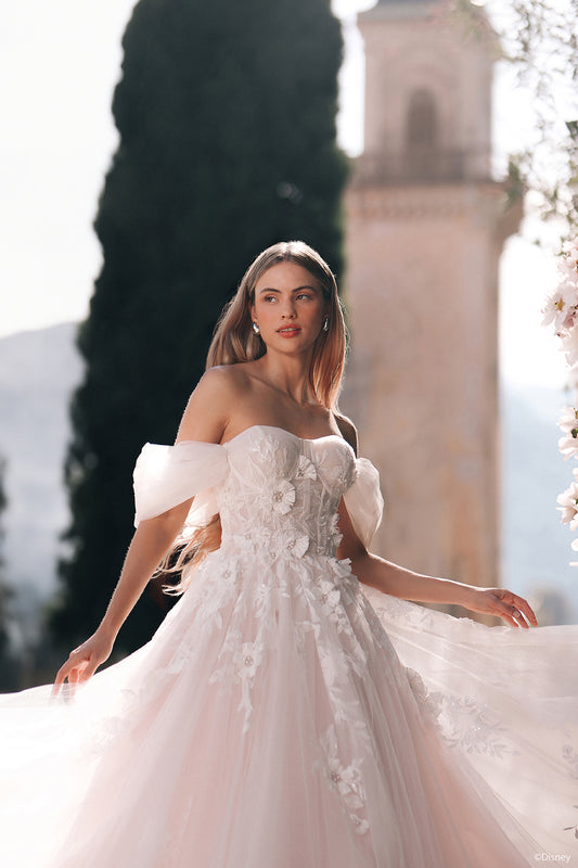Guided by her heart and an open mind, Belle’s journey is one of true love’s transformative power. This stunning ballgown captures that magic with a romantic sweetheart neckline and elegant, strapless silhouette. The detachable off-shoulder sleeves add versatility and a touch of regal charm, while the corset back highlights Belle’s timeless grace and sophistication. With pickup skirt detailing reminiscent of the ballroom scenes from her story, this gown flows with enchanting movement. Perfect for the bride who, like Belle, is ready to follow her heart and embrace her destiny, this dress embodies the beauty and strength that blossoms when loved.